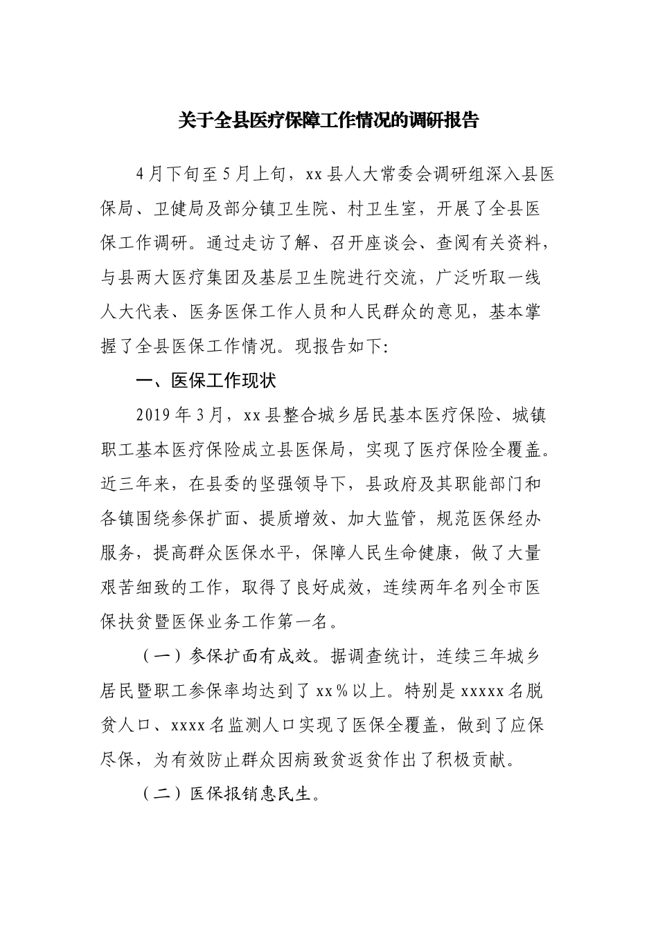 关于全县医疗保障工作情况的调研报告4月下旬至5月上旬,xx县人大常委会调研组深入县医保局、卫健局及部分镇卫生院、村卫生室,开展了全县医保工作调研。通过走访了解、召开座谈会、查阅有关资料,与县两大医疗集团及基层卫生院进行交流,广泛听取一线人大代表、医务医保工作人员和人民群众的意见,基本掌握了全县医保工作情况。现报告如下:一、医保工作现状2019年3月,xx县整合城乡居民基本医疗保险、城镇职工基本医疗保险成立县医保局,实现了医疗保险全覆盖。近三年来,在县委的坚强领导下,县政府及其职能部门和各镇围绕参保扩面、提质增效、加大监管,规范医保经办服务,提高群众医保水平,保障人民生命健康,做了大量艰苦细致的工作,取得了良好成效,连续两年名列全市医保扶贫暨医保业务工作第一名。(一)参保扩面有成效。据调查统计,连续三年城乡居民暨职工参保率均达到了xx%以上。特别是xxxxx名脱贫人口、xxxx名监测人口实现了医保全覆盖,做到了应保尽保,为有效防止群众因病致贫返贫作出了积极贡献。(二)医保报销惠民生。2021年,全县医保为x.x万多人报销了住院医疗费x.xx亿元,为xxxx慢特病人报销xxx.xx万元,门诊xxxxxx人次,报销xxxx.xx万元,并及时拨付全县新冠疫苗接种费用xxxx万元,切实保障了人民群众生命安全。(三)经办体系更完善。医保部门和医疗机构抓经办、优服务,基本建成了县、镇、村三级医保经办服务体系,实现了基本医保、大病保险、医疗救助“一站式结算报销”。(四)监管有力保安全。通过专项检查、第三方抽审检查、飞行检查等手段,综合运用多种措施,严打欺诈骗保行为,监督管理和使用好医保基金“救命钱”。2021年,全县参加城乡居民医疗保险xxxxxx人、筹集资金xxxxx.xx万元,支出xxxxx.xx万元,结余xxx.xx万元;全县职工医疗保险收入xxxx.x万元,支出xxxx.xx万,结余xxxx.xx万元。近两年县医保局扣减不合理医保支出xxx万元,处罚违约金xx.xx万元,维护了医保基金安全。二、存在的主要问题(一)保障能力与需求不对等。城乡医保总体水平和质量与人民日益增长的健康需求之间的差距比较大、矛盾比较突出。一方面基金总额有限、保障能力偏低,需要基金规模与保障水平亟待上涨;另一方面财政保障能力有限、群众近年受疫情影响,收入明显下降,对医保缴费上涨意见比较大,部分未住院的农户主动缴费积极性不高,基层干部催缴医保费难度大。近期还出现全县特困供养人员住院合规费用报销后自费部分及住院期间生活费、护理费无法落实的问题。(三)医保运行机制不完善。部分医保政策不接“地气”,我县采用的按区域人口数进行总额预付住院医保制度简单粗放,有待优化、细化。涉及基层医疗机构的医药目录和诊疗目录不完善,造成基层群众门诊报销不方便、在镇村无法买到特慢病药;现行2011版医疗服务收费项目滞后,诊疗费过低、基层医技人员待遇偏低;大病保险由商业保险公司承办,人为增加中间环节,下拨资金周期长,亟待完善和调整。医保缴费缺乏连续参保的激励机制,群众对无论是否享受医保报销待遇,保费都“一刀切”年年上涨的做法意见比较大。同时,医保监管乏力,监督机制不健全,医保部门和卫健部门监管合力未形成,各自为政,未能形成全方位的联动监管机制。监管人员不足,监管手段单一,监管制度不完备。以事后监管为主,事中监管手段不足,智能审核监控系统功能有待进一步完善,医保基金使用的质量和效率不高。(四)医保服务功能不健全。医保经办服务水平与县委、县政府要求和群众期盼仍然存在差距。医保服务网络不健全,镇卫生院和村卫生室人员严重短缺,部分村医年龄偏大、不会使用电脑,部分村卫生室无法开展医保报销业务。基药的品规相对较少、基层配置不足,医保业务培训偏少,基层群众看病报销仍然感到手续繁琐,门诊报销不够简便,加上医保结算系统运行不畅、不稳定,经办人员业务不熟,基层办理报销业务的便捷化服务不够,使部分群众对服务感到不满意。(五)医保政策宣传不到位。医保政策宣传及对群众教育引导严重不足,宣传方式单一,普及面与覆盖面都不够,政策宣传有盲区。城乡居民医疗保险缴费年年攀升,待遇政策调整过于频...