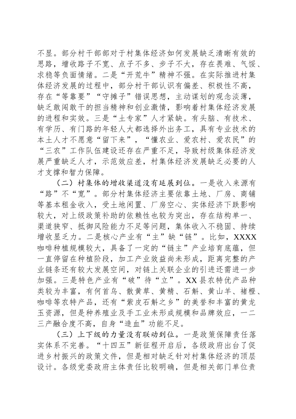 XX镇发展壮大村集体经济的调研报告村集体经济是农村经济的重要组成部分,发展壮大村集体经济不仅是保证基层组织职能正常运转的必然要求,也是改善民生、提供公共福利,推进农村发展的重要抓手。为深入研究如何破解村集体经济发展难题,提高村级集体经济“造血”功能,根据上级部署,XXXX组建调研组,于XX月X日至X月X日,对全乡各村集体经济现状进行调研,通过实地调查、资料收集、座谈交流等方式,广泛听取意见建议,掌握了解XXXX村集体经济发展现状,认真分析研究,对XXXX发展壮大村集体经济探索进行了专题调研,现将有关情况报告如下:一、调研目的通过调研,深入了解掌握目前XXXX集体经济发展的现状、困难及发展思路,全面客观的剖析当前XXXX村集体经济发展特征、发展需求,深刻挖掘一批可复制、可推广的发展壮大村集体经济的典型经验,为其他村(社区)发展壮大村集体经济提出意见建议,进一步加强农村基层政权建设,增强村集体经济组织造血功能,提高村级自我保障和服务群众的能力,为实现XXXX高质量发展提供坚强保障。二、基本情况近年来,XXXX坚持党建引领作用,强建组织体系,按照一村一策,因地制宜制定发展壮大村集体经济计划,细化目标责任,开列时间表和路线图,在发展壮大村级集体经济上下功夫,注重发挥村干部内生力,早谋划、早部署,持续激发农村资源要素活力,村集体经济发展取得了明显成效。截至目前,XXXX村级集体经济入账X万元以上X个,X-X万元X个,X万元以下X个;预计年底,XXX个村(社区)集体经济收入均可达X万元以上。(一)强化组织带动,夯实集体经济“支撑柱”。XXXX以提升组织力为重点,织密建强村党组织体系,着力筑牢乡村振兴战斗堡垒,提升集体经济发展的能力和水平。始终坚持把发展壮大村级集体经济作为基层党建的重点工作任务来抓,将集体经济纳入村党组织书记抓基层党建述职评议重要考核内容,把具体任务细化到村、落实到人,形成“时间倒排、任务倒逼、责任倒追”的落实机制。全面推进村(社区)党组织书记依法担任村居委会主任、集体经济组织负责人全覆盖,推动基层党组织书记“唱主角、挑重担、做示范”。(二)取经变真经,共搭集体经济“一台戏”。一是组织乡村干部到XXX等地考察,学习借鉴发展壮大村集体经济的好经验好做法,转变思想观念、增强内生动力,激发干事创业热情,因地制宜取得村集体经济发展真经。通过深入村组调研,现场谈规划、部署抓落实,与村“两委”班子面对面座谈,广泛听取意见建议,共同研究壮大村级集体经济的好方法、好思路。立足各村优势,科学把握区位条件、资源禀赋和现状基础,深挖优势和潜力,制定“一村一策”,吹响发展壮大村级集体经济“集结号”,奋力实现发展目标。二是将集体经济会议搬到各村现场,坚持在一线汇聚思路,把措施落实在一线,把问题解决在一线,现场谈规划、部署抓落实,找准发展壮大村集体经济突破口,着力打破各自为战、分散发展的传统思维,持续发力打造村集体增收致富“新引擎”,激发村集体经济发展壮大新活力。三、存在问题XX镇多渠道多路径探索发展壮大村级集体经济,但是受地理条件、资源禀赋、发展基础等因素制约,壮大村集体经济成效还不够明显,村集体经济发展水平参差不齐,多数村(社区)集体经济发展基础薄弱的现状仍然存在,还需持续用力。在发展壮大村集体经济过程中,主要原因在于:(一)主力军的作用没有发挥到位。一是“领头羊”效应不显。部分村干部部对于村集体经济如何发展缺乏清晰有效的思路,增收路子不宽、点子不多、步子不大,存在畏难、气馁、求稳等负面情绪。二是“开荒牛”精神不强。在实际推进村集体经济发展的过程中,部分村干部认识有偏差、积极性不高,存在“等靠要”“守摊子”错误思想,主动谋划的观念淡薄,缺乏敢闯敢干的担当精神和创业激情,影响着村集体经济发展的进程和实效。三是“土专家”人才紧缺。有头脑、有技术、有学历、有门路的年轻人大都选择外出务工,具有专业技术的本土人才不愿意“留下来”,“懂农业、爱农村、爱农民”的“三农”工作队伍建设还存在严重不足,导致村级集体经济发展严重缺乏人才,示范效应差,村集体经济发展缺乏...