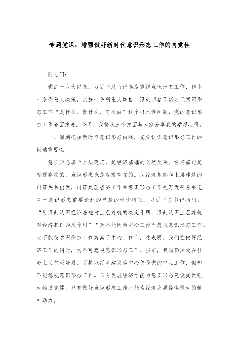 专题党课:增强做好新时代意识形态工作的自觉性同志们:党的十八大以来,习近平总书记高度重视意识形态工作,作出一系列重大决策,实施一系列重大举措,深刻回答了新时代意识形态工作“是什么、做什么、怎么做”这个根本性问题,党的意识形态工作全面推进。今天,我将从三个方面与大家分享我的学习心得。一、深刻把握新时期意识形态内涵,充分认识意识形态工作的极端重要性意识形态属于上层建筑,是经济基础的必然反映。经济基础是客观存在的,意识形态也是客观存在的。从经济基础和上层建筑的辩证关系出发,辩证处理经济工作和意识形态工作是习近平总书记关于意识形态重要论述的显著的理论特征。习近平总书记指出,“要深刻认识经济基础对上层建筑的决定作用,深刻认识上层建筑对经济基础的反作用”“既不能因为中心工作而忽视意识形态工作,也不能使意识形态工作游离于中心工作”。这表明,我们在做好经济工作的同时,切不可忽视意识形态工作。当前,我国仍然处在社会主义初级阶段,坚持以经济建设为中心仍是党的中心工作,但却不能忽视意识形态工作。只有发展经济才能为意识形态建设提供强大物质支撑,只有做好意识形态工作才能为经济发展提供强大的精神动力。(一)充分体会时代意识形态工作的创新发展。我们党历来高度重视意识形态工作,毛泽东同志就意识形态工作的统领作用深刻指出,“政治工作是一切经济工作的生命线”。邓小平同志把意识形态工作与党和国家事业的前途命运联系起来,认为它“关系到我们的事业将由什么样的一代人来接班、关系到党的命运和前途”。江泽民同志结合意识形态斗争实际指出,“思想宣传阵地,社会主义思想不去占领,资本主义思想就必然会占领”。胡锦涛指出:“世界范围内的资本主义和社会主义在意识形态领域的斗争和较量是长期的复杂的,有时是非常尖锐的。”习近平总书记进行创新发展指出,“一个政权的瓦解往往是从思想领域开始的,政治动荡、政权更迭可能在一夜之间发生”,突出了意识形态问题对于政权的重要性。(二)深刻把握新时代意识形态工作极端重要的政治地位。习近平总书记指出,意识形态工作是党的一项极端重要的工作,“事关党的前途和命运,事关国家长治久安,事关民族凝聚力和向心力”。这一重要论述突出了意识形态工作的重要性。我国是一个统一的多民族国家,意识形态问题是国家稳定和长治久安的重要因素。立足新时代,习近平总书记深刻把握意识形态领域动向和发展趋势,从极端重要和“三个事关”的角度把意识形态工作同党、国家和民族的前途命运紧密相连,体现了党对意识形态工作的认识达到一个崭新的高度。(三)准确认识新时代意识形态工作的政治作用。党的十八大以来,习近平总书记不断深化对意识形态工作规律的认识,立足中华民族伟大复兴战略全局和世界百年未有之大变局的宏阔视野统筹意识形态工作,提出“意识形态工作是为国家立心、为民族立魂的工作”的重要观点。进入新时代,我国面临着世情、国情、党情的深刻变化,表现在意识形态领域就是社会思想观念和价值取向日趋活跃、主流与非主流并存、社会思潮纷纭激荡。如何巩固马克思主义在意识形态领域的指导地位,如何培育和践行社会主义核心价值观,如何促进国家和民族更好发展等诸多问题迫切需要意识形态工作给予回答。“为国家立心、为民族立魂”精准阐释了意识形态工作对于国家强大、民族发展的重要作用,蕴含着深刻的政治自觉意识。(四)深刻领悟新时代意识形态工作的基本政治特征。习近平总书记指出:“我们必须把意识形态工作的领导权、管理权、话语权牢牢掌握在手中,任何时候都不能旁落,否则就要犯无可挽回的历史性错误。”关于加强党对意识形态工作的全面领导,习近平总书记从以下几个方面进行了阐述:强化党对新媒体管理,旗帜鲜明坚持党管宣传、党管媒体的原则,无论是广播电视、新闻出版、还是社科理论、文艺艺术单位,都要在党的领导之下,不存在舆论飞地;增强阵地意识,守住“红色地带”、管控“黑色地带”、争取“灰色地带”向“红色地带”转化;努力提升意识形态工作队伍的政治素养。习近平总书记谆谆教导新时代党员干部要以政治家的标准严格要求、以...
