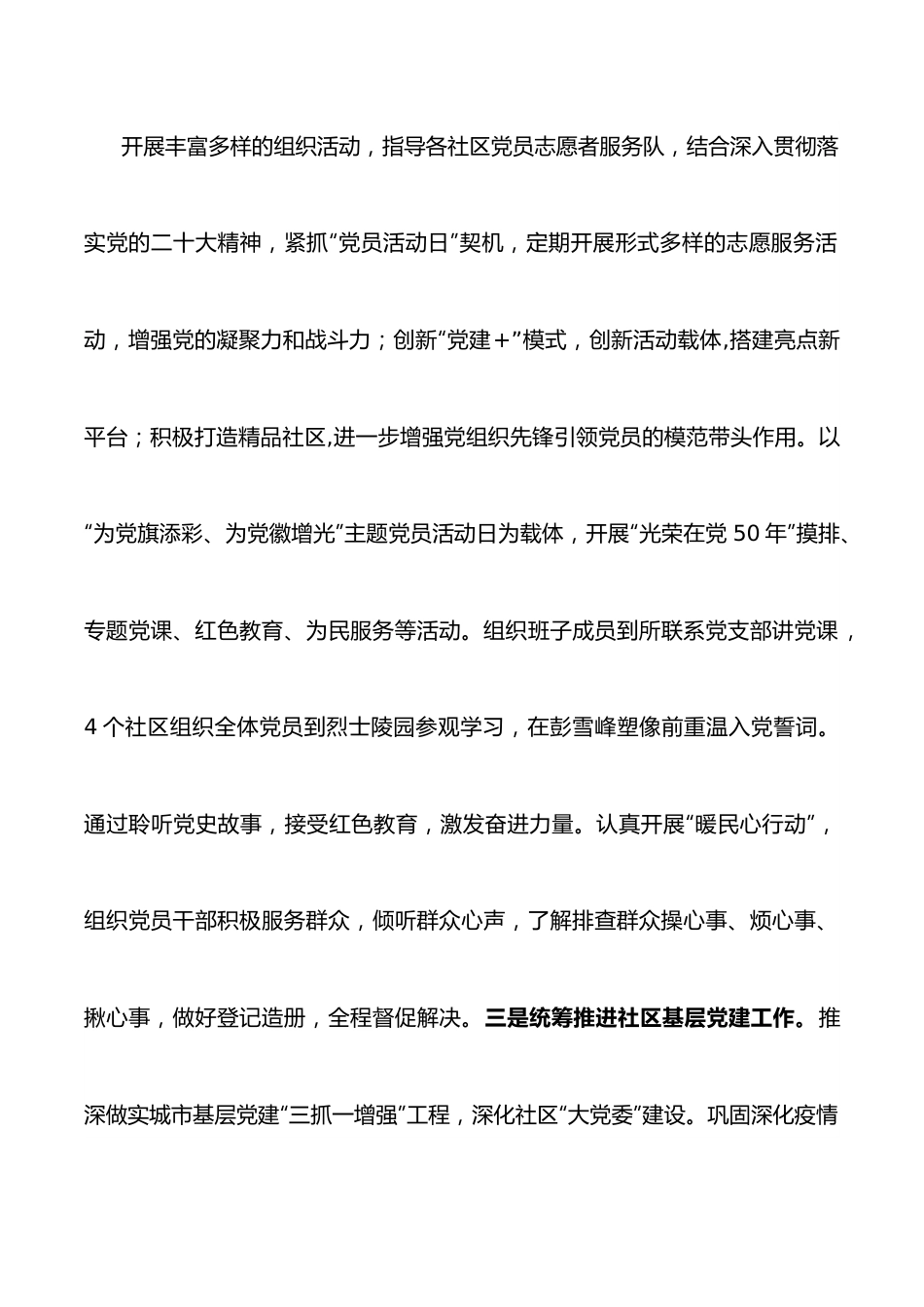 街道2022年工作总结及2023年工作谋划*街道自成立以来,在县委、县政府的坚强领导下,*街道始终坚持以习近平新时代中国特色社会主义思想为根本指引,深入学习宣传贯彻党的二十大精神,统筹协调稳增长,建管并举优环境,改善民生增福祉,维护稳定促和谐,全力推动各项事业稳中向好。一、2022年重点工作开展情况(一)抓党的建设力促行稳致远。注重理论学习,强化政治引领。利用理论学习中心组学习、党员活动日、周一集中学习等形式,深入学习贯彻习近平新时代中国特色社会主义思想、党的二十大等。精心组织学习习近平《论中国共产党历史》《习近平在新时代中国社会主义思想三十讲》等,在全区上下掀起了浓厚的学习热潮,切实提高政治站位,衷心拥护“两个确立”、忠诚践行“两个维护”。聚焦组织功能,夯实执政之基:一是建强基层基础。认真落实基层党建“三个清单”,持续抓好各支部“三会一课”、党员活动日、党员政治生日等制度的落实。严格规范党员发展、党费收缴、“三会一课”等基础工作。谋划“旗牌星”联动工程、“五旗四牌三星”创评,将创评工作作为统领基层工作的总抓手,推动基层党组织发挥战斗堡垒作用。认真做好“皖美红色物业”示范小区打造,将支部建在小区里,打通为人民服务最后一米。严格根据党员发展流程,不断提升党建工作规范化制度化水平,截止目前,已转正党员8名,接收预备党员2名。二是加强载体活动建设。开展丰富多样的组织活动,指导各社区党员志愿者服务队,结合深入贯彻落实党的二十大精神,紧抓“党员活动日”契机,定期开展形式多样的志愿服务活动,增强党的凝聚力和战斗力;创新“党建+”模式,创新活动载体,搭建亮点新平台;积极打造精品社区,进一步增强党组织先锋引领党员的模范带头作用。以“为党旗添彩、为党徽增光”主题党员活动日为载体,开展“光荣在党50年”摸排、专题党课、红色教育、为民服务等活动。组织班子成员到所联系党支部讲党课,4个社区组织全体党员到烈士陵园参观学习,在彭雪峰塑像前重温入党誓词。通过聆听党史故事,接受红色教育,激发奋进力量。认真开展“暖民心行动”,组织党员干部积极服务群众,倾听群众心声,了解排查群众操心事、烦心事、揪心事,做好登记造册,全程督促解决。三是统筹推进社区基层党建工作。推深做实城市基层党建“三抓一增强”工程,深化社区“大党委”建设。巩固深化疫情防控网格化成果,将原有小区、散居点临时党支部转化为党员先锋队,就近就地发挥作用,落实网格化管理,优化网格设置,整合党建、综治、城管、信访等各类网格,实现“多网融合”,在城市小区成立6个党支部。四是做实群团共建。围绕“党建带群建,群团共建”的工作目标,通过党群联动,着力构建以党组织为核心,共青妇为联动的党群共建工作新格局。顺利召开街道第一次妇女代表大会,选举产生街道第一届妇女大会执委会成员15名,妇联主席1名,兼职副主席3名。坚持以党的最新思想引领广大妇女同胞积极奉献,贡献巾帼力量。认真做好毕业生团员转接工作,以主题团日活动为抓手,开展线上线下相结合学习活动,认真学习传达习近平总书记在共青团成立100周年大会上的讲话精神,组织广大团员积极参加抗疫工作,为打赢抗击疫情阻击战增添澎湃青春浪潮。(二)抓疫情防控夯实发展基础。一是全面打好疫情防控“阻击战”。街道第一时间成立疫情防控指挥部,全面动员、全面部署,以时不我待的精神、分秒必争的行动全方位投身于疫情防控阻击战。街道全体班子成员带领“三办四中心”工作人员及63名社区“两委”、小组长对小区实行网格化包保。1236名党员干部积极响应、奔赴一线,全力以赴、尽锐出战,从严从紧从快配合落实流调溯源、隔离转运、核酸检测、环境消杀等各项防控措施。街道上下运作有序、作战有力,形成齐心协力、众志成城抗击疫情的强大合力。建立便民检测点5个,截止目前,一共开展57轮区域核酸检测,核酸检测累计713612人次。二是持续加强社区防控工作。继续补充完善前期“敲门行动”信息台账,对辖区内省外人员再摸排、再劝导。7月10日以来,对在外返泗1016人落实集中隔离、居家隔离、居家健康监测、三天两检、安装门磁等措施,建...