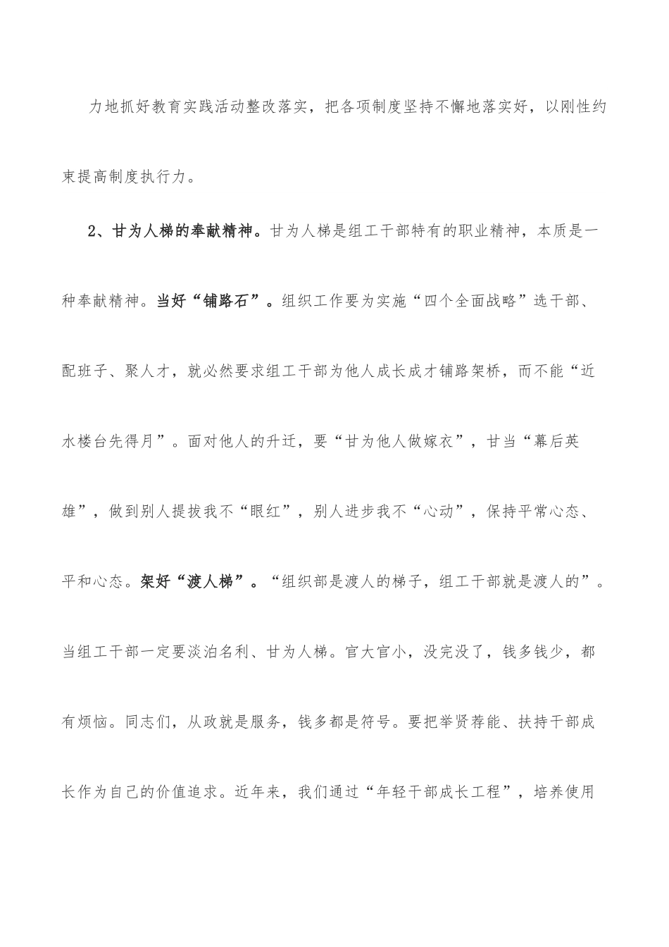 在2022年全市组工干部培训班结业仪式上的讲话同志们:经过三天紧张忙碌的集中培训,这次组工干部培训班就要圆满结束了。培训期间,大家按照基本职责、基本知识、基本方法、基本规范等“四个基本”要求,分别对组工干部素质、组织工作理论、基本业务知识进行了系统学习。刚才,X位同志作了交流发言,讲的都很好。大家普遍反映,学有所获、学有所得。培训结业既是终点更是起点,如何充分运用培训成果,提升自身素质和履职能力,做“事业有为、清廉为官”的组工干部,我谈三点体会,与同志们共勉。第一,把事业当家业人,总是要有一点精神的。把事业当家业,体现的是一种主人翁精神。组工干部的主人翁精神体现在哪里?体现在三个方面。1、契而不舍的奋斗精神。组织工作任务重、要求高,双休不休息是常有的事。面对这种情况,有的同志产生了疲倦心理、厌战情绪;有的同志工作不上心、做事不尽心;有的同志敷衍塞责、应付了事。组织上把大家放到组织工作岗位,既是对大家的信任,更是对大家的考验。作为组工干部要有激情。要始终保持奋发向上、锐意进取的精神状态,把工作当事业,肯花时间研究问题、肯动脑筋琢磨工作,确保多出成品、出好精品。对组织工作要有偏爱。“工作虐我千百遍,我待工作如初恋”,这虽然是调侃的玩笑话,但也能从中体会出一种锲而不舍的奋斗精神。要安下心来、专心致志、迷恋至深,爱我所爱,选我所选,把事业当家业,待工作如初恋,扎扎实实把每一项工作做好。抓具体工作要有韧劲。要经常抓、反复抓、持久抓,不达目的决不罢休。比如抓作风建设,现在就是要持续用力地抓好教育实践活动整改落实,把各项制度坚持不懈地落实好,以刚性约束提高制度执行力。2、甘为人梯的奉献精神。甘为人梯是组工干部特有的职业精神,本质是一种奉献精神。当好“铺路石”。组织工作要为实施“四个全面战略”选干部、配班子、聚人才,就必然要求组工干部为他人成长成才铺路架桥,而不能“近水楼台先得月”。面对他人的升迁,要“甘为他人做嫁衣”,甘当“幕后英雄”,做到别人提拔我不“眼红”,别人进步我不“心动”,保持平常心态、平和心态。架好“渡人梯”。“组织部是渡人的梯子,组工干部就是渡人的”。当组工干部一定要淡泊名利、甘为人梯。官大官小,没完没了,钱多钱少,都有烦恼。同志们,从政就是服务,钱多都是符号。要把举贤荐能、扶持干部成长作为自己的价值追求。近年来,我们通过“年轻干部成长工程”,培养使用了一批优秀年轻干部;通过每年招聘选调生、公务员、大学生村官,为基层补充了大量新鲜血液;通过引进研究生,为仙桃储备了一批高素质人才;通过选派干部到基层一线和新疆挂职锻炼,增加干部“苦经历”,使一批有潜力的年轻干部在“墩苗压担”中迅速成长。做好“老黄牛”。有人形容组工干部,“拿着包月的工资,干着不计流量的活儿”。组工干部常常是“孤灯伴夜雨、瘦影伴无眠”,加班加点是家常便饭,通宵达旦是常有的事。为了做好组织工作,大家牺牲很多,付出很多,这种任劳任怨、埋头干事的“老黄牛”精神值得肯定,应该点赞。3、和谐共事的团结精神。团结出形象,和谐出干部。要分工不分家。要牢固树立“一盘棋”思想,既对自己的工作敢于负责,又对其他工作支持配合,不能“各吹各的号,各唱各的调”。特别是对于中心工作,突发事情,要主动参与,积极配合,不能一推了之。要补台不拆台。由于个人阅历不同、看问题角度不同,对工作有不同意见、不同看法,这很正常。但是少数单位个别同志因为意见不一,就对同志有看法、有隔阂,甚至互不买账,背后相互指责,这很不好。俗话说,人心齐,泰山移。要胸怀大度、海纳百川,多换位思考、多互相支持,共同把事情做好。要交心不多心。同事之间交心谈心,是交流思想、形成共识的好方法。去年,在教育实践活动中,各级领导班子和党员干部通过深入交心谈心,道出了心声、说出了真话,融洽了感情,和谐了氛围,为高质量开好专题民主生活会奠定了良好基础。大家平时要多谈心、多交心,对他人提出的意见建议,要认真倾听、虚心接受。第二,凭业绩用干部以成败论英雄,凭业绩用干部。一个干部的能力怎样?如何创造...