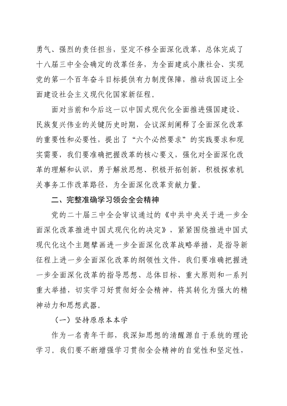 学习贯彻二十届三中全会精神研讨发言材料党的二十届三中全会,是在全面建设社会主义现代化国家全面推进中华民族伟大复兴的关键时期召开的一次十分重要的会议。会议从实践经验和现实需要出发,聚焦进一步全面深化改革、推进中国式现代化问题,锚定了改革目标,阐明了改革原则,部署了重大改革举措,为我们指引了工作目标、明确了奋斗方向、提供了根本遵循。作为机关事务系统的一名年轻干部,我将把学习贯彻全会精神作为当前和今后一个时期的重要政治任务,切实把思想和行动统一到全会精神上来,以改革创新精神积极推动机关事务工作高质量发展。一、深刻认识全面深化改革的重大意义围绕党的中心任务谋划和部署改革,是党领导改革开放的成功经验。党的二十届三中全会,围绕全面深化改革、推进中国式现代化进行科学谋划和部署,是党的十八届三中全会以来全面深化改革的实践续篇,也是新征程推进中国式现代化的时代新篇。会议深入总结了我们党坚持改革开放的历史经验,重点回顾了十八届三中全会以来,以习近平同志为核心的党中央团结带领全党全军全国各族人民,以伟大的历史主动、巨大的政治勇气、强烈的责任担当,坚定不移全面深化改革,总体完成了十八届三中全会确定的改革任务,为全面建成小康社会、实现党的第一个百年奋斗目标提供有力制度保障,推动我国迈上全面建设社会主义现代化国家新征程。面对当前和今后这一以中国式现代化全面推进强国建设、民族复兴伟业的关键历史时期,会议深刻阐释了全面深化改革的重要性和必要性,提出了“六个必然要求”的实践要求和现实需要,我们要准确把握改革的核心要义,强化对全面深化改革的理解和认识,勇于解放思想、积极开拓创新,积极探索机关事务工作改革路径,为全面深化改革贡献力量。二、完整准确学习领会全会精神党的二十届三中全会审议通过的《中共中央关于进一步全面深化改革推进中国式现代化的决定》,紧紧围绕推进中国式现代化这个主题擘画进一步全面深化改革战略举措,是指导新征程上进一步全面深化改革的纲领性文件,我们要准确把握进一步全面深化改革的指导思想、总体目标、重大原则和一系列重大举措,切实学习好贯彻好全会精神,将其转化为强大的精神动力和思想武器。(一)坚持原原本本学作为一名青年干部,我深知思想的清醒源自于系统的理论学习。我们要不断增强学习贯彻全会精神的自觉性和坚定性,坚持原原本本学习全会的精神,逐条逐句研读《决定》的内容,深刻理解每一个重要概念、每一个重要部署、每一个重要举措,准确把握全会提出的新思想新观点新要求,切实增强全面深化改革的信心和决心,增强推动改革的责任感和使命感。(二)坚持融汇贯通学要坚持一体贯彻践行见效,把学习贯彻全会精神,与学习贯彻党的二十大精神结合起来,与学习贯彻习近平总书记关于机关事务工作的重要指示精神结合起来,与习近平总书记对青年干部的关怀关切结合起来,找准机关事务工作在全面深化改革中的着力点,找准青年干部在推动机关事务改革中的发力点,形成强大的思想自觉和行动自觉。(三)坚持联系实际学学习贯彻党的二十届三中全会精神,要坚持联系实际,既要在实践中不断加深对全会精神的理解和感悟,更加准确地把握其深层含义、理解其思想伟力,汲取更多的智慧和力量,也要把全会精神的实践要求落实到工作当中去,努力把学习成果转化为做好机关事务工作的能力,不断提升政策水平、业务能力和服务意识。三、全面深入贯彻落实全会精神学习党的二十届三中全会精神,最终的落脚点在于用全会精神指导实践,按照既定的目标不懈奋斗、久久为功,按期完成改革任务,向党和人民交上一份满意的答卷。(一)坚定改革决心改革从来都不是一帆风顺的,面对思想观念的束缚、利益固化的藩篱、体制机制的弊端,我们必须要坚定改革决心,敢于突进深水区,敢于打破旧观念,以新思想引领新时代改革开放。我们要坚持问题导向,着力破解机关事务工作高质量发展中存在的障碍和难题,坚定不移把改革任务落到实处、抓出成效,以机关事务工作的改革创新引领地区的改革发展,努力实现党的二十届三中全会擘画的中国式现代化波澜壮阔的广阔前景。(二)抓好改革落实...