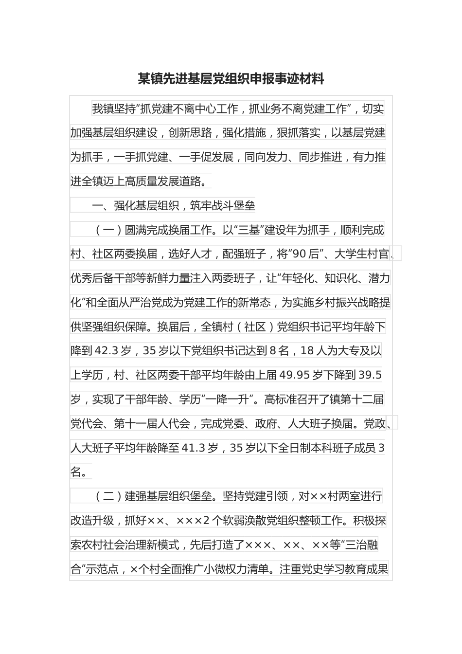 某镇先进基层党组织申报事迹材料我镇坚持“抓党建不离中心工作,抓业务不离党建工作”,切实加强基层组织建设,创新思路,强化措施,狠抓落实,以基层党建为抓手,一手抓党建、一手促发展,同向发力、同步推进,有力推进全镇迈上高质量发展道路。一、强化基层组织,筑牢战斗堡垒(一)圆满完成换届工作。以“三基”建设年为抓手,顺利完成村、社区两委换届,选好人才,配强班子,将“90后”、大学生村官、优秀后备干部等新鲜力量注入两委班子,让“年轻化、知识化、潜力化”和全面从严治党成为党建工作的新常态,为实施乡村振兴战略提供坚强组织保障。换届后,全镇村(社区)党组织书记平均年龄下降到42.3岁,35岁以下党组织书记达到8名,18人为大专及以上学历,村、社区两委干部平均年龄由上届49.95岁下降到39.5岁,实现了干部年龄、学历“一降一升”。高标准召开了镇第十二届党代会、第十一届人代会,完成党委、政府、人大班子换届。党政、人大班子平均年龄降至41.3岁,35岁以下全日制本科班子成员3名。(二)建强基层组织堡垒。坚持党建引领,对××村两室进行改造升级,抓好××、×××2个软弱涣散党组织整顿工作。积极探索农村社会治理新模式,先后打造了×××、××、××等“三治融合”示范点,×个村全面推广小微权力清单。注重党史学习教育成果转化,以“我为群众办实事”为落脚点,推进“开门一件事”活动,新任村“两委”班子完成街道亮化、改善供水设施、老年人免费体检等承诺事项30余个。2021年新发展党员39人,认真开展违规违纪党员排查工作,排查2012年以来新发展、转入党员档案453份。青年人才入库达180人,后备干部80多人,并及时充实、发掘政治觉悟高、服务意识和领导能力强的青年,确保了“青年人才库”、后备干部队伍动态管理,充满活力。(三)抓牢意识形态工作。坚持政治导向,突出抓好意识形态领域工作,引导镇村党员严守政治纪律、组织纪律和宣传纪律,落实每月一次理论中心组学习制度。镇党委及时对党史学习教育活动动员部署,组建了宣讲团,分组深入村、社区开展宣讲,开展习近平新时代中国特色社会主义思想进社区、进农村宣讲活动。在省市媒体刊发特色经验做法17篇,利用公众号、微信群围绕党史教育、疫情防控等传播舆论正能量,弘扬社会主旋律。同时,严格管控疫情期间宗教活动,常态化监管××、××等宗教场所,确保了宗教活动依法依规。二、突出党建引领,推进高质量发展(一)发挥党建引领,应对疫情防控。镇党委提高政治站位,实行常态化防控,建立镇村干部网格化、社区划分片区的管理模式,充分发挥党员、志愿者作用,全面细致摸排,严格落实防控措施,坚决打好疫情防控阻击战。组建检查站60多个,发动党员、积极分子等400多人参与执勤,严格落实扫码、登记、测温等措施,切断病毒传播渠道。及时跟上全国疫情防控工作形势,主动应对突发疫情,筑牢疫情防控基层防线。以信息登记卡、流动公交车等方式顺利完成三次全民核酸检测任务。采取精准防控措施积极应对突发疫情,××等13个村、小区核酸检测2万多人次。以网格化方式推进疫苗接种工作,截止2022年1月底,3岁以上疫苗接种人群已达到常住人口117%以上,加强针接种约3.9万人。(二)发挥党建引领,促进乡村振兴。坚持“党建引领,全面发展”工作理念,推进党建与中心工作深度融合,为实现乡村振兴、助推高质量发展注入强大“红色动力”。一是全力做好项目供地保障。我镇立足实际,结合县城所在地区位优势,扎实开展县城更新行动。围绕全县“三环六片区”规划,为××县新兴产业园做好征地拆迁工作。列出拆迁工作重点、建立台账,分步骤、分批次稳妥推进××、××等四个区域拆迁改造。先从××村入手,一户不漏、逐个研究,基本完成××评估,并拆除了道路沿线多处有碍观瞻的养殖场、铁路看护房等。二是精准服务企业发展。实行班子成员包联项目机制,精准化服务,完成××等项目收储土地500多亩,××项目占地清表350亩。协助××企业建成占地300多平方米的农产品展示中心,拓宽农产品销售渠道和市场空间,为乡村振兴提供持续动力。三是扎实推进县城建设。××路、××顺利贯通,县城路网不断...