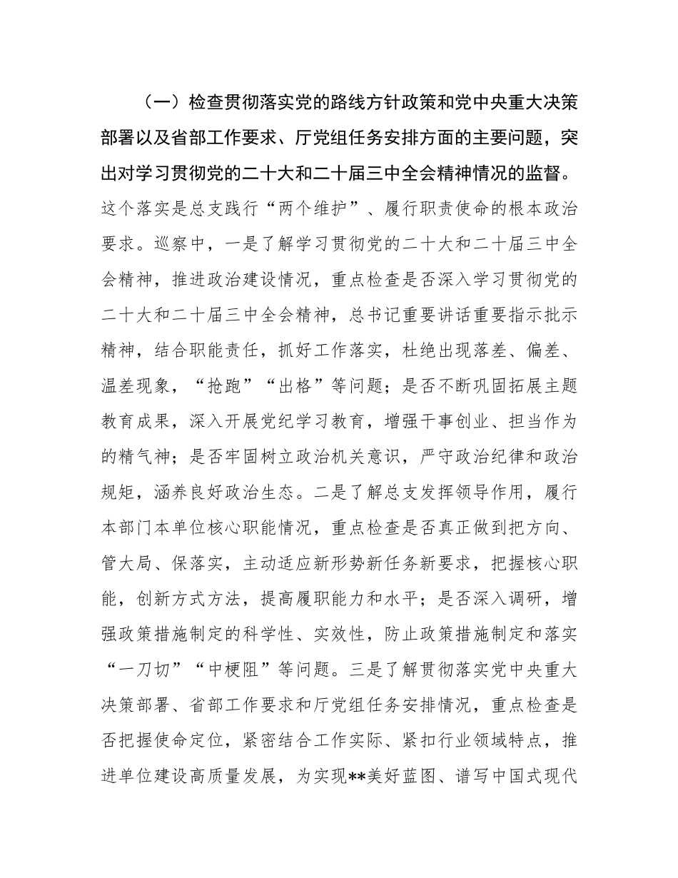 在2025年巡察工作动员会上的讲话各位领导、同志们:按照厅党组和巡察工作领导小组的安排部署,厅党组巡察组从今天开始,对*中心党总支开展巡察。今天会议的主要目的是,对巡察工作进行动员部署,共同完成好巡察任务。下面,我代表巡察组讲几点意见。一、准确把握巡察的政治要求巡视巡察是密切党群干群关系、巩固党的执政基础的有效途径,是督促基层强化党的领导、加强党的建设、落实全面从严治党的制度利器。巡察工作的本质是上级党组织对下级党组织履行党的领导职能责任的政治监督,是厅党组落实全面从严治党主体责任的具体化。巡察的根本任务是“两个维护”、价值取向是“以人民为中心”、监督重点是“四个落实”、监督标准是“四个对照”、监督路径是“四个紧盯”,聚焦监督党的理论路线方针政策、党中央重大决策部署、总书记重要指示要求的贯彻落实,督促推动党组织和党员干部以担当作为的实际行动增强“四个意识”、坚定“四个自信”、做到“两个维护”。根据厅党组安排,这次巡察以新时代中国特色社会主义思想为指导,以党的政治建设为统领,深入学习贯彻党的二十大和二十届三中全会精神,全面贯彻巡视工作方针,突出政治监督,科学界定范围,在整体指向上,坚持巡察监督无盲区;在监督范围上,坚持分级负责原则;在监督重点上,坚持抓住“关键少数”,着力推进全面从严治党向纵深发展。巡察组将忠诚党组授权、履行党章赋予职责,坚守政治巡察定位,严肃认真做好“政治体检”,查“病症”、找“病因”、开“药方”,努力做到盯着“已病”治“未病”,既有声势又有实效。二、严格依规依纪开展巡察巡察的主要对象是,聚焦**中心党总支,重点巡察监督总支班子及其成员、部门负责人和各级领导干部等,根据工作需要巡察范围和对象可以向下延伸。巡察的主要任务是,围绕贯彻党的二十大精神,聚焦新时代新征程党的使命任务,紧盯权力和责任,紧盯“一把手”和领导班子,紧盯群众反映强烈的突出问题,紧盯整改和成果运用,加强政治监督,查找政治偏差。重点突出以下x个方面的监督检查:(一)检查贯彻落实党的路线方针政策和党中央重大决策部署以及省部工作要求、厅党组任务安排方面的主要问题,突出对学习贯彻党的二十大和二十届三中全会精神情况的监督。这个落实是总支践行“两个维护”、履行职责使命的根本政治要求。巡察中,一是了解学习贯彻党的二十大和二十届三中全会精神,推进政治建设情况,重点检查是否深入学习贯彻党的二十大和二十届三中全会精神,总书记重要讲话重要指示批示精神,结合职能责任,抓好工作落实,杜绝出现落差、偏差、温差现象,“抢跑”“出格”等问题;是否不断巩固拓展主题教育成果,深入开展党纪学习教育,增强干事创业、担当作为的精气神;是否牢固树立政治机关意识,严守政治纪律和政治规矩,涵养良好政治生态。二是了解总支发挥领导作用,履行本部门本单位核心职能情况,重点检查是否真正做到把方向、管大局、保落实,主动适应新形势新任务新要求,把握核心职能,创新方式方法,提高履职能力和水平;是否深入调研,增强政策措施制定的科学性、实效性,防止政策措施制定和落实“一刀切”“中梗阻”等问题。三是了解贯彻落实党中央重大决策部署、省部工作要求和厅党组任务安排情况,重点检查是否把握使命定位,紧密结合工作实际、紧扣行业领域特点,推进单位建设高质量发展,为实现**美好蓝图、谱写中国式现代化**篇章当好开路先锋彰显担当;是否深化机构改革成果,持续推进机构、职能、人员全面融合;是否树立以人民为中心的发展观政绩观权力观,紧紧围绕人民群众对美好生活的向往履职尽责,保障群众合法权益,不断增强人民群众的获得感幸福感安全感。四是了解防范化解重大风险情况,重点检查是否牢固树立风险意识和忧患意识,认真梳理排查本单位在政治安全、经济发展、社会稳定特别是意识形态、安全生产、保密、统计等方面存在的风险隐患和薄弱环节,加强源头防控,建立和完善应急处置机制。(二)检查落实全面从严治党战略部署、履行主体责任和监督责任方面的主要问题,突出对“一把手”和领导班子的监督。管党治党是总支的重要职责,也是推进事业...