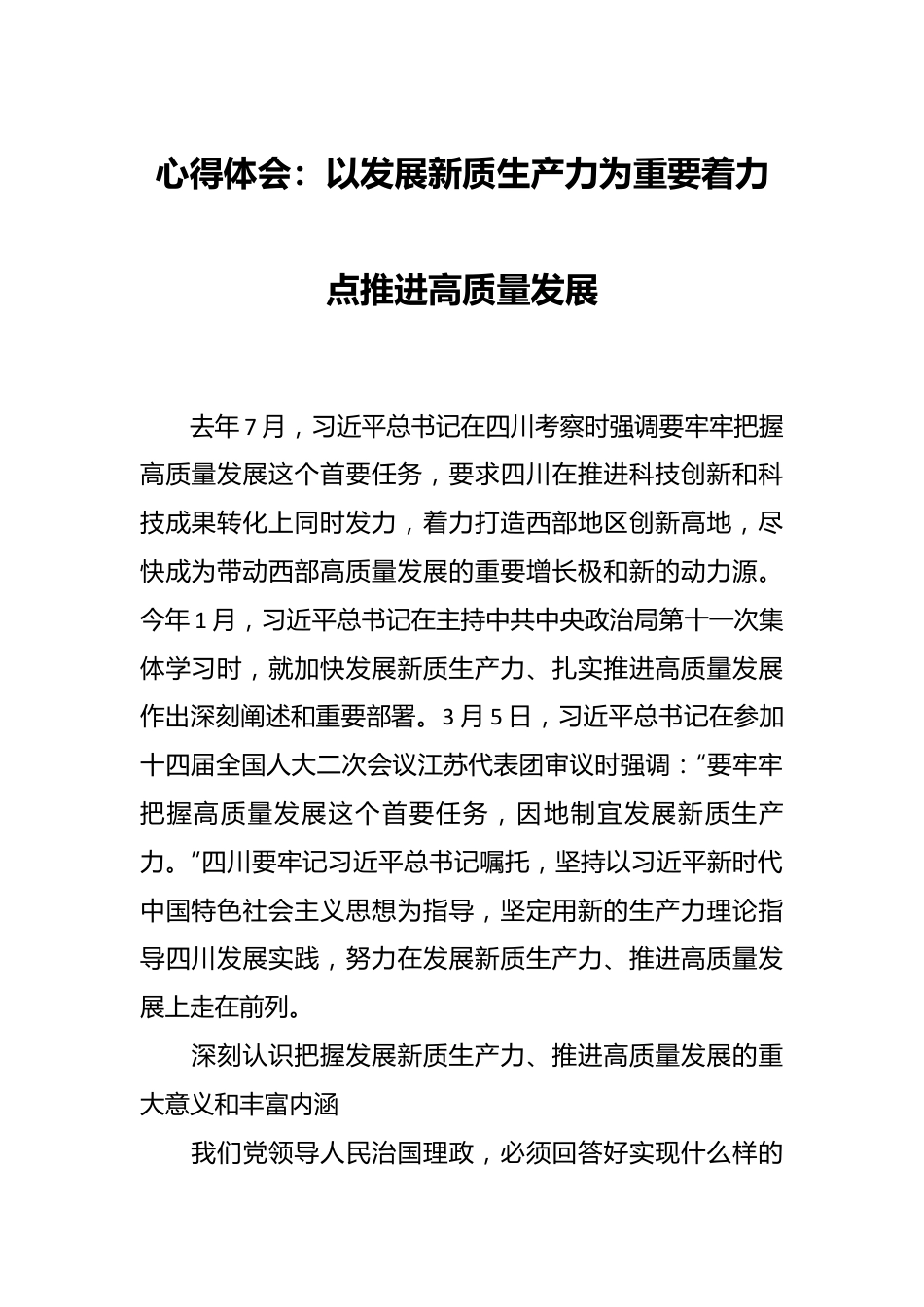 心得体会:以发展新质生产力为重要着力点推进高质量发展去年7月,习近平总书记在四川考察时强调要牢牢把握高质量发展这个首要任务,要求四川在推进科技创新和科技成果转化上同时发力,着力打造西部地区创新高地,尽快成为带动西部高质量发展的重要增长极和新的动力源。今年1月,习近平总书记在主持中共中央政治局第十一次集体学习时,就加快发展新质生产力、扎实推进高质量发展作出深刻阐述和重要部署。3月5日,习近平总书记在参加十四届全国人大二次会议江苏代表团审议时强调:“要牢牢把握高质量发展这个首要任务,因地制宜发展新质生产力。”四川要牢记习近平总书记嘱托,坚持以习近平新时代中国特色社会主义思想为指导,坚定用新的生产力理论指导四川发展实践,努力在发展新质生产力、推进高质量发展上走在前列。深刻认识把握发展新质生产力、推进高质量发展的重大意义和丰富内涵我们党领导人民治国理政,必须回答好实现什么样的发展、怎样实现发展这个重大问题。党的十八大以来,面对世界百年未有之大变局和中华民族伟大复兴战略全局,习近平总书记高瞻远瞩、运筹帷幄,对什么是高质量发展为什么要高质量发展、怎样实现高质量发展作出一系列理论概括和战略部署。从“适应把握引领经济发展新常态”到“立足新发展阶段、贯彻新发展理念、构建新发展格局”再到“发展新质生产力”,体现了我们党理论创新的一脉相承和与时俱进,为新时代新征程推进高质量发展指明了前进方向、提供了根本遵循。提出新质生产力这一重大概念具有深刻理论意义和重要实践价值。生产力理论是马克思主义经典理论。我们党始终坚持运用发展的马克思主义生产力理论指导不断变化的发展实践。在新时代的伟大实践中,习近平总书记深刻总结并充分运用我国经济发展的成功经验,引领推动我国经济持续健康发展、社会生产力水平大幅提升,高质量发展成为主旋律。习近平总书记指出:“高质量发展需要新的生产力理论来指导,而新质生产力已经在实践中形成并展示出对高质量发展的强劲推动力、支撑力”。新质生产力的提出,反映我国经济由“量”的积累转向“质”的突破的新时代生产力现状,顺应“两个大局”相互交织和推进高质量发展的新要求,是对马克思主义生产力理论的创新和发展,进一步丰富了习近平经济思想,意义重大而深远。新质生产力意味着生产力质的跃迁。习近平总书记指出:“新质生产力是创新起主导作用,摆脱传统经济增长方式、生产力发展路径,具有高科技、高效能、高质量特征符合新发展理念的先进生产力质态。它由技术革命性突破生产要素创新性配置、产业深度转型升级而催生,以劳动者、劳动资料、劳动对象及其优化组合的跃升为基本内涵,以全要素生产率大幅提升为核心标志,特点是创新,关键在质优,本质是先进生产力。”新质生产力与传统生产力有质的区别,是对传统生产方式的颠覆性变革,要求在劳动者劳动资料、劳动对象上全面创新,实现生产力驱动方式、作用方式、表现方式的全方位变革。简而言之,新质生产力是新型劳动主体与新质劳动客体的有机统一,是一种更高水平的现代化生产力。新质生产力与高质量发展相互促进、相互支撑。习近平总书记指出:“发展新质生产力是推动高质量发展的内在要求和重要着力点”。习近平总书记的重要论述,深刻阐明了发展新质生产力和推进高质量发展的辩证统一关系。一方面,发展新质生产力是实现高质量发展的引领性力量,也是关键路径和动力支撑,有助于提高生产效率和资源利用效率,加快推进产业转型升级、构建现代化产业体系,提高经济发展的质量和效益。另一方面,高质量发展能够为新质生产力发展提供广阔空间和有利条件。推进高质量发展必然要加大对科技创新、人才培养、基础设施建设等方面的投入,也必将激发多样化、高品质的需求,为新质生产力发展提供更多机遇和条件。发展新质生产力、推进高质量发展是我们必须回答好的一道“必答题”。这一重大部署涉及领域宽、范围广,有许多新情况需要研究、许多新问题需要解决,必须结合实际认真谋划、扎实推进。要自觉在思想上对标,坚持把高质量发展作为首要任务、作为对经济社会发展方方面面的总要求,推动创新成为第一...