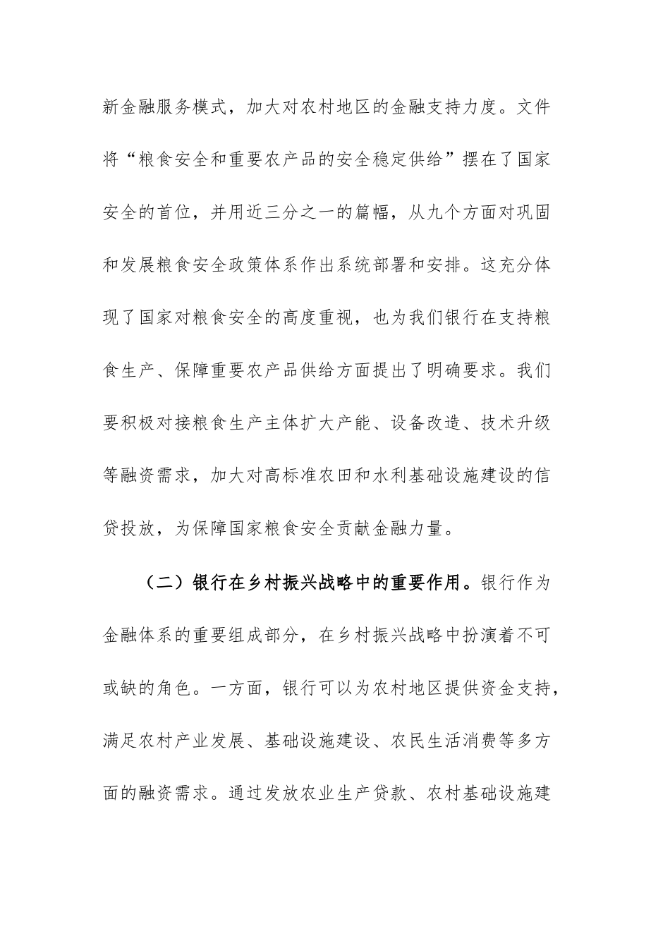 银行行长在学习2025年中央一号文件精神专题会上的研讨发言供参考同志们:2025年2月23日,《中共中央国务院关于进一步深化农村改革扎实推进乡村全面振兴的意见》正式发布,这是党的十八大以来第13个指导“三农”工作的中央一号文件。文件聚焦“三农”领域,以改革开放和科技创新为动力,围绕确保国家粮食安全、不发生规模性返贫致贫等核心目标,对提升乡村产业发展水平、乡村建设水平、乡村治理水平等方面作出了全面部署,为全面推进乡村振兴、加快农业农村现代化指明了方向,也为我们银行金融机构在“三农”领域的工作提供了根本遵循。下面,我结合银行工作实际,谈几点学习体会。一、深刻领会文件精神,明确银行支持乡村振兴的新使命(一)文件释放的强烈信号和蕴含的战略意义。2025年中央一号文件释放出了强烈的改革信号,强调以深化农村改革来促进乡村的全面振兴。在土地制度改革方面,进一步深化农村土地制度改革,抓好土地承包30年到期再延长30年的试点工作,推进宅基地入股合作盘活利用和集体建设用地入市改革,完善利益分配关系。这一系列改革举措,将激活农村土地资源,为农村产业发展和农民增收创造新的机遇。在投融资机制创新方面,提出创新乡村振兴的投融资机制,发挥财政四两拨千斤的作用,引导、鼓励金融和社会资本更多投入乡村振兴的各个领域。这对我们银行来说,既是机遇也是挑战,意味着我们要积极探索创新金融服务模式,加大对农村地区的金融支持力度。文件将“粮食安全和重要农产品的安全稳定供给”摆在了国家安全的首位,并用近三分之一的篇幅,从九个方面对巩固和发展粮食安全政策体系作出系统部署和安排。这充分体现了国家对粮食安全的高度重视,也为我们银行在支持粮食生产、保障重要农产品供给方面提出了明确要求。我们要积极对接粮食生产主体扩大产能、设备改造、技术升级等融资需求,加大对高标准农田和水利基础设施建设的信贷投放,为保障国家粮食安全贡献金融力量。(二)银行在乡村振兴战略中的重要作用。银行作为金融体系的重要组成部分,在乡村振兴战略中扮演着不可或缺的角色。一方面,银行可以为农村地区提供资金支持,满足农村产业发展、基础设施建设、农民生活消费等多方面的融资需求。通过发放农业生产贷款、农村基础设施建设贷款、农户消费贷款等,促进农村经济的发展和农民生活水平的提高。另一方面,银行可以利用自身的金融资源和专业优势,为农村地区提供金融服务和金融知识普及,提高农民的金融素养和金融意识,帮助农民更好地利用金融工具实现增收致富。同时,银行还可以通过与政府部门、企业等合作,共同推动农村产业发展和乡村建设,形成多方合力,共同推进乡村振兴战略的实施。(三)银行面临的机遇与挑战。随着乡村振兴战略的深入实施,农村地区的金融需求不断增长,为银行带来了广阔的市场空间和发展机遇。农村产业的升级转型、农村基础设施的改善、农民消费观念的转变等,都需要大量的资金支持,这为银行拓展业务提供了新的增长点。同时,国家对农村金融的政策支持力度不断加大,为银行开展农村金融业务创造了良好的政策环境。例如,央行通过再贷款再贴现、差别化存款准备金等货币政策工具,引导金融机构加大对乡村振兴重点领域的信贷支持力度;财政部门通过风险补偿、财政贴息、融资担保等配套政策,与货币政策形成合力,支持乡村振兴相关领域贷款发放。然而,银行在支持乡村振兴过程中也面临着一些挑战。一是农村地区信用体系建设相对滞后,信用信息不完善,导致银行在开展信贷业务时面临较高的信用风险。二是农村地区金融服务成本较高,由于农村地区地域广阔、人口分散,金融机构网点覆盖不足,导致金融服务的运营成本和交易成本较高。三是农村金融产品和服务创新不足,难以满足农村多样化的金融需求。目前,农村金融产品主要以传统的存贷款业务为主,金融服务方式相对单一,无法满足农村产业发展和农民生活消费的多样化需求。面对机遇与挑战,我们银行要积极应对,充分发挥自身优势,加强金融创新,提升服务水平,为乡村振兴提供更加优质、高效的金融服务。二、结合银行工作实际,探索支持乡村振兴的有效路径(一)加大信贷投...