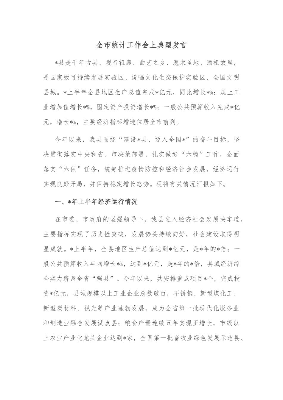 全市统计工作会上典型发言*县是千年古县、观音祖庭、曲艺之乡、魔术圣地、酒祖故里,是国家级可持续发展实验区、说唱文化生态保护实验区、全国文明县城。*上半年全县地区生产总值完成*亿元,同比增长*%;规上工业增加值增长*%,固定资产投资增长*%;一般公共预算收入完成*亿元,增长*%,主要经济指标增速位居全市前列。今年以来,我县围绕“建设*县、迈入全国*”的奋斗目标,坚决贯彻落实中央和省、市决策部署,扎实做好“六稳”工作,全面落实“六保”任务,统筹推进疫情防控和经济社会发展,经济运行实现良好开局,并保持稳定增长态势。现将有关情况汇报如下。一、*年上半年经济运行情况在市委、市政府的坚强领导下,我县进入经济社会发展快车道,主要指标实现了历史性突破,发展势头持续向好,社会建设取得明显成就。*上半年,全县地区生产总值达到*亿元,是*年的*倍;一般公共预算收入年均增长*%,达到*亿元,是*年的*倍,县域经济综合实力跻身全省“强县”。今年以来,共安排重点项目*个,完成投资*亿元,县域规模以上工业企业总数破百,不锈钢、新型煤化工、新型炭材料、视光等产业蓬勃发展,成为全省第一批现代化服务业和制造业融合发展试点县;粮食产量连续五年实现正增长,市级以上农业产业化龙头企业达到*家,全国第一批畜牧业绿色发展示范县、全国农业绿色发展先行先试支撑体系建设试点县、全国主要农作物生产全程机械化示范县等一大批“国字号”荣誉花落*;城乡融合发展成效显著,居民人均可支配收入达到*元,是*年的*倍,城镇化率达到*%,是全市唯一城镇化率实现正增长的县区。二、一年来重点工作及成效(一)深化统计改革。一是县委、政府高度重视统计工作。县委常委会议、政府常务会议多次集中学习习近平总书记关于统计工作的重要指示批示精神,以及有关统计造假弄虚作假案件通报,全面推动关于统计改革发展各项决策部署落地见效。*年至今,书记、县长、常务副县长先后*次莅临调研统计工作,专题听取统计工作汇报*余次,就加强统计工作作出重要指示,从机构设置、人员配备等方面着手,就解决统计基础薄弱问题进行了积极探索。二是坚持党对统计工作的领导。*月组建了由县委书记任第一主任、县长任主任的高规格统计工作委员会,筑牢党领导统计工作的根基。并于次月召开县委统计委员会第一、二次会议,审议通过了《县委统计工作委员会议事规则》《县委统计工作委员会办公室工作细则》和《*县统计*管理办法》。三是大力改善办公条件。为统计局划拨独立办公场所,实现各专业股室单列办公,集中办公面积由原本的人均*平方增加到现在的*平方。四是加强统计队伍建设。同意增设二级机构—统计事务服务中心,选聘正股级工作人员*名分别派驻*庄镇、*镇、*庄镇、*镇、*镇、*镇、*乡、*乡、*镇、*镇、*镇、*乡,打通统计监督最后“一公里”。(二)争创“双基”示范县。一是坚持以“抓基层、强基础、夯基石”为主线,实施“统计基层基础建设三年行动计划”,以加强乡镇统计工作为着力点,连续三年进行规范化建设评比,力促全县统计基层基础建设取得突破性进展。二是明确县、乡两级机构配置,在全县所有乡镇加挂统计工作办公室,做到了统计工作有机构、有人员、有经费、有办公条件。三是以政府名义印发《创建全省统计基层基础示范县实施方案》(*政办明电〔*〕*号),提出创建全省统计基层基础建设示范县的目标和要求,巩固乡镇层级网络,在全县掀起争创统计基层基础规范化建设达标乡、示范乡的高潮。四是研究制定统计各专业一套表企业规范化标准清单和统计电子台账。对照《*省一套表联网直报企业统计基础工作规范检查考核标准》,结合专业实际,明确规范化标准清单和统计电子台账,工业、财贸、服务业、房地产等专业标准清单和电子台账已发给乡镇和规模以上一套表企业,企业开展规范化有了抓手。下一步,我们将继续研究制定规下企业和村级样本点统计机构规范化标准清单和电子台账,实现统计规范化全覆盖。(三)探索“入库”培育新模式。一是*年以来,我们通过实地学习调研,借鉴*市、*城、*等兄弟县(市)区的四上单位入库的先进经验和做法,制定并实施了我县促进入库工作考核奖...