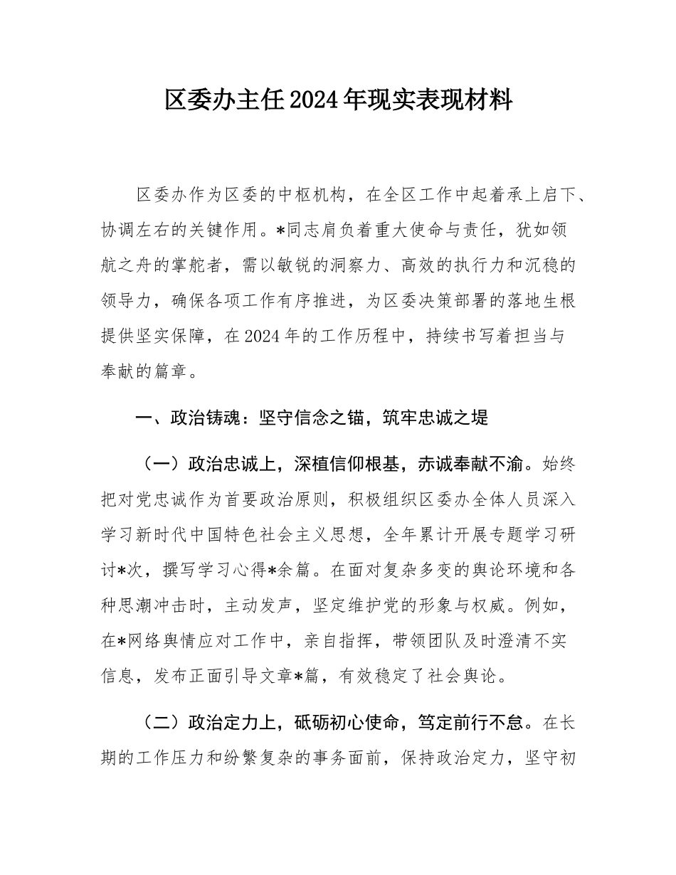 区委办主任2024年现实表现材料区委办作为区委的中枢机构,在全区工作中起着承上启下、协调左右的关键作用。*同志肩负着重大使命与责任,犹如领航之舟的掌舵者,需以敏锐的洞察力、高效的执行力和沉稳的领导力,确保各项工作有序推进,为区委决策部署的落地生根提供坚实保障,在2024年的工作历程中,持续书写着担当与奉献的篇章。一、政治铸魂:坚守信念之锚,筑牢忠诚之堤(一)政治忠诚上,深植信仰根基,赤诚奉献不渝。始终把对党忠诚作为首要政治原则,积极组织区委办全体人员深入学习新时代中国特色社会主义思想,全年累计开展专题学习研讨*次,撰写学习心得*余篇。在面对复杂多变的舆论环境和各种思潮冲击时,主动发声,坚定维护党的形象与权威。例如,在*网络舆情应对工作中,亲自指挥,带领团队及时澄清不实信息,发布正面引导文章*篇,有效稳定了社会舆论。(二)政治定力上,砥砺初心使命,笃定前行不怠。在长期的工作压力和纷繁复杂的事务面前,保持政治定力,坚守初心。坚决贯彻落实党的路线方针政策,积极推动区委各项决策在基层的实施。在脱贫攻坚与乡村振兴有效衔接工作中,深入基层调研*个乡镇,*余个村庄,与群众面对面交流,了解实际需求,为制定精准帮扶政策提供了第一手资料,确保党的惠民政策落到实处。(三)政治担当上,勇挑重担在肩,敢为先锋之锐。面对急难险重任务,毫不退缩,勇于担当。在今年的防汛救灾工作中,迅速组织区委办成立应急救援小组,连续奋战在抗洪一线*天,协调调配救援物资*批次,转移受灾群众*余人,充分展现了在关键时刻的政治担当和责任意识。(四)政治能力上,锤炼过硬本领,精准施策之能。不断提升政治领悟力、政治判断力和政治执行力。在区委重大项目决策过程中,深入分析政策形势,准确把握发展机遇,为区委提供科学合理的决策建议。如在*重大项目引进过程中,带领团队对项目进行全方位的政治风险评估和经济效益分析,经过多轮谈判与协商,成功促成项目落地,预计带动当地就业*人,增加税收*亿元。(五)政治自律上,严守纪律红线,清正廉洁之范。严格遵守党的政治纪律和政治规矩,以身作则,带头遵守中央八项规定及其实施细则精神。在办公室内部开展廉政教育活动*次,通过案例分析、廉政谈话等方式,增强全体人员的廉洁自律意识。在办公用品采购、公务接待等工作中,严格规范流程,杜绝违规行为,营造了风清气正的工作环境。二、工作成就:扬起奋进之帆,勇创卓越之功(一)高效协调上,畅通政令渠道,构建和谐之网。在协调各方工作方面表现出色,全年组织召开区委各类会议*次,从会议筹备、议程安排到会议纪要的整理与下发,都做到了严谨细致、高效有序。在跨部门工作协调中,成功解决了*起部门之间的工作矛盾与衔接不畅问题。例如,在城市建设重点项目推进过程中,涉及规划、住建、环保等多个部门,通过建立常态化的协调沟通机制,定期召开联席会议,及时解决了项目审批、施工许可、环保测评等关键环节的问题,确保项目提前*天开工建设。(二)信息枢纽上,精准捕捉动态,传递决策之声。着力打造高效的信息收集与传递体系,建立了覆盖全区各乡镇、各部门的信息员网络,全年共收集各类信息*条,经过筛选整理,向区委领导报送有价值的信息*条,为区委决策提供了及时准确的依据。其中,关于基层社会治理创新的信息被市委采用并在全市范围内推广,为提升全区乃至全市的社会治理水平贡献了力量。(三)参谋辅政上,深研发展良策,绘制蓝图之笔。积极发挥参谋助手作用,组织办公室人员开展调研活动*次,形成高质量的调研报告*篇。在制定全区“十四五”规划过程中,深入研究国家宏观政策和区域发展趋势,结合本地实际情况,提出了*条具有前瞻性和可操作性的建议,其中*条被纳入规划最终稿,为全区未来五年的发展明确了方向。三、个性彰显:秉持务实之风,塑造亲和之形(一)工作风格上,严谨细致入微,雷厉风行不懈。对待工作一丝不苟,对每份文件、每个数据都认真审核把关。在起草区委重要文件时,逐字逐句斟酌,反复修改,确保文件内容准确无误、逻辑严密。例如,在一份关于全区经济发展战略的文件起草过程中,查阅大量资料,与相...
