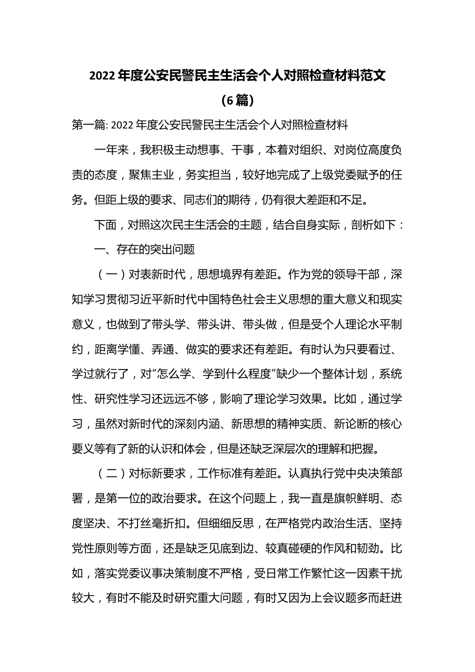 2022年度公安民警民主生活会个人对照检查材料范文(6篇)第一篇:2022年度公安民警民主生活会个人对照检查材料一年来,我积极主动想事、干事,本着对组织、对岗位高度负责的态度,聚焦主业,务实担当,较好地完成了上级党委赋予的任务。但距上级的要求、同志们的期待,仍有很大差距和不足。下面,对照这次民主生活会的主题,结合自身实际,剖析如下:一、存在的突出问题(一)对表新时代,思想境界有差距。作为党的领导干部,深知学习贯彻习近平新时代中国特色社会主义思想的重大意义和现实意义,也做到了带头学、带头讲、带头做,但是受个人理论水平制约,距离学懂、弄通、做实的要求还有差距。有时认为只要看过、学过就行了,对“怎么学、学到什么程度”缺少一个整体计划,系统性、研究性学习还远远不够,影响了理论学习效果。比如,通过学习,虽然对新时代的深刻内涵、新思想的精神实质、新论断的核心要义等有了新的认识和体会,但是还缺乏深层次的理解和把握。(二)对标新要求,工作标准有差距。认真执行党中央决策部署,是第一位的政治要求。在这个问题上,我一直是旗帜鲜明、态度坚决、不打丝毫折扣。但细细反思,在严格党内政治生活、坚持党性原则等方面,还是缺乏见底到边、较真碰硬的作风和韧劲。比如,落实党委议事决策制度不严格,受日常工作繁忙这一因素干扰较大,有时不能及时研究重大问题,有时又因为上会议题多而赶进度,没有充分听取班子成员的意见建议,影响了民主集中质量。(三)对照新标准,自我要求有差距。走上领导岗位以来,我一直告诫自己:处于特殊位置,不搞特殊待遇;负有特殊责任,没有特殊权力。但有时觉得自己是一名老党员,党性观念强、底线思维牢,是非观、大局观从未偏移,作风方面不会出问题,因此不自然就忽视了党性修养的锤炼,思想上也不自然就会有宽松现象。特别是受社会一些庸俗思想的影响,放松了自我要求。二、存在问题的主要原因(一)理论学习抓得不够紧。面对不断发展的形勢任务,自己虽然能够认识到理论学习的重要性,也尽可能抽出时间加强学习,但主观上的积极性、主动性,投入学习的时间、精力都有所下降,学习不系统、不全面、不深入,真正把学到的知识应用到实际工作中的还不多,特别是对习近平新时代中国特色社会主义思想,还没有深刻地理解领会,以致于指导实践谋划工作的视野不够开阔。(二)思想改造抓的不够实。近年来,随着改革开放的深入,面临的形势任务、所处的环境发生了时代性的变化,思想文化日趋多元多样。在这个过程中,自己虽然牢记是一名共产党员,但在潜移默化、日久天长的影响中,还是不自觉地放松了警惕、降低了标准,对一些不良现象、不正之风总认为是社会大环境造成的,没有旗帜鲜明地去反对和抵制。这些都是与党章的要求,与共产党员的本色相违背的,都是有损于事业和个人的。(三)自我约束抓的不够严。“自重、自省、自警、自励”、“慎独、慎初、慎微”,这些挂在嘴边、响在耳边的教诲应该是党员领导干部的“座右铭”和“护身符”。对照这些要求感到自己在一些方面放松了。特别是作为领导干部,恭维的话多了,批评建议少了,在这种情况下,没有很好地自我提醒、自我告诫,面对不良苗头,更多地是“随大流”。这都是有损于党员领导干部形象和风气的。三、下步整改措施(一)对党忠诚不变色。坚持把学习贯彻习近平新时代中国特色社会主义思想和党的十九大及历次全会精神作为当前和今后一个时期的首要政治任务来抓,带领党委班子和全体党员,始终在政治立场、政治方向、政治原则上同以习近平为核心的党中央保持高度一致,真正把对表看齐的政治要求内化于心,外化与行,以新思想引领新征程,以新姿态奋进新时代。(二)求真务实转作风。强化党委书记第一身份是党的书记、最大的政绩是抓好党建、首要职责是管党治党的理念,抓管理、立规矩、严问责,推动党风廉政建设党委主体责任刚性落实,始终保持从严洽党、从严治警的高压态势。坚持把改进作风、提高效能作为永恒的主题,进一步转变观念、更新理念,深入研究面临的新情况新问题,把握规律、掌握主动,不断创新工作模式,提高服务保证效能,凸显政治工作生...