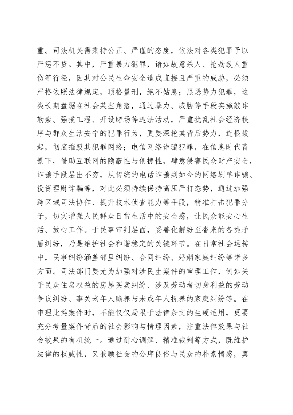 市人民法院院长学习2025年全国两会精神中心组研讨发言材料(1)2025年全国两会是在全面贯彻落实党的二十大和二十届二中、三中全会精神,全面推进中国式现代化新征程的关键时刻召开的重要会议。大会全面总结了过去一年的工作,深入分析了当前面临的形势,科学部署了新一年的任务,为我们指明了前进方向、提供了根本遵循。两会期间,习近平总书记发表的一系列重要讲话,高屋建瓴、思想深邃、内涵丰富,为我们做好各项工作提供了强大思想武器和行动指南。作为市人民法院院长,我深感责任重大、使命光荣。通过认真学习领会两会精神,结合法院工作实际,我有以下几点体会。一、体悟全国两会贯穿的人民至上情怀。人民至上是两会始终坚守的价值理念。政府工作报告中,一系列民生政策和举措,充分彰显了党和政府以人民为中心的发展思想。最高人民法院工作报告也将“坚持以人民为中心”作为重要原则,强调要努力让人民群众在每一个司法案件中感受到公平正义。在法院工作中,我们要始终把人民群众的利益放在首位。一是加强民生司法保障。依法妥善审理教育、就业、医疗、养老、住房等涉民生案件,切实维护人民群众的合法权益。加大对弱势群体的司法救助力度,让困难群众感受到司法的温暖。二是深化诉讼服务体系建设。推进一站式多元解纷和诉讼服务体系建设,完善网上立案、在线庭审、电子送达等智能化诉讼服务,让人民群众享受更加便捷高效的司法服务。三是积极回应群众关切。认真办理群众来信来访,及时解决群众反映的问题。加强司法公开,主动接受社会监督,提高司法公信力。二、感受全国两会传递的共克时艰信心。面对复杂多变的国际形势和艰巨繁重的改革发展稳定任务,两会传递出坚定信心、共克时艰的强烈信号。政府工作报告对今年经济社会发展目标任务的明确,展现了党和政府推动高质量发展的坚定决心和信心。法院作为维护社会公平正义的最后一道防线,在服务经济社会发展中肩负着重要职责。一是要充分发挥审判职能作用,为经济高质量发展提供有力司法保障。依法平等保护各类市场主体的合法权益,营造稳定公平透明、可预期的法治化营商环境。加强知识产权司法保护,服务创新驱动发展战略。妥善审理涉企业破产、金融等案件,防范化解重大风险,维护经济金融秩序。二是要积极参与社会治理创新,助力平安建设。坚持和发展新时代“枫桥经验”,推动矛盾纠纷多元化解,从源头上预防和减少矛盾纠纷的发生。加强对新业态、新领域矛盾纠纷的研究,及时提出司法建议,促进社会治理体系和治理能力现代化。三、把握全国两会凸显的稳是大局特点。稳是大局,是两会的重要共识。当前,国内外环境依然复杂严峻,保持经济社会稳定发展至关重要。法院要紧紧围绕“稳”的要求,充分发挥审判职能作用,为经济社会发展营造稳定的法治环境。在刑事审判领域,筑牢国家安全与社会稳定的坚实防线乃是重中之重。司法机关需秉持公正、严谨的态度,依法对各类犯罪予以严惩不贷。其中,严重暴力犯罪,诸如故意杀人、抢劫致人重伤等行径,因其对公民生命安全造成直接且严重的威胁,必须严格依照法律规定,顶格量刑,绝不姑息;黑恶势力犯罪,这类长期盘踞在社会某些角落,通过暴力、威胁等手段实施敲诈勒索、强揽工程、开设赌场等违法活动,严重扰乱社会经济秩序与群众生活安宁的犯罪行为,更要深挖其背后势力,连根拔起,彻底摧毁其犯罪网络;电信网络诈骗犯罪,在信息时代背景下,借助互联网的隐蔽性与便捷性,肆意侵害民众财产安全,诈骗手段层出不穷,从传统的电话诈骗到如今的网络刷单诈骗、投资理财诈骗等,对此必须持续保持高压严打态势,通过加强跨区域司法协作、提升技术侦查能力等手段,精准打击犯罪分子,切实增强人民群众日常生活中的安全感,让民众能安心生活、放心工作。于民事审判层面,妥善化解纷至沓来的各类矛盾纠纷,乃是维护社会和谐稳定的关键环节。在日常社会运转中,民事纠纷涵盖邻里纠纷、合同纠纷、婚姻家庭纠纷等诸多方面。司法部门要尤为加强对涉民生案件的审理工作,例如关乎民众住房权益的房屋买卖纠纷、涉及劳动者切身利益的劳动争议纠纷、事关老年人赡养与未成年人抚养的家庭纠纷等。在...