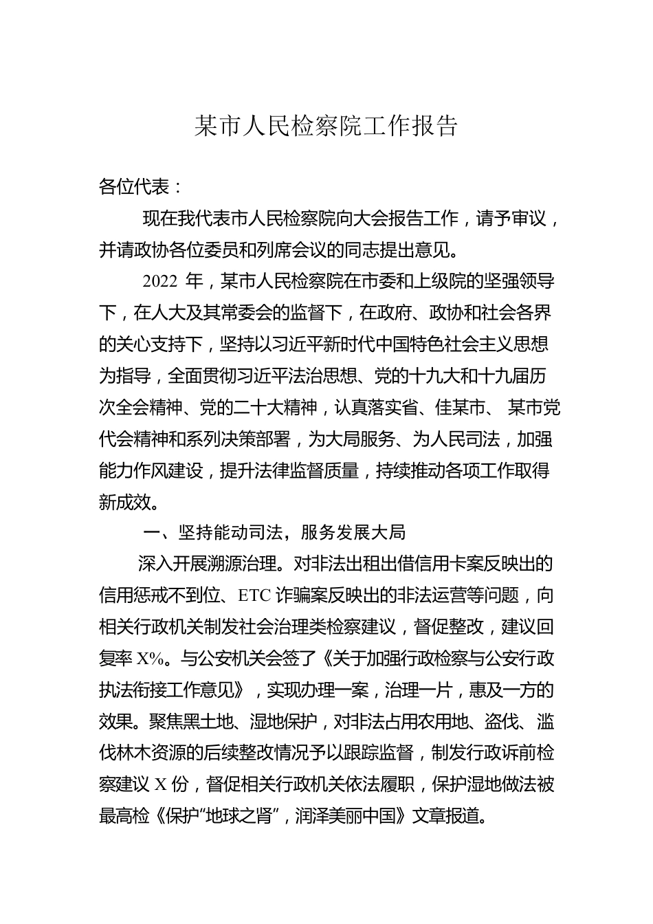 某市人民检察院工作报告各位代表:现在我代表市人民检察院向大会报告工作,请予审议,并请政协各位委员和列席会议的同志提出意见。2022年,某市人民检察院在市委和上级院的坚强领导下,在人大及其常委会的监督下,在政府、政协和社会各界的关心支持下,坚持以习近平新时代中国特色社会主义思想为指导,全面贯彻习近平法治思想、党的十九大和十九届历次全会精神、党的二十大精神,认真落实省、佳某市、某市党代会精神和系列决策部署,为大局服务、为人民司法,加强能力作风建设,提升法律监督质量,持续推动各项工作取得新成效。一、坚持能动司法,服务发展大局深入开展溯源治理。对非法出租出借信用卡案反映出的信用惩戒不到位、ETC诈骗案反映出的非法运营等问题,向相关行政机关制发社会治理类检察建议,督促整改,建议回复率X%。与公安机关会签了《关于加强行政检察与公安行政执法衔接工作意见》,实现办理一案,治理一片,惠及一方的效果。聚焦黑土地、湿地保护,对非法占用农用地、盗伐、滥伐林木资源的后续整改情况予以跟踪监督,制发行政诉前检察建议X份,督促相关行政机关依法履职,保护湿地做法被最高检《保护“地球之肾”,润泽美丽中国》文章报道。全力提升服务效能。组建了法律服务宣讲团,针对群众关切问题,制作了校♘欺凌、民间借贷、防网络诈骗等优质法治课程,送法进机关、进企业、X区、进校♘X次,与某市新联会共同创作的《合伙“邪”议》《股东不能轻易当,小心“背锅”上大当》等多期普法视频,为企业健康发展提供贴心服务。面对我市发生的疫情,迅速组织干警下沉一线,圆满完成各项防疫任务。扎实践行“枫桥经验”。建立化解信访矛盾新模式,坚持应受尽受,重点案件采取“领导包案+简易听证+协调联动”多元方式,以属事为核心,明确责任,从接待到受理到答复,各环节衔接紧密,手递手不松手,严格执行“群众来信件件有回复”要求,共受理信访案件X件,书面答复X件,书面答复后重复访X人,无越级访。合力共促司法公正。共邀请人大代表、政协委员、人民监督员X人次,参加检察听证、检察开放日等活动,召开不起诉、监督撤案、不支持民事监督申请等案件听证会X次,主动接受人大常委会对未成年人检察工作开展情况进行检查,让公平正义可触可感可信。二、强化理念引领,增强实干担当在监督履职中实现双赢多赢共赢。与纪委监委、法院、公安机关、行政执法机关建立良性、积极的关系。切实加强与纪委监委的协作配合,确保职务犯罪案件政治效果、社会效果和法律效果相统一。与法院就刑事案件适用司法程序达成共识,做到繁案精办,简案快办,速裁简易程序适用率X.X%,同比提高X.X个百分点。与公安机关就落实“少捕慎诉慎押”刑事政策达成共识,诉前羁押率X.X%,同比降低X.X个百分点。积极落实“七号检察建议”“八号检察建议”,主动联系行政部门深入到快递物流公司、某市中石油南油库等企业,针对寄递危险品和安全生产展开走访调查、法律宣传,与某市应急管理局签订了《关于加强刑事检察、公益诉讼检察与安全生产领域行政执法衔接工作机制》,共筑安全生产“防护墙”,打造“检察+行政”新格局。在监督履职中彰显司法为民情怀。办理支持弱势群体起诉案件X件,对一起利用“接码”服务侵犯公民个人信息案提起刑事附带民事公益诉讼,向违法行为人主张损害赔偿金X万余元,司法救助X人,发放救助金X万元,为方便群众诉求,制作了刑事申诉、国家赔偿等X项一次性告知单。为最大限度降低司法办案对民营企业生产经营活动的负面影响,顶住举报人闹访压力,对一名已逮捕的农村合作社法人开展羁押必要性审查,向公安机关提出变更强制措施的建议,使其配合X余名社员办理贷款、粮食补贴发放等事项,保障了春耕生产作业顺利进行。对未成年人开展综合司法保护,持续抓好“一号检察建议”落实,编辑制作了《校♘维权手册》《告父母权利义务书》,对师生和家长开展同步法治宣讲,积极开展校安全、校周边食品监督,办理校外培♘♘训机构入职查询、小儿推拿店无证经营婴幼儿保健食品公益诉讼监督案件X件,办理未成年X区矫正监督案件X件,督促教育部门对中小学、幼儿♘、校外培训机构新入职人...
