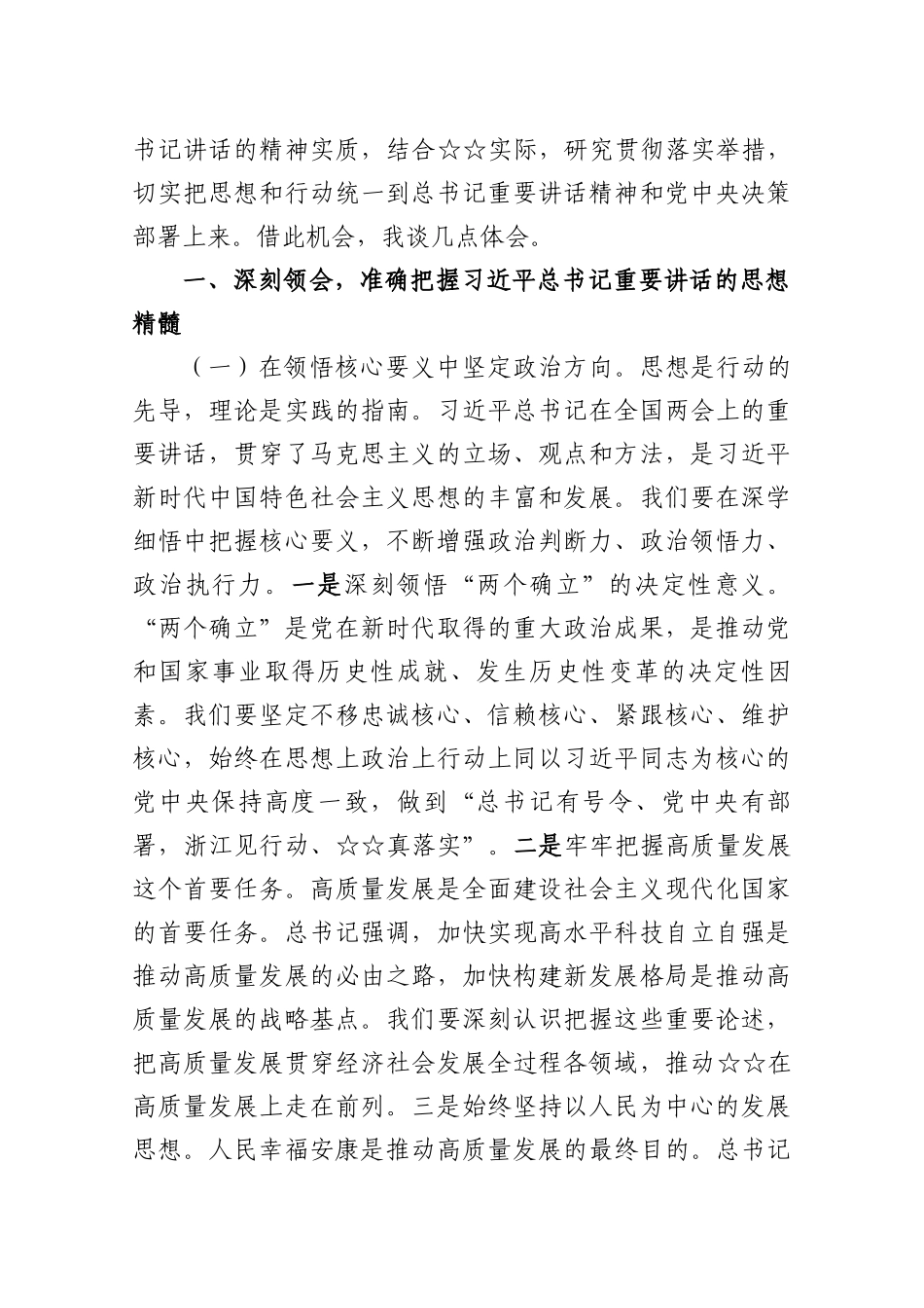 目录1.市委副书记在理论学习中心组专题学习习近平总书记在全国“两会”上的重要讲话精神研讨交流会上的发言........................................12.市委常委、副市长在理论学习中心组专题学习习近平总书记在全国“两会”上的重要讲话精神研讨交流会上的发言............................123.政协党组理论学习中心组专题学习习近平总书记在全国“两会”上的重要讲话精神研讨交流会上的讲话...................................................184.政协主席在市委理论学习中心组专题学习习近平总书记在全国“两会”期间发表重要讲话精神研讨交流会上的发言..............................315.人大副主任在理论学习中心组专题学习习近平总书记在全国“两会”上的重要讲话精神研讨交流会上的发言......................................38市委副书记在理论学习中心组专题学习习近平总书记在全国“两会”上的重要讲话精神研讨交流会上的发言同志们:在全面贯彻落实党的二十届三中全会精神的关键之年、全面推进建设中国式现代化的重要之年,2025年全国两会胜利召开。习近平总书记在两会期间发表的一系列重要讲话,高屋建瓴、思想深邃、内涵丰富,为我们做好各项工作提供了根本遵循和行动指南。深入学习贯彻习近平总书记重要讲话精神,是当前和今后一个时期的重要政治任务。今天,我们召开理论学习中心组专题学习研讨会,就是要深刻领会总书记讲话的精神实质,结合☆☆实际,研究贯彻落实举措,切实把思想和行动统一到总书记重要讲话精神和党中央决策部署上来。借此机会,我谈几点体会。一、深刻领会,准确把握习近平总书记重要讲话的思想精髓(一)在领悟核心要义中坚定政治方向。思想是行动的先导,理论是实践的指南。习近平总书记在全国两会上的重要讲话,贯穿了马克思主义的立场、观点和方法,是习近平新时代中国特色社会主义思想的丰富和发展。我们要在深学细悟中把握核心要义,不断增强政治判断力、政治领悟力、政治执行力。一是深刻领悟“两个确立”的决定性意义。“两个确立”是党在新时代取得的重大政治成果,是推动党和国家事业取得历史性成就、发生历史性变革的决定性因素。我们要坚定不移忠诚核心、信赖核心、紧跟核心、维护核心,始终在思想上政治上行动上同以习近平同志为核心的党中央保持高度一致,做到“总书记有号令、党中央有部署,浙江见行动、☆☆真落实”。二是牢牢把握高质量发展这个首要任务。高质量发展是全面建设社会主义现代化国家的首要任务。总书记强调,加快实现高水平科技自立自强是推动高质量发展的必由之路,加快构建新发展格局是推动高质量发展的战略基点。我们要深刻认识把握这些重要论述,把高质量发展贯穿经济社会发展全过程各领域,推动☆☆在高质量发展上走在前列。三是始终坚持以人民为中心的发展思想。人民幸福安康是推动高质量发展的最终目的。总书记的重要讲话,始终贯穿着以人民为中心的发展思想,充分彰显了大国领袖的人民情怀。我们要坚持发展为了人民、发展依靠人民、发展成果由人民共享,不断增进民生福祉,提高人民生活品质,让☆☆人民的获得感、幸福感、安全感更加充实、更有保障、更可持续。(二)在把握战略部署中明确前进方向。习近平总书记在全国两会上对经济社会发展各项工作作出了全面部署,为我们指明了前进方向。我们要准确把握战略部署,找准工作的切入点和着力点,推动各项工作取得新成效。一是加快构建以创新为主动力的现代化产业体系。总书记强调,科技创新和产业创新,是发展新质生产力的基本路径。☆☆作为全国数字经济第一城,要深入推进数字经济创新提质“一号发展工程”,更好统筹教育、科技、人才工作,加强基础研究和关键核心技术攻关,推动科技创新和产业创新深度融合,打造具有全球影响力的创新策源地和全球先进制造业基地。二是持续深化改革开放。改革开放是决定当代中国命运的关键一招,也是决定☆☆未来发展的关键一招。我们要深入推进地瓜经济提能升级“一号开放工程”,加快打造五大产业生态圈,积极融入全球产业链供应链,努力成为服务构建新发展格局的战略枢纽。要深入推进营商环境优化提升“一号改...