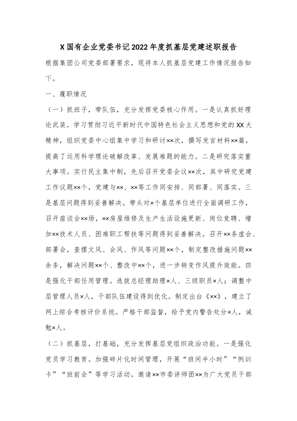 X国有企业党委书记2022年度抓基层党建述职报告根据集团公司党委部署要求,现将本人抓基层党建工作情况报告如下。一、履职情况(一)抓班子,带队伍,充分发挥党委核心作用。一是认真抓好理论武装。学习贯彻习近平新时代中国特色社会主义思想和党的XX大精神,组织党委中心组集中学习和研讨××次,撰写发言材料××篇,提高了运用科学理论破解改革、发展难题的能力。二是研究落实重大事项。实行民主集中制,先后召开党委会议××次,其中研究党建工作议题××个,党建与××、××等工作同安排、同部署、同落实。三是基层问题得到妥善解决。带头对×个基层单位进行全面调研工作,召开座谈会××场,××房屋维修及生产生活设施更新、岗位竞聘、增加××技术人员、困难职工帮扶等问题得到妥善解决。召开××务虚会、部署会,查摆文风、会风、作风等问题××个,制定整改措施问题××余条,解决问题××个、整改中××个,进一步转变作风提升效能。四是强化干部任用管理。选拔总经理助理×人、三级职员×人;调整中层管理人员×人,干部队伍建设得到优化。制定出台《××》,建立了网上综合考核评价系统。严格干部监督,给予党内警告处分×人,诫勉×人。(二)抓基层,打基础,充分发挥基层党组织政治功能。一是强化党员学习教育。加强碎片化时间管理,开展“班间半小时”“例训卡”“班前会”等学习活动。邀请××市委讲师团××为广大党员干部授课,效果良好。二是规范党内组织生活。落实三会一课、主题党日等党内制度,严格按照程序召开民主生活会、组织生活会。全年各支部开展主题党日活动××次、讲党课××次、谈心谈话××人次。设立并落实了党组织工作经费,按时缴纳党员党费××万元。三是强化过硬支部建设。实施“四项工程”,推进过硬支部建设,打造“××”党建品牌。×个支部被集团公司党委评定为“过硬党支部”。推出党员示范岗×个、党员先锋岗1×个、党员责任区×个。(三)抓党建,促发展,实现党建与主业融合互促。一是将《××》作为党建工作新的突破点,在政策宣贯落实、信息传达、工作要求、具体推进等各方面发挥了明显作用。××收入、××任务全部完成。二是创建党员责任区,充分发挥党员先锋模范带头作用,××××。二、存在的问题(一)基层党员学习教育方式还需要进一步灵活。××公司下辖××,××一线党员较多,受××上班方式限制,学习教育方式相对比较单一。下一步,需要在一线党员学习教育上进一步丰富方式,开展主题党日“××、进现场”活动,加大培训力度,进一步提升全体党员政治业务素质和综合能力。(二)对退休、内退老党员的学习管理上还需要进一步加强。退休、内退党员由于居住分散、年龄差异,身体状况等缘故,参加支部学习活动不够主动,有个别党员因为脱离工作岗位,参加组织生活还不够及时。下一步,在退休、内退党员管理上还需要进一步适应新形势的要求,既要实现基层党组织建设要求,又要符合退休老党员的实际,还要体现党组织的关怀。(三)引导新形势下舆论的能力需要进一步增强。随着互联网、手机微信等新兴媒体的应用信息技术的迅速发展,多种媒体融合并存,自由开展讨论的公共言论平台进一步扩大,舆论环境与社会思潮更加复杂多变,在这种情况下,引导新形势下舆论的能力还需要进一步增强,站稳守好××意识形态工作前沿阵地。(四)基层党务工作者队伍建设有待于加强。基层××、中心及××等工作头绪多,任务重,党务工作者均为兼职,一人负责多项工作,党务工作者的素质能力良莠不齐,队伍素质能力有待于加强。下一步,需要采取专业培训方式,通过分类分段培训、形式任务培训、工作专题培训,提升基层党务工作者工作能力,充分利用党务知识指导实践,坚持理论学习和实践锻炼相结合,推动提升基层党组织的战斗力。三、下一步工作思路(一)强化学习、提升素质,在政治建设上强责任。认真学习贯彻习近平新时代中国特色社会主义思想和党的××大精神,加强和改进意识形态工作,增强“四个意识”、坚定“四个自信”、落实“两个维护”,坚决贯彻落实集团公司决策部署。(二)服务基层、重心下移,在组织建设上谋提升。把主体责...