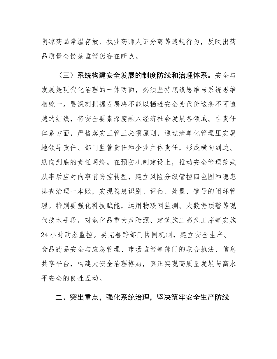 副市长在全市安全生产和食品药品安全工作会议上的讲话各位同志:今天,我们召开全市安全生产和食品药品安全工作会议,主要任务是深入贯彻总书记关于安全生产和食品药品安全的重要指示精神,全面落实省委、省政府决策部署,深刻分析当前形势,部署下一阶段重点工作。下面,我讲三方面意见。一、认清形势,增强底线思维,切实扛起安全发展的政治责任(一)深刻认识当前安全生产形势的严峻性和复杂性。当前,全市安全生产形势虽总体保持稳定,但各类风险隐患仍呈多发、高发态势,呈现出跨领域交织、多因素叠加的复杂特征。从近期风险研判数据来看,危化品、工矿商贸、建筑施工、道路交通等重点领域的风险链条相互交织,形成系统性隐患网络。在危化品领域,部分企业受高温天气影响,对受热易分解物质的管理存在明显疏漏,个别企业甚至出现检维修作业安全规程流于形式、防护措施形同虚设的严重问题;建筑行业的高处坠落、脚手架坍塌等事故风险持续高位运行,暴露出施工现场安全管理标准化水平不足的深层次矛盾;道路交通领域超速行驶、酒后驾驶、疲劳驾驶等违法行为的反复出现,反映出动态监管机制尚存盲区。尤其值得警惕的是,随着汛期来临,强降雨、雷电等极端天气频发,由此引发的矿山边坡失稳、城市地下空间内涝、电力设施过载等次生灾害风险呈现几何级数增长。面对这一形势,必须清醒认识到安全生产工作的极端特殊性,任何细微的疏漏都可能引发灾难性后果,必须始终以归零心态对待每一天的安全工作,彻底摒弃差不多的麻痹思想和不会出事的侥幸心理,将一失万无的危机意识贯穿于监管全过程。(二)全面把握食品药品安全工作的民生属性和社会敏感性。食品药品安全直接关乎人民群众的生命健康权,是社会治理中最具温度、最显担当的民生工程。近期监督抽检结果显示,当前食品安全领域仍存在农药残留超标、非法添加、制假售假等突出问题。x市市场监管局通报的x批次不合格食品为例,部分商超、农贸市场销售的蔬菜水果中检出克百威、戊唑醇等禁用农药残留,暴露出农产品源头管控的薄弱环节;部分小型食品加工场所生产环境脏乱差,违规使用食品添加剂现象屡禁不止,凸显三小业态监管的艰巨性。在药品安全方面,流通环节的冷链断链、温控失效等问题尚未根治,个别零售药店存在阴凉药品常温存放、执业药师人证分离等违规行为,反映出药品质量全链条监管仍存在断点。(三)系统构建安全发展的制度防线和治理体系。安全与发展是现代化治理的一体两面,必须坚持底线思维与系统思维相统一。要深刻把握发展决不能以牺牲安全为代价这条不可逾越的红线,将安全要素深度融入经济社会发展各领域。在责任体系方面,严格落实三管三必须原则,通过清单化管理压实属地领导责任、部门监管责任和企业主体责任,形成横向到边、纵向到底的责任网络。在预防机制建设上,推动安全管理范式从事后应对向事前防控转型,建立风险分级管控四色图和隐患排查治理一本账,实现隐患识别、评估、处置、销号的闭环管理。特别要强化科技赋能,运用物联网监测、大数据预警等现代技术手段,对危化品重大危险源、建筑施工高危工序等实施24小时动态监控。要完善跨部门协同机制,建立安全生产、食品药品安全与应急管理、市场监管等部门的联合执法、信息共享平台,构建大安全治理格局,真正实现高质量发展与高水平安全的良性互动。二、突出重点,强化系统治理,坚决筑牢安全生产防线(一)深化专项整治,坚决消除重点领域风险隐患。在危化品领域,要针对高温、雷电、暴雨等极端天气可能引发的安全风险,全面排查受热易分解、忌水危化品的储存条件,督促企业严格落实降温、通风、防潮等防护措施,确保储存环境符合安全标准。同时,要严格规范异常工况处置和检维修作业流程,强化对试生产企业的安全条件审查,重点打击非法生产、违规操作等违法行为,从源头上消除安全隐患。工矿商贸领域需重点关注矿山边坡稳定性和尾矿库安全,加强实时监测预警,严格执行暴雨天气下的停产撤人制度,防范山体滑坡、溃坝等次生灾害。此外,要深化有限空间作业专项治理,严格落实先通风、再检测、后作业的操作规范,配齐防毒面具、气体检测仪等装备,坚...