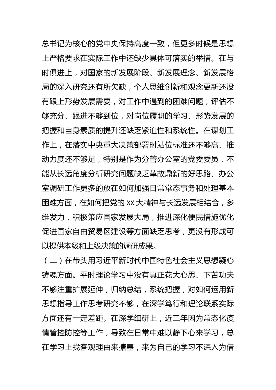 XX基层领导干部2022年度民主生活会对照检查材料根据此次民主生活会的要求,本人认真学习了习近平总书记新时代中国特色社会主义思想和习近平总书记在党的二十届一中全会上的重要讲话精神,原原本本学习了党的XX大报告和新党章,认真研读了《习近平谈治国理政》第四卷,理论根基得到了进一步夯实、政治站位实现了进一步提升。同时广泛征求意见建议,严格对照党的XX大精神和党章党规党纪,从六个方面深入查找差距不足、剖析问题根源、制定整改措施。现将个人对照检查情况汇报如下:一、存在的主要问题(一)在带头深刻领悟“两个确立”的决定性意义,增强“四个意识”、坚定“四个自信”、做到“两个维护”方面。虽能始终自觉做到在思想上政治上行动上同以习近平总书记为核心的党中央保持高度一致,但更多时候是思想上严格要求在实际工作中还缺少具体可落实的举措。在与时俱进上,对国家的新发展阶段、新发展理念、新发展格局的深入研究还有所欠缺,个人思维创新和观念更新还没有跟上形势发展需要,对工作中遇到的困难问题,评估不够充分、跟进不够到位,对岗位履职的学习、形势发展的把握和自身素质的提升还缺乏紧迫性和系统性。在谋划工作上,在落实中央重大决策部署时站位标准还不够高、推动力度还不够足,特别是作为分管办公室的党委委员,不能从长远角度分析研究问题缺乏革故鼎新的好思路、办公室调研工作更多的放在如何加强日常常态事务和处理基本困难方面,在如何把党的XX大精神与长远发展相结合,多维发力,积极策应国家发展大局,推进深化便民措施优化促进国家自由贸易区建设等方面缺乏思考,更没有形成可以提供本级和上级决策的调研成果。(二)在带头用习近平新时代中国特色社会主义思想凝心铸魂方面。平时理论学习中没有真正花大心思、下苦功夫不够注重扩展延伸,归纳总结,系统把握,对如何运用新思想指导工作思考研究不够,在深学笃行和理论联系实际方面还有一定差距。在深学细研上,近三年因为常态化疫情管控防控等工作,导致在日常中难以静下心来学习,总在学习上找客观理由来搪塞,来为自己的学习不深入为借口,更多时候以听讲座代替读原著、学原文总认为别人总结领悟的学起来更省时间,导致学原文不深入也就谈不上悟出自己的心得,悟不懂原理,从而造成对个人对大会精神领会不够透彻,对XX大精神理解不深不细,从而不能更好的用理论指导实践。(三)在带头坚持和加强党的全面领导方面。在党性锤炼上,缺少“吾日三省吾身”的自我拷问,平时虽注重修身养性锻炼党性,但对照党规党章还有一定的差距,做的还不够到位坚持的还不够好,不能经常反躬自省。且在抓党日、党课、组织生活制度等方面也不够严格。在率先垂范上,大是大非问题面前能够始终与党中央保持高度一致,但在一些细枝末节的处理上对自己的要求有所放松,降低自己的标准存在只要自己不违法违纪就可以的心理,没有时刻发挥好一名党员领导干部带头表率的作用。在勇于担当上,在思想上满足于完成任务,满足于已有的工作成绩和现状,满足不出事、不出差错。习惯凭经验看待和解决问题,缺乏奋发有为的锐气和敢于担当的勇气。对待工作中层出不穷的困难和矛盾,“闯”的干劲、“创”的勇气不足。特别是在面对急难险重任务时也会表露出焦躁和厌战情绪,对上级交办的重大任务偶尔有等靠思想。例如在今年在负责的疫情防控和巡视整改等重点工作上,作为党委委员遇到事情没有认真分析原因,查找解决办法,而只是一味的向党委请示、等上级明确,缺乏应有的担当作为。(四)在带头坚持以人民为中心的发展方面。随着年龄的增长、经验的丰富,潜意识里有了“吃老本”的心理,过于强调规矩与程序,没有从更高的标准、更好的成效去思考去研究创新发展和服务基层举措等工作中深层次的问题。在创新发展上,缺乏发展的眼光看人,做事。不善于按照“从群众中来到群众中去”的方法,去破解当前工作中存在的一些难点问题。导致部分工作思路局限、创新不多,深入群众中去听取工作建议不够经常,对一些群众诉求掌握还不全面,回应得还不够及时,成效还不够明显。这次征求意见过程中其它同志也指出了我这方面的问题。在对待同志方面缺...