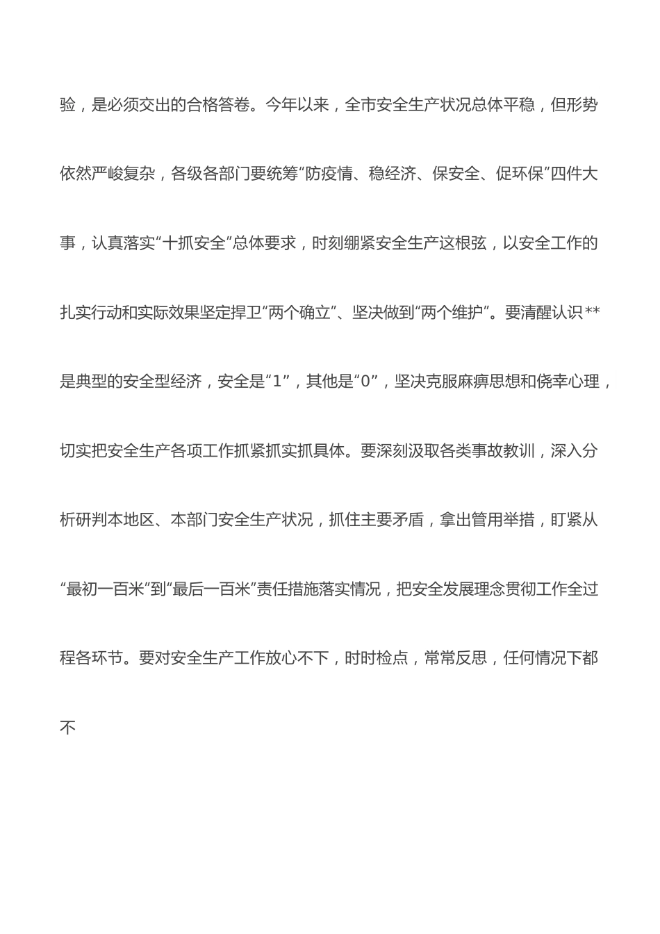 市委书记在安全生产月会议上的讲话同志们:今年是党和国家事业发展进程中十分重要的一年,防控重大安全风险、创造安全稳定环境责任重大。6月是第21个全国“安全生产月”,主题是“遵守安全生产法当好第一责任人”。各级各部门要深入学习贯彻习近平总书记关于安全生产的重要论述和指示批示精神,把安全作为全方位推动高质量发展的基本保障和重要标志,强化底线思维,增强忧患意识,不断提升复杂环境下统筹发展和安全的意识和能力,以“时时放心不下”的责任感担当履责,以实际行动和优异成绩迎接党的二十大胜利召开。一要时刻绷紧安全思想之“弦”。为党的二十大胜利召开创造安全稳定环境,是全市各级党委政府和安全生产战线的重大政治责任,是能力、作风的重大考验,是必须交出的合格答卷。今年以来,全市安全生产状况总体平稳,但形势依然严峻复杂,各级各部门要统筹“防疫情、稳经济、保安全、促环保”四件大事,认真落实“十抓安全”总体要求,时刻绷紧安全生产这根弦,以安全工作的扎实行动和实际效果坚定捍卫“两个确立”、坚决做到“两个维护”。要清醒认识**是典型的安全型经济,安全是“1”,其他是“0”,坚决克服麻痹思想和侥幸心理,切实把安全生产各项工作抓紧抓实抓具体。要深刻汲取各类事故教训,深入分析研判本地区、本部门安全生产状况,抓住主要矛盾,拿出管用举措,盯紧从“最初一百米”到“最后一百米”责任措施落实情况,把安全发展理念贯彻工作全过程各环节。要对安全生产工作放心不下,时时检点,常常反思,任何情况下都不言好、不言过、不言满,下好先手棋、打好主动仗,坚决防止抓而不紧、浮在表面。二要切实扛起安全应尽之“责”。习近平总书记多次强调,当干部不要当得那么潇洒,要经常临事而惧。各级党政主要负责同志要有“如履薄冰、如临深渊”的危机意识,严格按照“党政同责、一岗双责、齐抓共管、失职追责”的要求认真落实《党政领导干部安全生产责任制实施办法》,知责于心、担责于身、履责于行,对本地区存在的重大风险隐患真正做到心中有数,及时协调解决安全生产工作中的困难和问题。行业主管部门要有“居安思危、未雨绸缪”的底线思维,按照“三管三必须”实施细则制定安全生产权力和责任清单,重心下移、工作前移,把精力放在各项防控措施的落实上,有效防止各类“黑天鹅”“灰犀牛”事件发生。各类企业要有“躬身入局、反求诸己”的担当精神,认真组织学习《山西省生产经营单位主要负责人安全生产责任制规定》,建立完善全员、全过程可追溯责任制,盯住关键少数,压实主体责任,推动企业由“要我安全”向“我要安全”转变,从源头上防止和减少事故,形成人人有责、人人尽责的安全生产格局。三要始终坚持问题导向之“要”。各级各部门和各类企业要以防范遏制各类安全生产事故、保护人民群众生命财产安全为目标,坚持把问题导向作为抓安全工作的切入点,全面落实“清单化”管理要求,对本地区、本行业、本企业存在的安全隐患进行全方位、地毯式的大排查、大起底。要树立“隐患就是事故”的理念,把当前最突出问题、最薄弱环节、最大风险隐患作为整治重点,确保措施到位、整改彻底,坚决把风险隐患发现在早、处置在小。要结合安全生产大检查大整治大提升行动和专项整治三年行动,聚焦煤矿、危险化学品、冶金工贸、非煤矿山、消防、油气长输管线、文化旅游、打击非法违法采矿、交通运输、建筑施工、城镇燃气、森林防火、工业园区、危险废物、特种设备、民爆物品、电力、防汛抗旱、地质灾害等19个重点行业领域,扎实开展各类专项整治,坚决防范各类安全生产事故和自然灾害发生。四要坚决亮出打非治违之“剑”。要充分总结、继续运用好“一闭环、两移交、三公开、四承诺、五考核、一调度、一追溯”工作机制,按照“全覆盖、零容忍、严执法、重实效”的要求,加大突击检查、夜查、暗查暗访的力度,采取“四不两直”“双随机”抽查等方式,进行“点穴式”突查、“精准化”打击。对排查发现的各类问题和隐患,严格按照整改责任、措施、资金、时限、预案“五到位”要求推进落实;对非法生产经营建设和存在重大隐患经停产整顿仍未达到要求的,一律关闭...