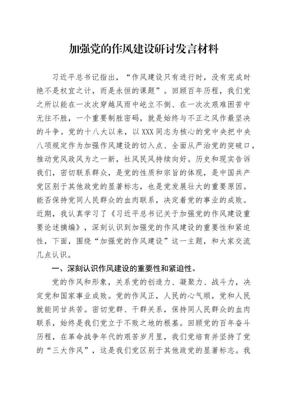 加强党的作风建设研讨发言材料习近平总书记指出,“作风建设只有进行时,没有完成时绝不是权宜之计,而是永恒的课题”。回顾百年历程,我们党之所以能在一次次穿越风雨中屹立不倒、在一次次艰难困苦中无往不胜,一个重要制胜密码,就是始终与不正之风作最坚决的斗争。党的十八大以来,以XXX同志为核心的党中央把中央八项规定作为加强作风建设的切入点、全面从严治党的突破口,推动党风政风为之一新,社风民风持续向好。历史和现实告诉我们,密切联系群众,是党的性质和宗旨的体现,是中国共产党区别于其他政党的显著标志,也是党发展壮大的重要原因。能否保持党同人民群众的血肉联系,决定着党的事业的成败。近期,我认真学习了《习近平总书记关于加强党的作风建设重要论述摘编》,深刻认识到加强党的作风建设的重要性和紧迫性,下面,围绕“加强党的作风建设”这一主题,和大家交流几点认识。一、深刻认识作风建设的重要性和紧迫性。党的作风和形象,关系党的创造力、凝聚力、战斗力,决定党和国家事业成败。党的作风正,人民的心气顺,党和人民就能同甘共苦。密切党群、干群关系,保持同人民群众的血肉联系,始终是我们党立于不败之地的根基。回顾党的百年奋斗历程,在革命战争年代的艰苦岁月里,我们党培育并坚持了党的“三大作风”,这是我们党区别于其他政党的显著标志。我们党之所以能够取得新民主主义革命的胜利,带领人民建立了新中国,原因有很多条,其中重要一条是我们党始终保持同人民群众的血肉联系,最终“用延安作风打败西安作风”。习近平总书记强调:“一切事物都处在变化之中,我们党所面临的环境和党的队伍也处在变化之中。特别是党在全国执政以后,党的执政地位给党员、干部队伍带来的变化也十分明显。”新形势下,我们党脱离群众的危险比过去大大增加,党面临的执政考验、改革开放考验、市场经济考验、外部环境考验是长期的、复杂的、严峻的,精神懈怠危险、能力不足危险、脱离群众危险、消极腐败危险更加尖锐地摆在全党面前。党内脱离群众的现象大量存在,一些问题还相当严重,集中表现在形式主义、官僚主义、享乐主义和奢靡之风这“四风”上,群众深恶痛绝、反映强烈,是损害党群干群关系的重要根源。习近平总书记明确提出,“我们党的执政基础很牢固,但如果作风问题解决不好,也有可能出现‘霸王别姬’这样的时刻”;“执政党如果不注重作风建设,听任不正之风侵蚀党的肌体,就有失去民心、丧失政权的危险”。作为一名党员领导干部,我们要时刻对照党章党规和党的初心使命,经常进行思想上的“体检”,及时清除私心杂念,保持共产党人对党忠诚、人民至上、实事求是、清正廉洁的政治本色。二、认真查摆,找准作风建设的“痛点”。习近平总书记指出,解决“四风”问题,要对准焦距、找准穴位、抓住要害,不能“走神”,不能“散光”。对照中央八项规定精神、对照群众期待,当前作风建设中仍存在一些亟待解决的问题,主要体现在“十个不够”:一是思想认识不够高。部分干部对作风建设的长期性、复杂性认识不足,存在“过关”心态,认为作风建设是“软指标”,与业务工作“两张皮”;有的对上级决策部署“机械执行”,缺乏主动思考和创新意识,有“等靠要”思想。二是调查研究不够深。有的到基层调研走访以完成活动任务为主,不能深入到群众中去发现问题、解决困难,对一些特殊群众的诉求解决的不够及时。有的存在“调而不研、研而不用”的现象,针对调研中发现的共性问题和典型案例,没有从构建长效解决机制的角度,研究分析问题,从而导致有些问题重复发生。三是文风会风不够实。有的会议质量不高,上面开了一个会,下面也套着开一个会,认为不开会不体现重视,以会议落实会议;有地会议冗长空洞,存在“走过场”现象;有的文件会议“改头换面”,使用“白头文件”代替“红头文件”;有的使用微信群通知替代正式发文。四是工作效能不够快。“中梗阻”“慢作为”现象依然存在,有的工作推进“踢皮球”,遇到矛盾绕着走,对历史遗留问题“选择性忽视”;有的存在“指尖上的形式主义”现象,微信群“打卡留痕”“照相留痕”占用大量精力。五是纪律作风要求不够...