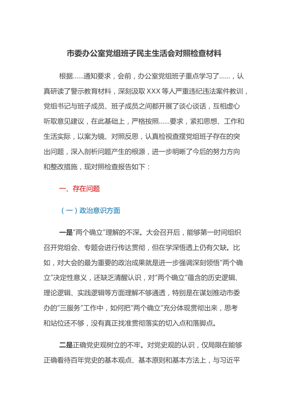 市委办公室党组班子民主生活会对照检查材料根据……通知要求,会前,办公室党组班子重点学习了……,认真研读了警示教育材料,深刻汲取XXX等人严重违纪违法案件教训,党组书记与班子成员、班子成员之间都开展了谈心谈话,互相虚心听取意见建议,在此基础上,严格按照……要求,紧扣思想、工作和生活实际,以案为镜、对照反思,认真检视查摆党组班子存在的突出问题,深入剖析问题产生的根源,进一步明晰了今后的努力方向和整改措施,现对照检查报告如下:一、存在问题(一)政治意识方面一是“两个确立”理解的不深。大会召开后,能够第一时间组织召开党组会、专题会进行传达贯彻,但在学深悟透上仍有欠缺。比如,对大会的最为重要的政治成果就是进一步强调深刻领悟“两个确立”决定性意义,还缺乏清醒认识,对“两个确立”蕴含的历史逻辑、理论逻辑、实践逻辑等方面理解不够通透,特别是在谋划推动市委办的“三服务”工作中,如何把“两个确立”充分体现贯彻出来,思考和站位还不够,没有真正找准贯彻落实的切入点和落脚点。二是正确党史观树立的不牢。对党史观的认识,仅局限在能够正确看待百年党史的基本观点、基本原则和基本方法上,与习近平总书记对正确党史观的重要要求相比,在战略高度、历史深度和全局角度上把握的不够到位。比如,对党史的学习、了解、领会多,在办公室实际工作中,运用、贯彻、落实少,未真正把党史学习成效转化为办公室服务保障工作的实际成果,特别是在疫情严峻的特殊时期、办文办会任务繁重的情况下,遇到难啃的“硬骨头”时,从党史中找经验、寻对策还不够,发挥党史的“教科书”“营养剂”作用不充分。(二)理想信念方面一是升华信仰信念不够。面对日益繁重的工作任务,个别班子成员有时存在畏难情绪,信心信念不足,站位不够高,眼界不够宽,办法不够多,工作动力、工作劲头都不足。比如,面对今年复杂多变的国际国内形势,提高历史和战略眼光看问题、做决策不够,有时仅局限于做好本分工作,对网络上社会上出现的负面言论,也只是满足于不听不传不信,在带头弘扬正能量、开展正面宣传上发挥作用十分有限,只是市委办党组会传达,主动在办公室上下和自己的“朋友圈”宣传正能量的积极性和能动性不足。二是强化思想武装不够。对习近平新时代中国特色社会主义思想的整体性把握存在差距,存在急用急学、现用现学、畸轻畸重的问题。比如,学习内容主要集中在习近平总书记重要讲话、党中央重大会议、党内政策法规等方面,对与市委办工作相关的内容学习多,高质量发展、经济运行、改革创新、乡村振兴等内容学习相对较少,反映出学习还不够全面系统。对XX大提出“坚持问题导向”“坚持系统观念”理论不深、融入不够,在谋划开展具体工作时从中找方向、找答案、找方法的本领还不强,没有真正做到水乳交融、融会贯通。(三)纪律作风方面一是对全办干部的教育管理还需加严。能够把加强教育管理作为提升办公室工作质量和服务效能的有力抓手,对在班在岗、干部履职、自身学习等情况加强检查,但对照D章党规,还存在不足之处。比如,对办公室党员干部的日常管理还不深不细,对干部八小时以外行为情况还缺乏全面了解,在严明纪律、狠抓执行上还缺乏硬举措、硬抓手,没有真正做到常抓长管、真管真严,压紧压实班子成员“一岗双责”责任做得不够深入到位。二是畅通基层和群众的监督渠道还需加力。按照市委部署要求,在牵头制定市委名义或市委办名义的有关文件、方案、意见过程中,在畅通基层和广大党员群众的民主渠道方面还有差距。比如,虽然有时在出台重大文件方案之前,在更大的范围内征求了意见,但专业性较强的问题听取专家意见、进行深入评估、开展听证工作还不充分,还有极少部分基层和党员的意见和建议没有得到充分和全面的反映,来自基层群众的好想法好意见没有第一时间得到有效解决。(四)自身建设方面一是强化讲政德、修政德存在差距。比如,虽然对反面典型案例深受警醒、深恶痛绝,但有时也片面认为,干部在德行方面的问题,属于私德,还没有真正上升到政德、大德、公德的高度去思考,对讲政德修政德的认识还不够到位,采取举措加强政德教育的招法不...