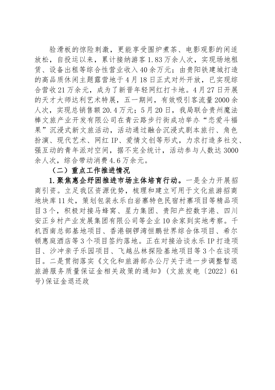 区2023年上半年旅游产业化工作总结一、主要指标及重点工作推进情况(一)主要指标推进情况1.游客人均花费。2023年1-4月XX区实现游客人均花费1482.98元,完成绝对值位列全市第1。2.过夜游客及增速。2023年1-4月过夜游客实现215.56万人次,同比增速38.79%,完成绝对值位列全市第1。3.限额以上住宿业营业额增速。2023年1-4月限上住宿业完成营业额1.90亿元,同比增速25.3%。1-5月限上住宿业预计完成营业额2.39亿元,同比增速25.5%。4.限额以上餐饮业营业额增速。2023年1-4月限上餐饮营业额完成2.7亿元,同比增速16.9%。1-5月限上餐饮营业额预计完成3.4亿元,同比增速15.8%。5.旅游业态创新升级成效。今年以来,我区紧扣爽眼、爽口、爽心、爽身、爽购、爽游六爽行动,以“甲秀XX新玩法”为主题,以市场为导向,聚焦提高GDP贡献率、提高旅游过夜人数及旅游人均消费等,联合辖区内星级酒店、旅行社、文化娱乐企业等涉旅市场主体,积极探索潮流文旅新玩法,让游客感受消费新体验。策划推出了天才大师达利艺术特展、露营、创意花展等体验性强的时尚化新业态。其中由贵州华兴实业开发有限公司投资建设的贵阳首家陆冲室内滑板场——skateevent板场(火车站地铁口A出口旁)已于今年1月份正式投运,在这里不仅可以体验滑板的惊险刺激,更能享受围炉煮茶、电影观影的闲适放松,自投运以来,累计接纳游客1.83万余人次,实现场地租赁、设备出租等综合性营业收入40余万元;由贵阳铁建城打造的高品质休闲主题露营地于4月18日正式对外开放,已实现综合营收21万余元,成为了新晋年轻网红打卡地。4月27日开展的天才大师达利艺术特展,五一期间,有效吸引客流量2000余人次,实现总销售额20.4万元;5月20日,我局联合贵州魔法棒文旅产业开发有限公司在青云路步行街成功举办“恋爱斗福果”沉浸式新文旅活动,活动通过融合沉浸式剧本旅行、角色扮演、现代艺术、网红IP、爱情文创等形式,力求打造多社交、强互动的青年派对空间,据不完全统计,活动参与人数达3000余人次,综合带动消费4.6万余元。(二)重点工作推进情况1.聚焦惠企纾困推进市场主体培育行动。一是全力开展招商引资。立足我区资源优势,梳理和建立可用于文化旅游招商地块库11处,策划包装永乐白岩寨特色民宿村寨项目等精品项目3个,积极对接马蜂窝、星力集团、贵阳产控数字港、四川安正乡村产业发展集团有限公司等企业10余家到实地考察。千机西南总部基地项目、香港铜锣湾恒鹏世界综合体项目、希尔顿惠庭酒店等3个项目签约落地。正在对接洽谈永乐IP打造项目、沙冲亲子乐园项目、飞越丛林探险基地项目等3个在谈项目。二是贯彻落实《文化和旅游部办公厅关于进一步调整暂退旅游服务质量保证金相关政策的通知》(文旅发电〔2022〕61号)保证金退还政策。积极主动给旅游社宣传讲解保证金暂退范围及要求,帮助辖区内旅行社准备退还保证金所需材料,尽快帮助企业完成保证金退还。目前我区已有188家旅行社暂退旅游服务质量保证金,暂退金额达972万元,其余旅行社正在提交暂退材料,等待银行分批划账;三是积极帮助我区旅游企业申报省旅游产业投资基金、政府专项债等政策支持,助力旅游行业纾困,扩大企业流动资金,提升企业恢复生产、研发能力,推进企业规范化、标准化、品牌化发展。帮助全民健身中心建设项目等3个项目争取2023年新增政府专项债券资金,拟争取额度44,658万元,目前均已完成专项债券项目穿透式监测系统基础库、需求库、储备库等信息录入,待国家有关部门审核通过。帮助全民健身中心项目申请中央预算内资金,拟申请金额2000万元,目前已完成资料提交,待省体育局审核通过。按照贵州省文化旅游产业投资基金项目遴选标准及申报指南(试行),储备符合基金申请范围项目5个,项目总投资共计73.06亿元,拟争取基金支持额度13.76亿元,目前均已纳入市级基金储备库;四是做好市场主体培育工作,今年我区限上住宿企业上限目标10家,文化体育、娱乐业上规目标2家,我局加强与市监、税务部门协调沟通配合,采取帮助企业协调解决缓交酒店租金、发放文旅消费券、鼓励企业扩展业务产品等措施,尽可能的帮助企业扩大产能、提升产值。截至目前,已培育新增...