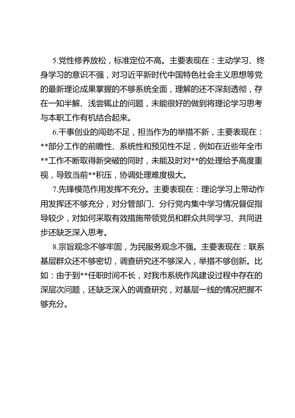 某银行系统主题教育专题民主生活会班子成员相互批评意见1.党性修养不够强。理论学习的紧迫感和危机感不强,比较满足于一般性学习,带着问题学、深入思考学做得还不够。比如在学习过程中,较少把习近平新时代中国特色社会主义思想与**高质量发展有机结合起来,在学懂、弄通、做实上需要再加强。2.在工作中,敢闯敢试、攻坚克难的改革创新精神不够突出,比如在落实行业高质量发展战略时,对分管工作的超前思考谋划还不够深入,我市**各项指标还处于比较落后的局面;在吸收其他行业、其他单位好的经验做法,开阔工作思路上仍需进一步加强。3.强化理论武装、坚定理想信念的自我要求不够严格。个人学习方面仍然存在一定的“实用主义”倾向,系统学习理论不多,一定程度上满足于“会上讲”、“稿上念”,联系工作实际潜心思考、运用理论指导实践仍不够充分。4.责任担当不够强烈。在抓好队伍建设上欠缺行之有效的方法和超前部署的思维,特别是在如何打造一支适应高质量发展要求的人才队伍上方法不多、成效不够明显,全市系统专业技术队伍建设及发展通道设置进展缓慢,对于***建设的谋划还不够深。5.党性修养放松,标准定位不高。主要表现在:主动学习、终身学习的意识不强,对习近平新时代中国特色社会主义思想等党的最新理论成果掌握的不够系统全面,理解的还不深刻透彻,存在一知半解、浅尝辄止的问题,未能很好的做到将理论学习思考与本职工作有机结合起来。6.干事创业的闯劲不足,担当作为的举措不新,主要表现在:**部分工作的前瞻性、系统性和预见性不足,例如在近些年全市**工作不断取得新突破的同时,未能及时对**的处理给予高度重视,导致当前**积压,协调处理难度极大。7.先锋模范作用发挥不充分。主要表现在:理论学习上带动作用发挥还不够充分,对分管部门、分行党内集中学习情况督促指导较少,对如何采取有效措施带领党员和群众共同学习、共同进步还缺乏深入思考。8.宗旨观念不够牢固,为民服务观念不强。主要表现在:联系基层群众还不够密切,调查研究还不够深入,举措不够创新。比如:由于到**任职时间不长,对我市系统作风建设过程中存在的深层次问题,还缺乏深入的调查研究,对基层一线的情况把握不够充分。9.在抓实理论学习上还存在差距。在学习习近平新时代中国特色社会主义思想学原著、读原文、悟原理做得还不够,缺乏深入研究和思考,没有很好地处理好工学矛盾。政治理论学习的系统性、主动性还有待进一步加强,一定程度上存在以业务工作代替理论学习的现象。例如日常事务多,理论学习多是通过学习中心组集中学习、传达文件、听取报告等方式进行,个人自学相对较少,对一些热点、焦点问题,缺乏深层次互动和思想交流,理论联系实际不深、不透。10.作为党委书记,担当作为方面还存在一些差距。例如,虽然对班子的理论学习抓得比较紧、比较实,但对基层单位、部门的理论学习检查指导还不够,理论学习上下同步、齐头并进的效果还需要进一步加强。11.主动服务群众的自觉性还有待进一步加强,宗旨意识有所淡薄,群众观念有所模糊。需要时刻牢记为民服务的宗旨,树牢正确政绩观,扎扎实实地开展调研,在调研中做到真正深入基层深入群众,多听、多看、多问、多学,掌握第一手资料,了解基层最真实情况,解决实际问题。例如,平时多忙于具体的事务性工作,深入基层不够,对基层情况掌握不深不细,对指导推动高质量发展大胆探索的方式方法较少。12.在担当意识、担当能力方面需要进一步加强。工作落实力度不够,具体的工作计划,时而因为这样那样的原因而得不到落实,使得工作效果大打折扣。例如,**项目建设工作进展较慢,推进力度仍需加强。13.在抓实理论学习上还存在差距,理论学习上不够深入系统,理论指导实践工作方面还有待进一步加强。需要紧密结合工作实际,全面、系统、深入地学习习近平新时代中国特色社会主义思想及其讲话精神,理解和把握新方法、新应用,做到学用结合、学以致用,真正使政治理论成为指导行动的“指南针”,达到学以致用的目的。例如,如何做好理论知识与**新形势相结合方面还有待进一步加强。14.在担当意识、担当能力方面需要进一步加强。作为主抓...