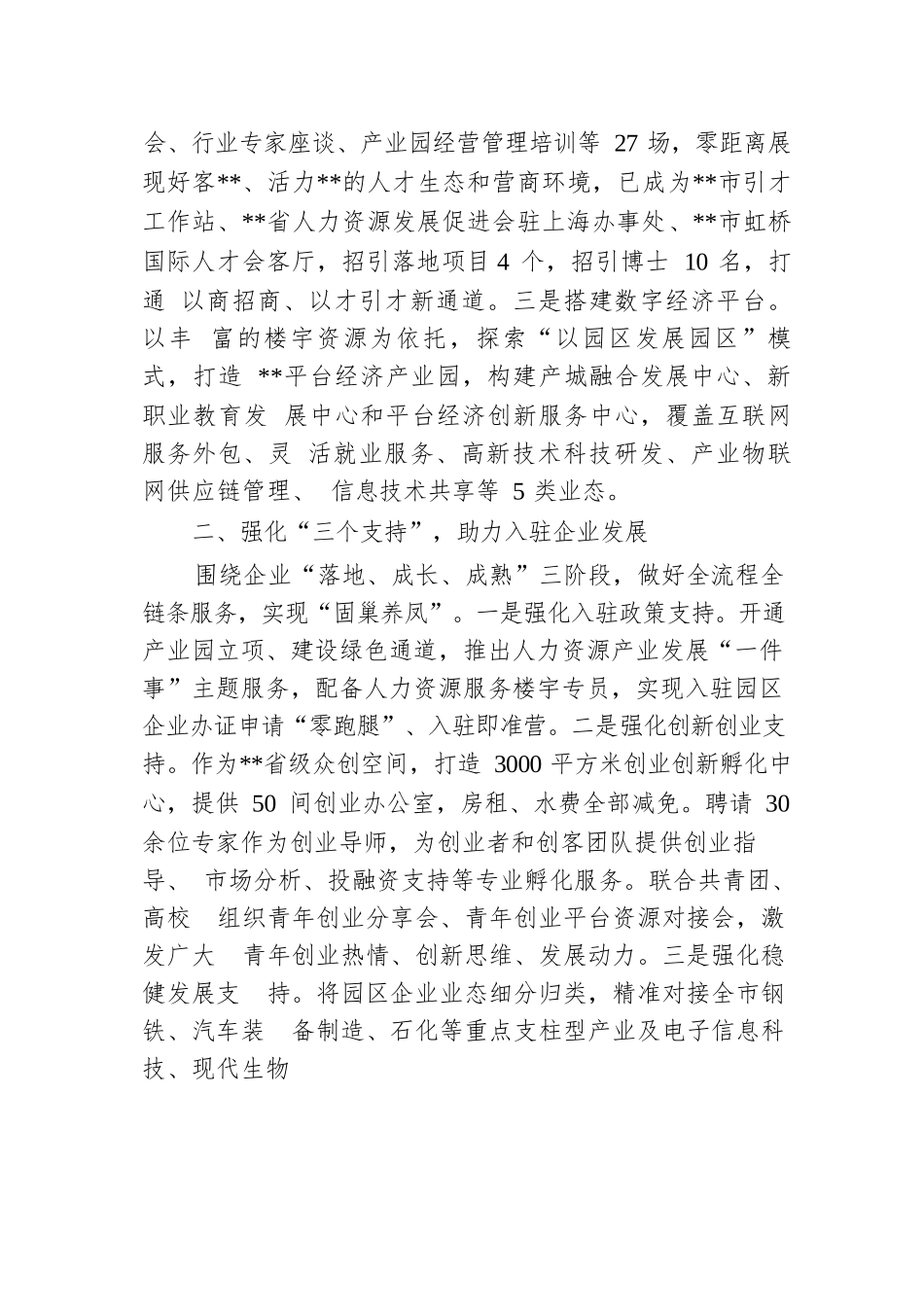 在2024年省级人力资源服务产业园建设专题推进会上的汇报发言尊敬的各位领导,同志们:习近平总书记强调,要加快塑造素质优良、总量充裕、结构优化、分布合理的现代化人力资源,解决好人力资源供需不匹配这一结构性矛盾。近年来,**市以人力资源服务产业园为载体,探索现代化人力资源供需对接机制,建强人力资源服务链点、优化人才服务工作面、壮大产才融合体,不断推动高质量充分就业。2018年开园以来,已入驻中智集团、上海外服、**杰出人才发展集团等知名企业83家,孵化创业企业94家,新增就业岗位1300多个,服务求职者20万人次,为全国1万多家企业提供近40万次服务,被评为“省级人力资源服务产业园”,连续两年在**省省级人力资源产业园综合评估中获评优秀等次。一、搭建“三个平台”,提升园区承载能力立足人力资源服务传统业务,布局数字经济、平台经济等新业态,加快“筑巢引凤”。一是搭建集成服务平台。实行政府主导、协会引领、市场化运营,对标国家级人力资源服务产业园,规划公共服务、创业孵化、人才人力服务、企业配套服务四大功能区,为入驻企业、人才等提供高效快捷的“一站式”人力资源服务。二是搭建招商引才平台。在上海虹桥国际商务人才港设立**人才会客厅,累计举办招商推介会、行业专家座谈、产业园经营管理培训等27场,零距离展现好客**、活力**的人才生态和营商环境,已成为**市引才工作站、**省人力资源发展促进会驻上海办事处、**市虹桥国际人才会客厅,招引落地项目4个,招引博士10名,打通以商招商、以才引才新通道。三是搭建数字经济平台。以丰富的楼宇资源为依托,探索“以园区发展园区”模式,打造**平台经济产业园,构建产城融合发展中心、新职业教育发展中心和平台经济创新服务中心,覆盖互联网服务外包、灵活就业服务、高新技术科技研发、产业物联网供应链管理、信息技术共享等5类业态。二、强化“三个支持”,助力入驻企业发展围绕企业“落地、成长、成熟”三阶段,做好全流程全链条服务,实现“固巢养凤”。一是强化入驻政策支持。开通产业园立项、建设绿色通道,推出人力资源产业发展“一件事”主题服务,配备人力资源服务楼宇专员,实现入驻园区企业办证申请“零跑腿”、入驻即准营。二是强化创新创业支持。作为**省级众创空间,打造3000平方米创业创新孵化中心,提供50间创业办公室,房租、水费全部减免。聘请30余位专家作为创业导师,为创业者和创客团队提供创业指导、市场分析、投融资支持等专业孵化服务。联合共青团、高校组织青年创业分享会、青年创业平台资源对接会,激发广大青年创业热情、创新思维、发展动力。三是强化稳健发展支持。将园区企业业态细分归类,精准对接全市钢铁、汽车装备制造、石化等重点支柱型产业及电子信息科技、现代生物医药等新兴产业,打造“北斗七星服务产品清单”,涵盖招聘、派遣、外包、猎头、薪酬设计、管理咨询、人力资源大数据等服务。开展“HR人才辈出大讲堂”“劳动法务大讲堂”“税务大讲堂”等讲座63期,提供超7000人次的培训、文化、交流服务,助推企业依法依规高质量发展。三、探索“三种模式”,推动就业提质增效通过政府搭台、企业参与、高效对接等方式,优化人力资源匹配,促进高质量就业。一是创新“人单匹配”就业模式。借鉴“海尔集团”提出的“人单合一”模式,搭建线上“人单匹配”互联网平台,实现线下人力资源服务项目的线上发售与转售,累计为3000多家企业匹配25.4万人次就业岗位。2022年人力资源数字管理平台升级为杰出云APP,上线仅一年就服务50多个城市,注册会员10万人。二是探索残疾人职业培训。建设国家级残疾人职业培训基地,开设智慧楼宇、电工、保育师、育婴师、面点师等10余种培训课程,实施“人力资源平台+闭环式培训就业”培训模式,专设按摩实践教室、直播学习教室、直播间、无障碍生活样板间等,帮助残疾人提升生活自理能力和就业创业本领。截至目前,实训基地先后帮助1000多名残疾人成功就业,其中四位听障残疾人创办的“无声面馆”被媒体广泛宣传报道,实现了良好的社会效果。三是开拓数字零工市场。上线“**职码头”数字零工市场,涉及加工制造业、建筑房地产、交通...