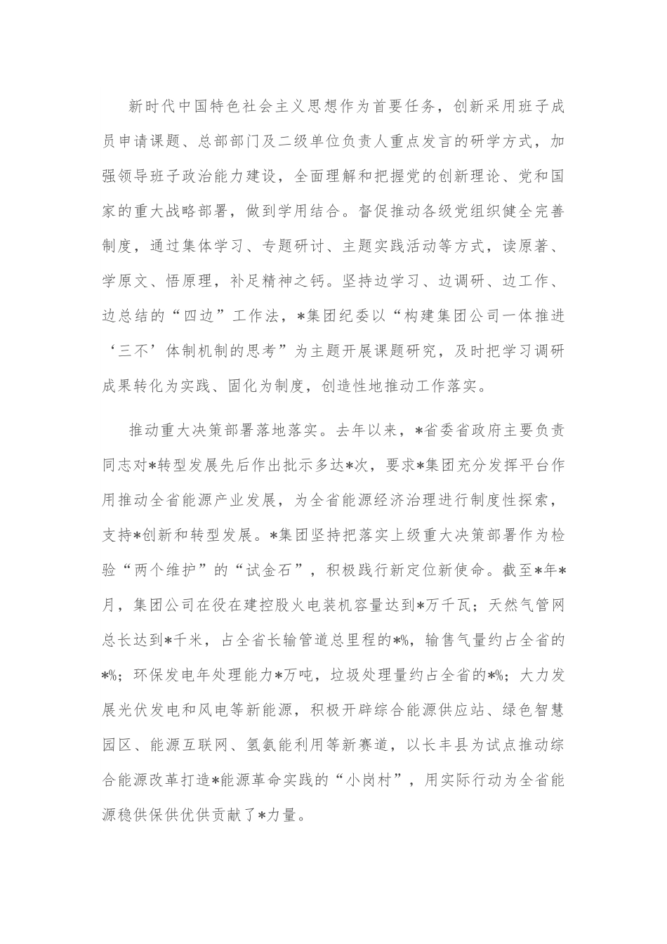 国企党建经验交流:坚决扛起管党治党政治责任护航企业绿色转型发展*集团深学细悟习近平总书记重要讲话和指示批示精神,坚决扛起管党治党政治责任,充分发挥全面从严治党的引领保障作用,大力营造风清气正的政治生态,为*实现能源战略转型和“双碳”目标贡献*力量。一、强化政治引领,用实际行动推动重大决策部署落地落实*集团把对党忠诚作为兴企之魂,坚持用党的创新理论引领集团改革发展方向,努力在立足新发展阶段、贯彻新发展理念、构建新发展格局中展现国企担当作为。旗帜鲜明加强党的政治建设。*集团自觉将全面从严治党融入全面深化改革、全面战略转型、全面依法治企,将党建和党风廉政建设作为“十四五”规划的重中之重谋划部署。坚持对标对表,持续跟进学习习近平总书记关于“四个革命、一个合作”能源安全新战略和“碳达峰、碳中和”重要讲话指示精神等,心怀“国之大者”,坚持“54321”发展思路和“稳中求进、聚焦突破、打桩布局、争先进位”总方针,推动项目开发、产业结构调整、科技创新、市场开拓等不断取得新成效,加快提升承接省委省政府战略任务和产业意志的能力,坚决做到“总书记有号令、党中央有部署、*见行动、*起作用”。用党的创新理论指导实践。坚持将学习习近平新时代中国特色社会主义思想作为首要任务,创新采用班子成员申请课题、总部部门及二级单位负责人重点发言的研学方式,加强领导班子政治能力建设,全面理解和把握党的创新理论、党和国家的重大战略部署,做到学用结合。督促推动各级党组织健全完善制度,通过集体学习、专题研讨、主题实践活动等方式,读原著、学原文、悟原理,补足精神之钙。坚持边学习、边调研、边工作、边总结的“四边”工作法,*集团纪委以“构建集团公司一体推进‘三不’体制机制的思考”为主题开展课题研究,及时把学习调研成果转化为实践、固化为制度,创造性地推动工作落实。推动重大决策部署落地落实。去年以来,*省委省政府主要负责同志对*转型发展先后作出批示多达*次,要求*集团充分发挥平台作用推动全省能源产业发展,为全省能源经济治理进行制度性探索,支持*创新和转型发展。*集团坚持把落实上级重大决策部署作为检验“两个维护”的“试金石”,积极践行新定位新使命。截至*年*月,集团公司在役在建控股火电装机容量达到*万千瓦;天然气管网总长达到*千米,占全省长输管道总里程的*%,输售气量约占全省的*%;环保发电年处理能力*万吨,垃圾处理量约占全省的*%;大力发展光伏发电和风电等新能源,积极开辟综合能源供应站、绿色智慧园区、能源互联网、氢氨能利用等新赛道,以长丰县为试点推动综合能源改革打造*能源革命实践的“小岗村”,用实际行动为全省能源稳供保供优供贡献了*力量。二、凝聚合力织牢织密监督“一张网”,不断提升监督治理效能*集团不断探索监督的有效形式和途径,通过监督促进依规依纪依法治企,推动监督从“有形”向“有效”转变。推深做实“大监督”工作。坚持将健全和完善大监督体系作为全面从严治党重要任务,制定“*年强基础、*年抓规范、*年见成效”的目标,通过*年时间推动大监督工作有力有效运转。建立集团内部监督委员会,制定工作实施细则,以政治监督为统领,融合贯通党委巡察监督、纪委专责监督、职能部室一线监督、职工群众监督。坚持“分层分工负责、协同开展监督、强化结果运用、督促闭环管理”*字工作思路,凝聚监督合力,提升监督质效。开展监督规范化建设,集团总部各部室梳理业务监督制度*项,制定《制度执行情况的监督检查办法》,确保权力运行全程留痕、处处受监督。推动政治监督具体化常态化。*集团纪委列出*方面*项“常态+动态”清单内容,确保政治监督紧扣形势任务要求和重点工作,及时发现解决贯彻落实中的温差偏差落差问题。加强对“一把手”和领导班子的监督,定期对集团领导班子及成员进行政治“画像”,综合分析研判集团政治生态的整体状况。贯彻《党委(党组)落实全面从严治党主体责任规定》要求,建立各级党组织运用第一种形态情况台账。制定《关于加强对“一把手”和领导班子监督的具体措施》,建立上级“一把手”对下级“一把手”进行谈话提醒、上级纪委与下...