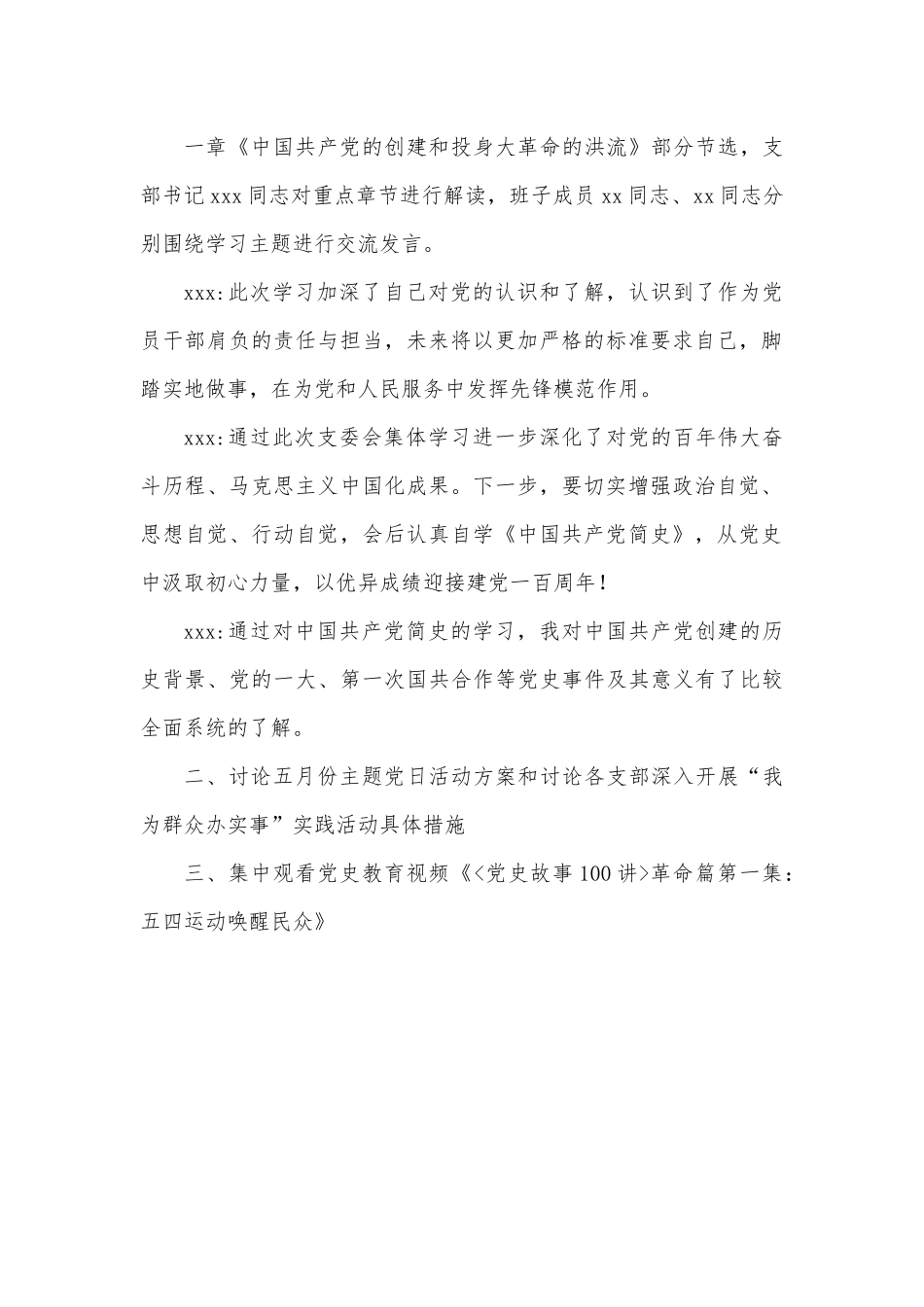 2021年4月份支委会会议记录会议时间:2021.4.18会议地点:支部党员之家参会人员:xxx、xxx、xxx、xxx(要记录姓名)缺席人员:无(如有,请写明缺席原因)列席人员:无(如有,请记录姓名)主持人:书记xxx记录人员:组织委员xxx一、会议议题:1、集体学习《中国共产党简史》第一章《中国共产党的创建和投身大革命的洪流》部分节选2、讨论五月份主题党日活动方案3、讨论各支部深入开展“我为群众办实事”实践活动具体措施4、集中观看党史教育视频《<党史故事100讲>革命篇第一集:五四运动唤醒民众》二、会议记录:党支部书记xxx主持会议:根据支部工作安排,今天我们召开1月份支委会,会议应到委员7名,实到7名,0人缺席,到会人数超过应到会人数的半数,符合法定人数要求,可以开会。会前,支委委员在充分沟通的情况下确定了4项议题,并将会议要求和相关学习资料提前发给大家做了会前准备。首先进行第一项议题:支委会集中学习《中国共产党简史》中第一章《中国共产党的创建和投身大革命的洪流》部分节选,支部书记xxx同志对重点章节进行解读,班子成员xx同志、xx同志分别围绕学习主题进行交流发言。xxx:此次学习加深了自己对党的认识和了解,认识到了作为党员干部肩负的责任与担当,未来将以更加严格的标准要求自己,脚踏实地做事,在为党和人民服务中发挥先锋模范作用。xxx:通过此次支委会集体学习进一步深化了对党的百年伟大奋斗历程、马克思主义中国化成果。下一步,要切实增强政治自觉、思想自觉、行动自觉,会后认真自学《中国共产党简史》,从党史中汲取初心力量,以优异成绩迎接建党一百周年!xxx:通过对中国共产党简史的学习,我对中国共产党创建的历史背景、党的一大、第一次国共合作等党史事件及其意义有了比较全面系统的了解。二、讨论五月份主题党日活动方案和讨论各支部深入开展“我为群众办实事”实践活动具体措施三、集中观看党史教育视频《<党史故事100讲>革命篇第一集:五四运动唤醒民众》支部委员集中观看党史教育视频《<党史故事100讲>革命篇第一集:五四运动唤醒民众》,该视频通过追寻历史记忆,深入了解时代背后的故事,加深我们对五四运动历史意义和时代价值的认识。历史表明,五四运动促进了各阶层民族意识的觉醒,为中国共产党的创建拉开了序幕,开启了中华民族复兴的伟大篇章。回顾革命史实,大家思想深受洗礼,被先烈们不屈不挠的斗争精神、坚定的革命信仰、无畏的奉献精神、深深的爱国情怀所感染。