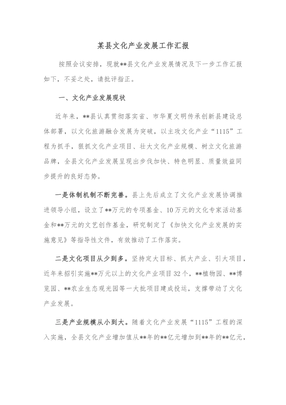 某县文化产业发展工作汇报按照会议安排,现就**县文化产业发展情况及下一步工作汇报如下,不妥之处,请批评指正。一、文化产业发展现状近年来,**县认真贯彻落实省、市华夏文明传承创新县建设总体部署,以文化旅游融合发展为突破,以主攻文化产业“1115”工程为抓手,狠抓文化产业项目、壮大文化产业规模、树立文化旅游品牌,全县文化产业发展呈现出步伐加快、特色明显、质量效益同步提升的良好态势。一是体制机制不断完善。县上先后成立了文化产业发展协调推进领导小组,设立了**万元的专项基金、10万元的文化专家活动基金和**万元的文艺创作基金,研究制定了《加快文化产业发展的实施意见》等指导性文件,有效推动了工作落实。二是文化项目从少到多。坚持定大目标、抓大产业、引大项目,近年来招引实施**万元以上的文化产业项目32个,**植物园、**博览园、**农业生态观光园等一大批项目建成投运,支撑带动了文化产业发展。三是产业规模从小到大。随着文化产业发展“1115”工程的深入实施,全县文化产业增加值从**年的**亿元增加到**年的**亿元,年均增速达到了31.5%,占GDP的比重由1.2%提高到了3%;文化产业法人单位达到**个、个体经营户达到1300户。四是品牌影响逐步显现。挖掘文化资源,围绕产业发展、品牌打造,每年策划举办湿地文化艺术节、农耕文化艺术节、奇石文化论坛等文化节会活动20余场次,为文化产业发展搭建平台、创新载体,带动了全县文化旅游蓬勃发展,推动了肃州文化由县内影响县外。虽然近些年,我县文化产业发展取得了一些成效,但与市委、市政府的要求和兄弟县市竞相发展的势头相比还有一定差距,突出表现在:一是文化产业主体少,市场竞争力不强。具有业内领军地位及辐射带动能力的文化企业少,形成产值少,缺乏竞争力。二是文旅融合程度低,整体影响不大。对文化旅游资源缺乏必要的整合、开发、包装和利用。三是专业人才匮乏,文化创新力不足。懂经营、有创意、会管理的文化人才奇缺,文化的创新发展能力不强。二、今后发展的思路打算今后,我县将认真贯彻市委“五个**”建设目标,紧紧围绕全市“1356”文化工作思路和“六个十大”旅游工程总体部署,以打造“文化旅游特色城市”为目标,充分挖掘特色文化和湿地等自然资源优势,以差异化、特色化、品牌化发展为主线,以文化旅游融合发展为突破,突出抓好产业项目引建、重点景区打造、文旅小镇培育、节会赛事举办、文旅商品开发等工程,力争将**县建成**东片县文化旅游核心县和全市文化旅游集散地。一是主攻重点项目,培育文化产业集群。加大招商力度,强化项目支撑,今年计划投资12亿元,组织实施**生态文化产业园、**主题乐园、**奇石博览园、**故事文化创意产业园、**雨露水世界等重点产业项目**个,确保年内文化产业增加值达到7亿元,增长30%以上。立足特色文化资源,研究文化产业政策,把握国家和省上投资导向,力争今年再招引3-5个投资大、带动力强、特色鲜明的文化旅游产业项目。围绕航天文化主题,谋划实施梦幻太空航天航空博览园等主题项目,力争年内完成项目论证策划工作。依托项目实施,加快扶持和培育一批文化产业发展骨干企业,形成文化产业发展集群,为文化产业发展提供强有力支撑。二是坚持文旅融合,建设文化旅游景区。按照全域旅游发展理念,深入挖掘丝路文化、航天文化、边塞文化等优质文化资源,进行系统规划和连片开发,连点成线、串珠成链,聚合形成县域整体优势。加快建设湿地大景区,围绕**等湿地资源,开工一批建设项目,年内力争完成湿地景观大道**等建设。按照A级景区标准,完善景区标识、游客中心、停车场等服务设施,进一步提升景区服务能力。坚持文化支撑、旅游带动、互促融合,今年重点提升改造**植物园等3个市上确定的重点景区,力争**植物园年内创建为4A级景区。三是突出地域特色,发展乡村文化旅游。按照特色鲜明、功能完善、产业集聚、示范效应明显的标准,深入挖掘县域产业、自然风貌、文化民俗和资源优势,建设一批文化旅游特色小镇和专业村,推动乡村文化旅游发展。今年结合农村环境综合整治,重点完成**文化旅游小镇等5个特色文化旅游小镇创建工作,重点打造**等4个旅...