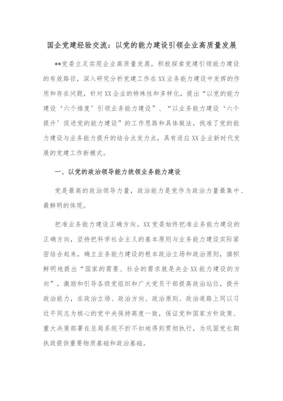 国企党建经验交流:以党的能力建设引领企业高质量发展**党委立足实现企业高质量发展,积极探索党建引领能力建设的有效路径,深入研究分析党建工作在XX业务能力建设中发挥的作用和存在问题,针对XX企业的特殊性和多样化,提出“以党的能力建设‘六个维度’引领业务能力建设”、“以业务能力建设‘六个提升’促进党的能力建设”的工作思路和具体做法,找准了党的能力建设与业务能力提升的结合点发力点,具有适应XX企业新时代发展的党建工作新模式。一、以党的政治领导能力统领业务能力建设党是最高的政治领导力量,政治能力是党作为政治力量最集中、最鲜明的体现。把准业务能力建设正确方向。XX党委始终把准业务能力建设的正确方向,坚持把科学社会主义的基本原则与业务能力建设实际紧密结合起来,确立业务能力建设的根本政治立场和政治原则,旗帜鲜明地提出“国家的需要、社会的需求就是央企XX能力建设的方向”,激励和引导各级党组织和广大党员干部提高政治站位,提升政治能力,在政治立场、政治方向、政治原则、政治道路上同以习近平同志为核心的党中央保持高度一致,保证党和国家方针政策、重大决策部署在总局系统不折不扣地得到贯彻执行,为巩固党长期执政提供重要物质基础和政治基础。系统谋划业务能力建设大局。牢牢把握“国之大者”,锚定党中央擘划的宏伟蓝图,着眼于打造具有核心竞争力的世界一流地质与生态文明建设企业集团、实现“三个地球”建设战略愿景,坚定践行习近平生态文明思想,服务于国家能源矿产战略,立足于为国家寻找矿产资源、新能源,制定了“11463”总体发展战略,即围绕一个目标:通过实施创新驱动战略,打造新型能源矿产领域具有核心竞争力的资源型企业集团;坚持一个理念:以市场为导向,以客户为中心,以科技创新为引领;确立“四商”定位:地质及地理信息技术服务商、新型能源矿产开发商、建设工程承包商、城市建设运营商;实施六大举措:突出创新驱动、深化改革改制、优化资源配置、强化经营管理、推进资本运营、推动合作共赢;强化三项保障:党的建设、文化凝聚、机制导向,不断做强做优做大,实现健康、可持续、跨越式发展。不断开发新型矿产资源。总局紧紧围绕国家经济结构调整以及“一带一路”等国家战略推进实施带来的能源、矿产资源需求结构变化,紧扣业务能力建设短板深入基层调查研究,围绕企业生存能力、运行能力、变革能力等,打造资源勘查、新能源资源开发、生态与环境、地理信息、地下工程、农业地质以及辅助产业,推动资源勘查传统主业向国家急需的新能源、新材料和战略性矿产资源领域转变。二、以党的思想引领能力指导业务能力建设党的思想引领是无形的力量,精髓是解放思想、实事求是、与时俱进,其实质和核心是实事求是,其本质要求是解放思想。以党的创新理论指导业务能力建设。总局各级党组织坚持学懂弄通做实用好指引全党践行初心使命的强大武器,教育引导党员把活学活用习近平总书记重要论述、重要讲话和指示批示,作为破解企业改革发展党建难题的着力点,学思想、学方法,找思路、找答案,不断推动学习成果转化,进一步提升党员干部引领发展、科学决策和驾驭风险能力。制定出台了《关于推动高质量发展的指导意见》,提出了阶段性发展目标和推动高质量发展的实招硬招。XX局布局“一带一路”,推进军民融合,在融入“一带一路”发展战略的大舞台上努力书写新篇章;XX集团创新投融资模式,发行投资债券,转型发展插上“金融翅膀”;XX破解发展难题,积极谋划推进“科创板”上市,以资本市场助力科技创新,推动产业发展;XX作为代表总局对接国家粤港澳大湾区战略的“窗口”,在机制体制上不断创新,实现高质量发展,为总局在国家粤港澳大湾区建设中再立新功。以党的创新思想引领业务能力建设。以思想解放为先导,围绕新时代中央XX企业业务能力建设的重大理论和实践前沿问题,积极开展中央XX企业管理创新与实践研究,构建“透明地球”、“数字地球”和“美丽地球”新时代XX发展理念和战略愿景,形成具有前瞻性和原创性的管理创新与能力建设理论成果。用科学理论指导业务能力建设实践,着力解决地质与生态文明建设以及党的建设面临...