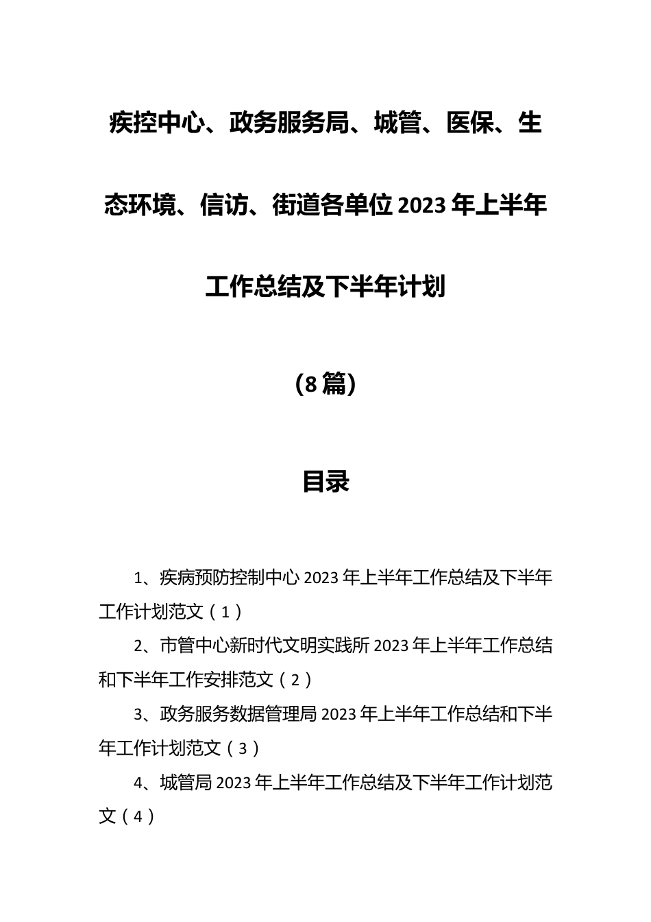 疾控中心、政务服务局、城管、医保、生态环境、信访、街道各单位2023年上半年工作总结及下半年计划(8篇)目录1、疾病预防控制中心2023年上半年工作总结及下半年工作计划范文(1)2、市管中心新时代文明实践所2023年上半年工作总结和下半年工作安排范文(2)3、政务服务数据管理局2023年上半年工作总结和下半年工作计划范文(3)4、城管局2023年上半年工作总结及下半年工作计划范文(4)5、医疗保障局2023年上半年工作总结范文(5)6、生态环境局分局2023上半年工作总结和下半年工作计划范文(6)7、县信访局2023年上半年工作总结和下半年工作计划范文(7)8、街道2023年上半年工作总结及2023年下半年工作安排范文(8)疾病预防控制中心2023年上半年工作总结及下半年工作计划范文(1)2023年以来,县疾病预防控制中心在县委、县政府和县卫健委的正确领导下,始终坚持“预防为主、防治结合”的方针,紧紧围绕保护人民健康,抓好突发公共卫生事件的应急处理、基本公共卫生服务项目和重点传染病、慢性非传染性疾病的防治,各项工作取得了新的进展,现将2023年上半年工作完成情况和下半年工作计划安排报告如下:一、2023年上半年工作完成情况(一)坚决做好新冠病毒感染“乙类乙管”2023年以来新冠疫情防控进入新阶段,x月x日国务院联防联控机制将新冠病毒感染调整为“乙类乙管”,工作重点调整到“保健康、防重症”。中心认真深入学习贯彻习近平总书记关于疫情防控的重要讲话和指示精神,落实上级决策部署,科学指导人民群众正确对待、科学防护,实现了疫情防控平稳转段和社会秩序稳定。1.制定工作方案。印发了《x县加强农村地区新冠肺炎疫情防控和健康服务工作方案》、《x县2023年春节前后新型冠状病毒感染疫情防控工作实施方案》、《x县新型冠状病毒感染监测预警工作方案》、《关于做好新型冠状病毒感染和春夏季传染病防控工作的通知》等方案文件,成立新冠疫情监测预警工作专班。2.开展业务培训。x月x日,县卫健委通过视频会议形式举办了新型冠状病毒感染“乙类乙管”疫情信息报告工作线上培训会议;x月x至x日对乡镇卫生院新冠病毒感染“乙类乙管”进行培训,落实医疗机构监测责任;x月x至x日对各乡镇政府疫情防控经办人员、各村疫情防控专干共x人进行了新冠病毒感染“乙类乙管”和突发公共卫生事件应急处置培训,通过培训,进一步提升农村地区新冠疫情防控能力。3.做好监测预警。按要求开展病例报告、发热门诊(诊室)、哨点医院、病毒变异、聚集性疫情等监测预警工作将x镇x村、x镇x村纳入全省队列监测;将x一中、x中学、x实验学校作为哨点学校进行常态化监测。开展人群核酸及抗原检测监测、医疗机构在院病人监测、社区人群哨点监测等应急监测;开展法定传染病信息报告工作并评估我县疫情数据质量。截至x月底报告新冠病毒感染x例,监测采样养老机构x人,外环境及污水x份,冷冻食品x份,哨点医院x份。4.加强健康教育。新冠病毒感染政策调整后,中心及时印发《预防新冠——做自己健康第一责任人手册》x万册、印制《新冠乙类乙管宣传抽纸》x万包,x月份再次印发《农村地区新冠防控手册》x万册,养心x官方微信公众号推送月度卫生防病健康信息x期。同时,通过政府网站、微信公众号、宣传栏等方式普及新冠预防知识、“乙类乙管”政策及其他健康防病知识。(二)统筹推进疾控重点业务工作1.重点传染病防控(1)结核病防治。一是利用“x.x”结核病日开展结核病宣传教育,宣讲现代结核病防治策略、国家免费政策以及相关结核病防治知识。使结核病防治知识传入千家万户,极大的提高了人民群众防治知识水平,人民群众防病意识不断提高,为积极发现病人,提高人民群众知晓率创造了良好条件;二是加强病人管理,免费提供抗结核治疗,从源头上遏制结核病传播。2023年上半年结核病防治门诊共接诊肺结核患者或疑似肺结核患者x人次,免费查痰x人次,免费摄胸片x人次;截至目前新发现肺结核病人x例,其中阳性患者x人,阳性率x.x%,超过上级要求水平。报告涂阳密切接触者x人,筛查x人次,筛查率x%;网络报告追踪疑似肺结核患者x人,现场追踪及电话追踪x人次,追踪率x%。(2)性病、艾滋病防治。一是加...