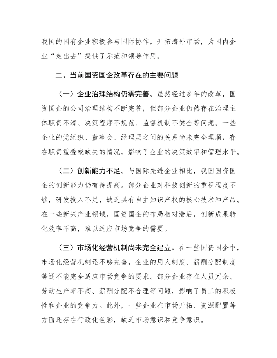 党的二十届三中全会精神与国资国企改革的研讨发言材料尊敬的各位领导、同志们:党的二十届三中全会对深化国资国企改革进一步作出重大部署,这为国资国企的发展指明了方向、提供了根本遵循。我们必须深入学习领会全会精神,切实把思想和行动统一到党中央的决策部署上来,以更大的决心、更有力的举措推动国资国企改革向纵深发展。一、深刻认识党的二十届三中全会对国资国企改革的重大意义(一)巩固公有制主体地位的关键举措。国有企业构成了中国特色社会主义的关键物质和政治基础,是公有制经济的核心组成部分。深化国资国企改革,将有助于提升国有经济的活力、控制力、影响力以及抵御风险的能力,从而巩固公有制的主导地位,并确保社会主义制度的经济基础更加稳固。通过优化国有企业的结构、提高其运营效率、加强创新能力,我们可以进一步激发国有经济的内在潜力,使其在市场竞争中更具竞争力。面对当前国内外经济形势的复杂性和多变性,我们更应坚定不移地推进国资国企改革,为国家的经济安全和稳定提供坚实的保障,只有通过不断深化改革,才能应对各种内外部挑战,确保国家经济的持续健康发展,为人民群众创造更多福祉。(二)推动经济高质量发展的强大动力。经济高质量发展是全面建设社会主义现代化国家的首要任务。国资国企在国民经济中占据着重要地位,是推动经济高质量发展的主力军。通过深化改革,能够促进国资国企优化资源配置、提高生产效率、提升创新能力,推动产业升级和结构调整,为经济高质量发展注入强大动力。我们在一些战略性新兴产业领域,国有企业可以发挥资金、技术、人才等方面的优势,引领产业发展,推动我国在关键核心技术领域取得突破。(三)实现国家战略目标的重要支撑。国有企业和国有资产主要分布在涉及国家安全、国民经济命脉的关键行业和重要领域,肩负着执行国家重大战略任务的重任。深化国有企业改革,将有助于更有效地发挥其在国家战略中的支撑作用,确保国家在能源、粮食、信息等关键领域的安全,并促进国家重大战略的顺利实施。近年来,在推进“一带一路”倡议的过程中,我国的国有企业积极参与国际协作,开拓海外市场,为国内企业“走出去”提供了示范和领导作用。二、当前国资国企改革存在的主要问题(一)企业治理结构仍需完善。虽然经过多年的改革,国资国企的公司治理结构不断完善,但部分企业仍然存在治理主体职责不清、决策程序不规范、监督机制不健全等问题。一些企业的党组织、董事会、经理层之间的关系尚未完全理顺,存在职责重叠或缺失的情况,影响了企业的决策效率和管理水平。(二)创新能力不足。与国际先进企业相比,我国国资国企的创新能力仍有待提高。部分企业对科技创新的重视程度不够,研发投入不足,缺乏具有自主知识产权的核心技术和产品。在一些新兴产业领域,国资国企的布局相对滞后,创新成果转化效率不高,难以适应市场竞争的需要。(三)市场化经营机制尚未完全建立。在一些国资国企中,市场化经营机制还不够完善,企业的用人制度、薪酬分配制度等还不能完全适应市场竞争的要求。部分企业存在人员冗余、劳动生产率不高、薪酬分配不合理等问题,影响了员工的积极性和企业的竞争力。此外,一些企业在市场开拓、资源配置等方面还存在行政化色彩,缺乏市场意识和竞争意识。(四)国有资产监管有待加强。随着国资国企改革的不断推进,国有资产的监管面临着新的挑战。一些地方和部门对国有资产的监管存在职责不清、监管不到位的情况,导致国有资产流失的风险依然存在。同时,国有资产的监管方式和手段还需要进一步创新,以适应新形势下国资国企改革发展的需要。三、结合党的二十届三中全会精神,推进国资国企改革稳步前进(一)坚持党的全面领导,加强国有企业党的建设。党的全面领导是深化国资国企改革的根本保证。要把党的领导贯穿于国资国企改革的全过程,充分发挥国有企业党组织的领导核心和政治核心作用,确保改革的正确方向。加强国有企业领导班子和干部人才队伍建设,培养造就一批对党忠诚、勇于创新、治企有方、兴企有为、清正廉洁的高素质专业化国有企业领导人员。推动党建工作与生产经营深度融合,把党建工作成效...