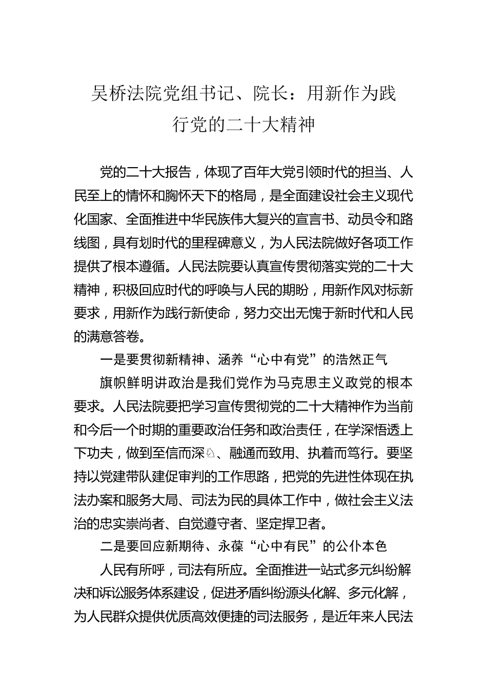 吴桥法院党组书记、院长:用新作为践行党的二十大精神党的二十大报告,体现了百年大党引领时代的担当、人民至上的情怀和胸怀天下的格局,是全面建设社会主义现代化国家、全面推进中华民族伟大复兴的宣言书、动员令和路线图,具有划时代的里程碑意义,为人民法院做好各项工作提供了根本遵循。人民法院要认真宣传贯彻落实党的二十大精神,积极回应时代的呼唤与人民的期盼,用新作风对标新要求,用新作为践行新使命,努力交出无愧于新时代和人民的满意答卷。一是要贯彻新精神、涵养“心中有党”的浩然正气旗帜鲜明讲政治是我们党作为马克思主义政党的根本要求。人民法院要把学习宣传贯彻党的二十大精神作为当前和今后一个时期的重要政治任务和政治责任,在学深悟透上下功夫,做到至信而深、融通而致用、执着而笃行。要坚♘持以党建带队建促审判的工作思路,把党的先进性体现在执法办案和服务大局、司法为民的具体工作中,做社会主义法治的忠实崇尚者、自觉遵守者、坚定捍卫者。二是要回应新期待、永葆“心中有民”的公仆本色人民有所呼,司法有所应。全面推进一站式多元纠纷解决和诉讼服务体系建设,促进矛盾纠纷源头化解、多元化解,为人民群众提供优质高效便捷的司法服务,是近年来人民法院工作的重中之重。要坚持把非诉讼纠纷解决机制挺在前面,推动更多法治力量向引导和疏导端用力。加强诉源治理推动矛盾纠纷源头化解,做实诉前调解,深入推进法官工作站工作,为人民群众提供接地气、零距离、心贴心司法服务,让为民举措更有温度,惠民答卷更有度。♘三是迎接新挑战、坚持“心中有责”的担当胸怀党和国家事业推进到哪里,司法服务保障就跟进到哪里。人民法院要牢记“国之大者”,不断提升适应新时代新征程的履职能力水平,履行好维护国家政治安全、确保社会大局稳定、促进社会公平正义、保障人民安居乐业职责,自觉把服务保障推动高质量发展摆在法院工作重要位置,找准司法服务保障推动高质量发展的切入点、结合点、落脚点,充分发挥审判职能作用,为推动高质量发展提供坚强有力司法保障。依托法官联系人机制,延伸保驾护航触角,营造良好法治化营商环境。四是展现新风貌、锻造“心中有戒”的坚盔利甲全面从严治党永远在路上。要坚持打铁必须自身硬的道理。扎紧制度的篱笆,增强忧患意识,坚持底线思维,坚持自我革命,发扬斗争精神,强化正风肃纪。建功新时代,人民法院要立足新发展阶段,用新思想武装干警头脑、用新理念指导司法实践,多举措克服队伍困境,多形式激发队伍活力,让年轻人有奔头,让老同志有干头,突出干警主体地位,努力打造忠诚干净担当的法院铁军,不断推进审判体系和审判能力现代化。撸起袖子加油干,风雨无阻向前行。新征程上,人民法院要切实把思想和行动统一到党的二十大精神上来,把智慧和力量凝聚到党的二十大确立的宏伟目标上来,以“我将无我,不负人民”的使命担当,凝心铸魂、守正创新、攻坚克难、踔厉奋发,不断提升人民群众的司法获得感和满意度,为全面建设社会主义现代化国家、全面推进中华民族伟大复兴贡献法治力量。