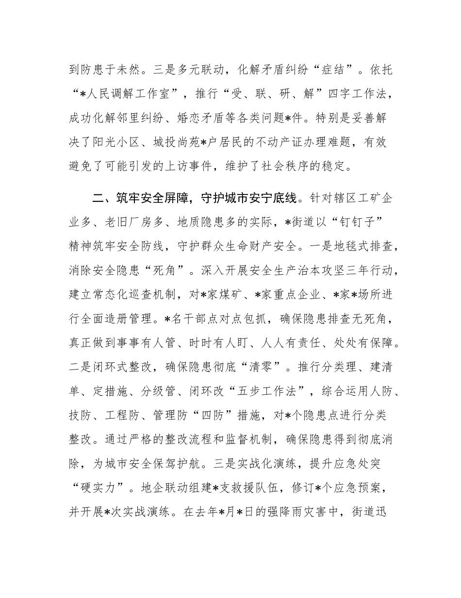 街道党工委书记经验交流材料:凝聚民心民力深耕创安创稳奋楫笃行推动高质量发展在资源型城市转型的时代浪潮中,*街道坚定不移地贯彻*工作部署,紧扣经济发展与社会稳定两大核心任务,积极作为、勇毅前行,全方位推动区域实现高质量发展,为资源枯竭型城市的绿色蝶变贡献强劲力量。一、织密稳定经纬,筑牢和谐发展基石。面对重点人员多、管理难度大等复杂情况,*街道以“绣花精神”深耕基层治理,全力维护社会稳定。一是靶向施策,精准帮扶重点群体。创新推出*工作法,组织*名干部民警对重点人员实施专人包抓。在严格管控的同时,更加注重人文关怀与实际帮扶。积极协调各方资源,帮助*人成功就业,为*人落实低保政策,让重点人员切实感受到社会的温暖与关爱,顺利融入社会,为辖区的和谐稳定奠定坚实基础。二是科技赋能,构建风险防控网络。大力推进警网融合机制建设,建成*个智慧安防小区,为居民安全生活装上“智慧大脑”。同时,组建*支治安联防队,对重点区域开展常态化巡逻防控。截至目前,已成功提前介入并化解溺水、电诈等各类风险*起,将隐患消除在萌芽状态,真正做到防患于未然。三是多元联动,化解矛盾纠纷“症结”。依托“*人民调解工作室”,推行“受、联、研、解”四字工作法,成功化解邻里纠纷、婚恋矛盾等各类问题*件。特别是妥善解决了阳光小区、城投尚苑*户居民的不动产证办理难题,有效避免了可能引发的上访事件,维护了社会秩序的稳定。二、筑牢安全屏障,守护城市安宁底线。针对辖区工矿企业多、老旧厂房多、地质隐患多的实际,*街道以“钉钉子”精神筑牢安全防线,守护群众生命财产安全。一是地毯式排查,消除安全隐患“死角”。深入开展安全生产治本攻坚三年行动,建立常态化巡查机制,对*家煤矿、*家重点企业、*家*场所进行全面造册管理。*名干部点对点包抓,确保隐患排查无死角,真正做到事事有人管、时时有人盯、人人有责任、处处有保障。二是闭环式整改,确保隐患彻底“清零”。推行分类理、建清单、定措施、分级管、闭环改“五步工作法”,综合运用人防、技防、工程防、管理防“四防”措施,对*个隐患点进行分类整改。通过严格的整改流程和监督机制,确保隐患得到彻底消除,为城市安全保驾护航。三是实战化演练,提升应急处突“硬实力”。地企联动组建*支救援队伍,修订*个应急预案,并开展*次实战演练。在去年*月*日的强降雨灾害中,街道迅速启动应急预案,仅用*小时就成功疏转安置群众*人,实现“零伤亡”抢通泥石淤积隧道,充分彰显了高效的应急处置能力。三、厚植民生底色,提升群众幸福成色。*街道始终秉持“民生为大、民生为要”的理念,用心用情用力办好民生实事,不断提升群众的幸福指数。一是绿色蝶变,绘就生态宜居新画卷。按照分块美化、整体恢复的思路,实施架空线缆整治等十大专项行动。整合资金*亿元,完成*个生态项目,建成*个主题游园,打造*公里生态廊道,成为宜居宜业的新城区。二是精准服务,托起老年群体“夕阳红”。针对老年人占比*%且多集中在老旧小区的现状,实施拆危治乱、旧房换新居工程,改造提升*个老旧小区,拆迁安置*户居民,惠及*位老人。打造*助老服务品牌,建成街道养老服务中心和社会福利院,开展*场次关心关爱活动,让老年人安享幸福晚年。三是访民问暖,解决群众“急难愁盼”。扎实做好“冬病夏治”,新铺设供暖管网*公里,改造提升老旧管网*公里,分户改造*户。深入开展“访民问暖”活动,通过干部走访、群众反馈,及时解决暖气不热、跑冒滴漏等*个问题,使供暖问题投诉同比下降*%,让群众温暖过冬。前路有光,未来可期。*街道将持续深化*工作部署,不断优化工作举措,强化服务功能,在经济发展与社会稳定的道路上稳步迈进,为资源枯竭型城市的绿色转型和高质量发展续写新的辉煌篇章。免责声明:文稿来源网络整理,版权归原作者所有。若侵犯了您的合法权益,请作者持权属证明与本站联系,我们将及时更正、删除!谢谢!文稿首发平台:www.gongwentang.com(公文堂)