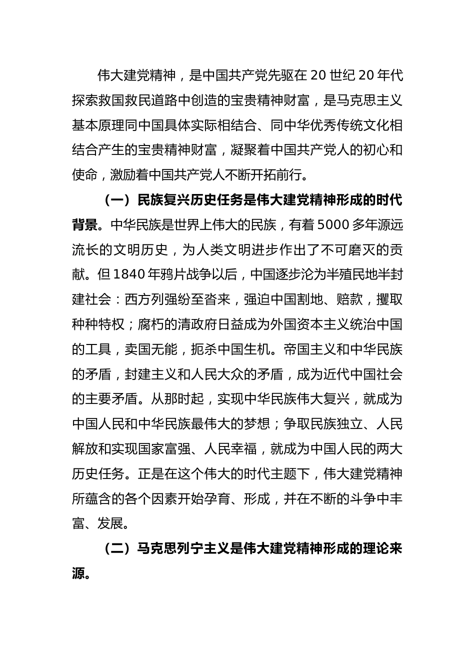 党的二十大精神宣讲党课:弘扬伟大建党精神奋力走好新的赶考之路习近平总书记在党的XX大报告开篇,鲜明指出这次大会的主题:“高举中国特色社会主义伟大旗帜,全面贯彻新时代中国特色社会主义思想,弘扬伟大建党精神,自信自强、守正创新,踔厉奋发、勇毅前行,为全面建设社会主义现代化国家、全面推进中华民族伟大复兴而团结奋斗。”在党的XX大胜利闭幕的讲话中,习近平总书记要求全党:“一定要牢记党的初心使命,坚定理想信念,弘扬伟大建党精神,认真学习领会党的理论和路线方针政策,贯彻落实党中央关于全面建设社会主义现代化国家、全面推进中华民族伟大复兴的战略部署,更加自觉地学习党章、遵守党章、贯彻党章、维护党章,在思想上政治上行动上同党中央保持高度一致。”党的XX大通过的《中国共产党章程(修正案)》增写了弘扬坚持真理、坚守理想,践行初心、担当使命,不怕牺牲、英勇斗争,对党忠诚、不负人民的伟大建党精神等内容。伟大建党精神,思想精辟、内涵丰富,意义重大、意境深远,深刻揭示了中国共产党的特质,是我们全面认识和准确把握中国共产党为什么能的一把金钥匙。对学习贯彻党的XX大精神、推进党的建设新的伟大工程、把新时代中国特色社会主义伟大事业推向前进,具有重大现实意义和深远历史意义。一、伟大建党精神形成的基础和条件伟大建党精神,是中国共产党先驱在20世纪20年代探索救国救民道路中创造的宝贵精神财富,是马克思主义基本原理同中国具体实际相结合、同中华优秀传统文化相结合产生的宝贵精神财富,凝聚着中国共产党人的初心和使命,激励着中国共产党人不断开拓前行。(一)民族复兴历史任务是伟大建党精神形成的时代背景。中华民族是世界上伟大的民族,有着5000多年源远流长的文明历史,为人类文明进步作出了不可磨灭的贡献。但1840年鸦片战争以后,中国逐步沦为半殖民地半封建社会:西方列强纷至沓来,强迫中国割地、赔款,攫取种种特权;腐朽的清政府日益成为外国资本主义统治中国的工具,卖国无能,扼杀中国生机。帝国主义和中华民族的矛盾,封建主义和人民大众的矛盾,成为近代中国社会的主要矛盾。从那时起,实现中华民族伟大复兴,就成为中国人民和中华民族最伟大的梦想;争取民族独立、人民解放和实现国家富强、人民幸福,就成为中国人民的两大历史任务。正是在这个伟大的时代主题下,伟大建党精神所蕴含的各个因素开始孕育、形成,并在不断的斗争中丰富、发展。(二)马克思列宁主义是伟大建党精神形成的理论来源。十月革命一声炮响,给中国送来了马克思列宁主义。陷于彷徨和苦闷中的中国人民由此看到了解决中国问题的出路和希望,一批赞成俄国十月社会主义革命道路、具有初步共产主义思想的先进分子开始在中国出现。1919年五四运动爆发,中国工人阶级开始以独立的姿态登上政治舞台,显示出强大力量,马克思主义也开始在中国广泛传播。中国先进分子集合在马克思主义旗帜下,积极投身群众斗争实践,到工人中调查生活、宣传革命、办学校、办工会。随着马克思主义在中国的进一步传播,与中国工人运动相结合,推动了伟大建党精神的萌发。(三)伟大建党活动是伟大建党精神形成的实践基础。“南陈北李,相约建党”。在共产国际帮助下,中国先进分子组织马克思学说研究会等组织,成立了共产党早期组织。他们致力于研究宣传马克思主义,同反马克思主义思潮展开论战,组织工人群众,筹建社会主义青年团。1921年7月,中国共产党第一次全国代表大会在上海召开,一个以马克思列宁主义为行动指南的、完全新式的无产阶级政党诞生。中国共产党成立后,迅速领导各地党组织开展劳工运动和党团建设。1922年7月党的二大召开,制定党的民主革命纲领,诞生第一部党章,健全中央领导机构,标志着中国共产党创建工作顺利完成。中国共产党的创建过程,在实践中建立了党的组织,在精神上形成了伟大建党精神。(四)中华优秀传统文化是伟大建党精神形成的文化土壤。在5000多年文明发展中孕育的中华优秀传统文化,是中华民族的精神命脉。崇仁爱、重民本、守诚信、讲辩证、尚和合、求大同等思想,自强不息、敬业乐群、扶正扬善、扶危济困、见义勇为、孝老爱亲等...