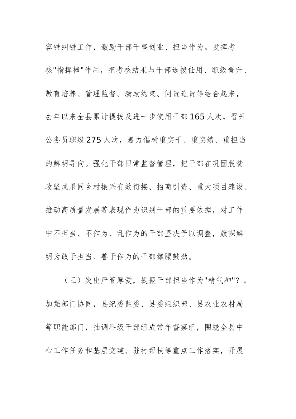 2025年激励干部担当作为工作情况的报告文稿近年来,县委坚持以习近平新时代中国特色社会主义思想为指导,深入贯彻党的二十大及二十届三中全会精神,坚决落实新时代党的组织路线,坚持严管与厚爱相结合,不断通过政治上激励、工作上支持、待遇上保障、心理上关怀,激励广大干部在推动全县经济社会高质量发展上创先争优、积极作为。一、主要工作情况(一)突出思想引领,夯实干部担当作为"强基础"。深入实施组织工作"五大工程",扎实推进"凝心铸魂"工程,深入学习贯彻习近平新时代中国特色社会主义思想、党的二十届三中全会精神和习近平总书记视察重要讲话重要指示精神,加强党员干部教育培训,持续强化党性锤炼,教育引导党员干部深刻领悟"两个确立"的决定性意义,坚决做到"两个维护"。扎实开展党纪学习教育和深入贯彻中央八项规定精神学习教育,把党章党规党纪、中央八项规定及其实施细则精神学习列入党员干部年度教育培训计划,以知法懂法推进用法执法,引导党员干部树牢底线意识、红线思维。去年以来,全县累计举办各类培训班35期,培训县、乡、村干部6896人次,组织参加网络培训3105人次,教育引导干部强化责任意识,增强干事创业责任感和紧迫感,真正把心思放在谋事、干事、成事上。(二)突出鲜明导向,树牢干部担当作为"风向标"。制定《县乡镇干部管理办法》《县县管领导班子和领导干部年度考核四个办法》和《县贯彻落实选贤任能工程任务清单(2024一2028年)》等,落实"三个区分开来"、推进容错纠错工作,激励干部干事创业、担当作为。发挥考核"指挥棒"作用,把考核结果与干部选拔任用、职级晋升、教育培养、管理监督、激励约束、问责追责等结合起来,去年以来全县累计提拔及进一步使用干部165人次,晋升公务员职级275人次,着力倡树重实干、重实绩、重担当的鲜明导向。强化干部日常监督管理,把干部在巩固脱贫攻坚成果同乡村振兴有效衔接、招商引资、重大项目建设、推动高质量发展等表现作为识别干部的重要依据,对工作中不担当、不作为、乱作为的干部坚决予以调整,旗帜鲜明为敢于担当、善于作为的干部撑腰鼓劲。(三)突出严管厚爱,提振干部担当作为"精气神"?。加强部门协同,县纪委监委、县委组织部、县农业农村局等职能部门,抽调科级干部组成常年督察组,围绕全县中心工作任务和基层党建、驻村帮扶等重点工作落实,开展全覆盖多轮次暗访督查,累计召开集体约谈会4次,约谈148人,公开通报334人次,下发工作提醒4份、工作通报4期,督办函35份,督促乡镇党委通报约谈321人。加强对各级领导班子、"一把手"和年轻干部、新提拔干部的监督管理,严格督导班子民主生活会,扎实开好支部组织生活会,组织1600余名党员干部家属接受家风廉洁教育,不断提高党员干部规矩意识和担当精神。强化审计监督,严格干部请销假和外出报备制度,严格国家工作人员因私出国(境)管理,并对领导班子和领导干部的实际表现、具体事例等记录在案,着力营造学习先进、激励实干的良好氛围。(四)突出正向激励,营造干部担当作为"好氛围"。加强对科级干部、年轻干部、新提拔干部、关键岗位干部等重点对象任前培训、谈心谈话、考察考核、函询诫勉等监督措施,对干部苗头性、倾向性问题及时提醒纠正。建立领导干部和组织人社部门经常听取干部意见建议机制,畅通"12380"干部监督举报平台,及时了解干部真实意愿。利用领导班子和干部调研、召开年度民主生活会契机,县级领导干部、县委组织部班子成员经常性与乡镇、县直单位领导班子成员和科级干部开展谈心谈话,及时把脉干部情况,帮助解决后顾之忧。完善实施61项146条暖心措施,为乡镇干部修建周转房和配套建设"五小工程",落实干部体检制度和带薪年休假制度,及时发放车补、乡镇补贴等待遇,利用微信公众平台持续宣传先进典型,推动形成干部主动作为、积极担当的良好局面。二、下一步工作打算(一)强化思想引领,筑牢担当使命根基。坚持把政治能力建设贯穿干部教育全过程,建立专题轮训制度,将新发展理念、基层治理等课程纳入党校主体班次,用好红色教育基地开展沉浸式党性教育。定期组织"担当作为大家谈"主题论坛,邀请优秀干部分享攻坚案例,编...