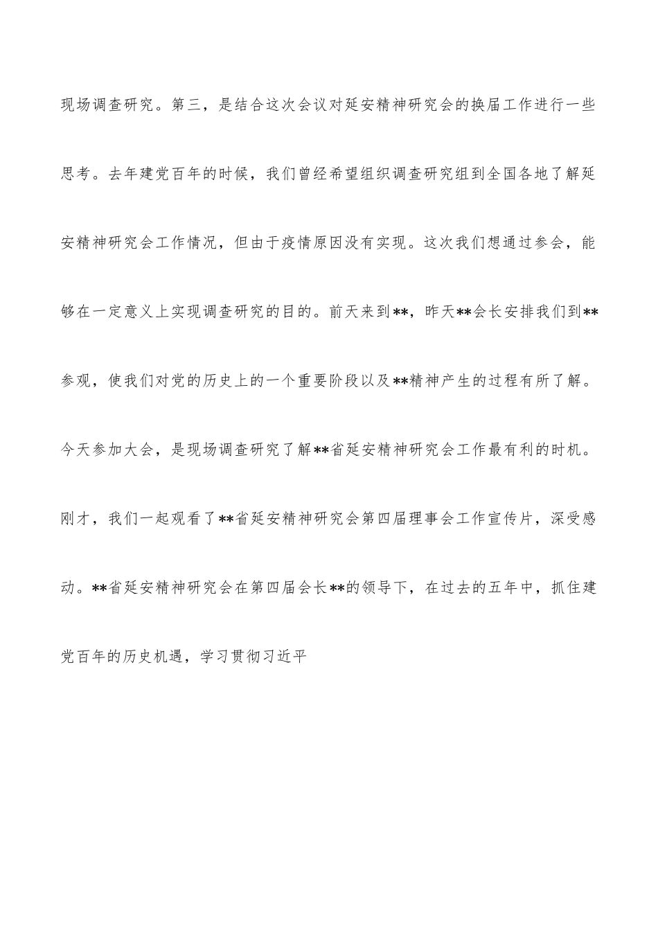 在延安精神研究会会员代表大会上的讲话尊敬的**省委常委、宣传部部长**同志,尊敬的**主席,尊敬的**主任,尊敬的各位代表:我非常荣幸地收到邀请,参加**省延安精神研究会第五次会员代表大会。刚才中延会办公室**副主任代表中延会宣读了我们致大会的贺信。贺信中,我们对**省延安精神研究会以**同志为会长的第四届理事会领导,在过去五年工作中做出的成绩给予了充分肯定,同时也提出了一些工作希望。下面我想利用这个机会讲一些个人想法。我和**主任出席**省延安精神研究会第五次会员代表大会,主要有三个目的:第一,是向大会表示祝贺!第二,是利用这次机会对**省延安精神研究会这个全国延安精神研究会系统中最大的、最重要的一支队伍所做的工作,进行现场调查研究。第三,是结合这次会议对延安精神研究会的换届工作进行一些思考。去年建党百年的时候,我们曾经希望组织调查研究组到全国各地了解延安精神研究会工作情况,但由于疫情原因没有实现。这次我们想通过参会,能够在一定意义上实现调查研究的目的。前天来到**,昨天**会长安排我们到**参观,使我们对党的历史上的一个重要阶段以及**精神产生的过程有所了解。今天参加大会,是现场调查研究了解**省延安精神研究会工作最有利的时机。刚才,我们一起观看了**省延安精神研究会第四届理事会工作宣传片,深受感动。**省延安精神研究会在第四届会长**的领导下,在过去的五年中,抓住建党百年的历史机遇,学习贯彻习近平总书记对中延会第六次会员大会贺信,进一步明确自己的工作思路,开展了丰富多彩的工作,取得了良好的效果,不仅得到了宣传、宣讲对象的充分肯定,省委书记**同志也作了批示,时任省委副书记**听取了工作汇报,这些都是对**省延安精神研究会工作的充分肯定。第四届理事会过去五年工作中,在深入研究、大力宣传、认真践行延安精神方面做了大量工作,而且做出大量创新工作,不愧是全国延安精神研究会系统中的排头兵,和**省延安精神发源地的地位是相称的。对你们取得的成绩,我非常感动。关于换届,刚才观看的第四届理事会工作宣传片中也简要回顾了**省延安精神研究会的历史。从1993年陕延会成立到今天召开第五次会员代表大会,我觉得**省委省政府一贯高度重视延安精神的弘扬,历届**省延安精神研究会理事会都是由省委省政府退下来的德高望重的老领导担任主要负责人。每一届理事会,每一届会领导,都体现了那个时代的特点,根据那个时代的需要做出自己的努力,在弘扬延安精神方面,为全国各地带了个好头。我在全国各地参加延安精神的宣传活动、实地调研,或者像这次以参会的形式开展调研,感觉到选择一个什么样的会长,是研究会能不能很好开展工作的一个重要因素。在这个过程中要得到同级党委政府,特别是党委政府主要领导同志的重视和支持,同时也要得到党委有关部门,特别是宣传部、组织部以及政府民政部门的大力支持。从**省延安精神研究会前四届的会长情况来看,你们是幸运的。会长由前省委书记、省委常委、省人大、省政协这些退下来的老领导来担任。这些省级老领导,曾长期在党政机关一线担任领导,在一辈子奋斗和攻坚克难中积累了丰富的工作经验。从全国的情况来看,我们发现只要由省级领导担任会长的省级研究会,比如甘肃、青海、云南,工作开展状况都可以用生机勃勃来形容,他们都在不断创造新的经验,所以会长的选择特别重要。蒿慧杰部长今天出席会议,他是省委主管部门的主要领导,体现了省委省政府对陕延会的高度重视与支持,特别是为下一届常务理事会选择了一位好会长。因此我希望相关党委政府及组织、宣传、民政部门能像**省委省政府这样对延安精神研究会的工作给予更多的支持。一些地方的研究会工作出现了停滞状况,比如由于老会长到龄,没有及时换届,没有及时选出新会长等等,导致一些地区延安精神研究会工作停滞。我感觉,发挥社会组织和老同志作用越来越重要。在十九届五中全会通过的十四五规划工作当中强调,要发挥社会组织在社会治理中的积极作用。在五位一体整体布局当中,社会建设、社会组织管理的重要性是上升的。在我们国家,在改革开放的社会背景下出现、成长的社会组织还是新鲜事物,...