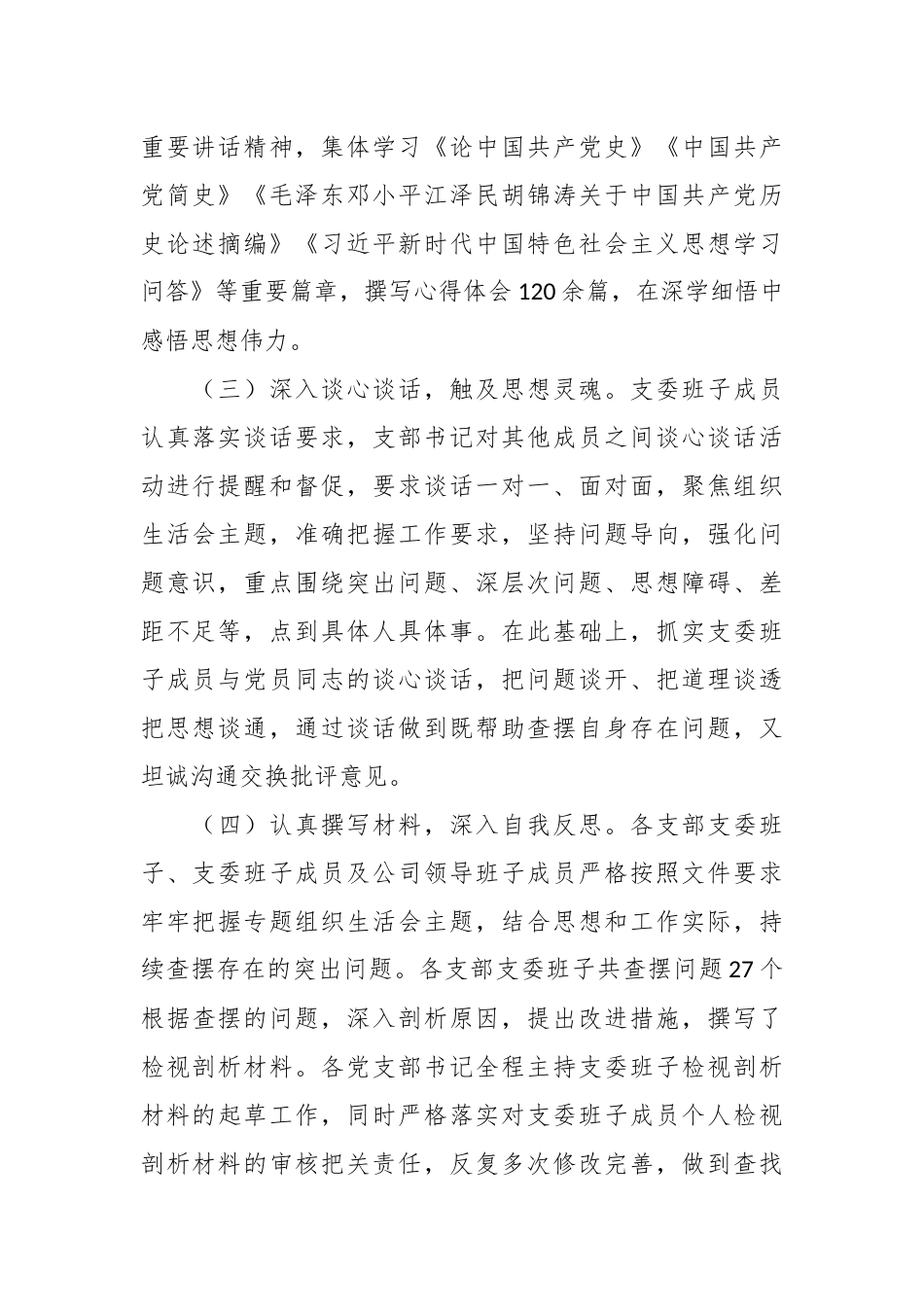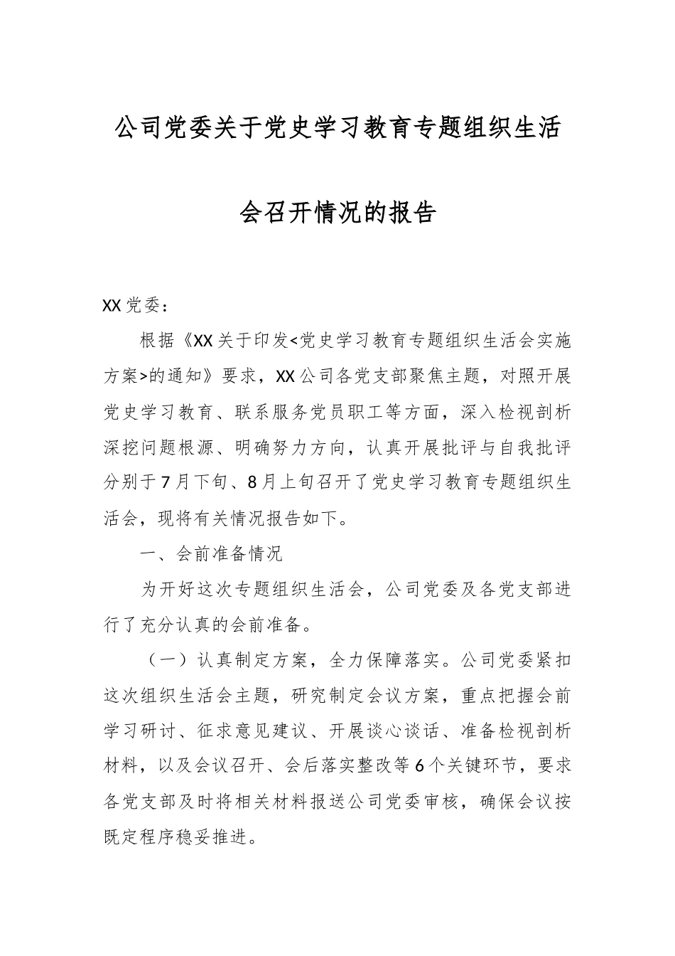 公司党委关于党史学习教育专题组织生活会召开情况的报告XX党委:根据《XX关于印发<党史学习教育专题组织生活会实施方案>的通知》要求,XX公司各党支部聚焦主题,对照开展党史学习教育、联系服务党员职工等方面,深入检视剖析深挖问题根源、明确努力方向,认真开展批评与自我批评分别于7月下旬、8月上旬召开了党史学习教育专题组织生活会,现将有关情况报告如下。一、会前准备情况为开好这次专题组织生活会,公司党委及各党支部进行了充分认真的会前准备。(一)认真制定方案,全力保障落实。公司党委紧扣这次组织生活会主题,研究制定会议方案,重点把握会前学习研讨、征求意见建议、开展谈心谈话、准备检视剖析材料,以及会议召开、会后落实整改等6个关键环节,要求各党支部及时将相关材料报送公司党委审核,确保会议按既定程序稳妥推进。(二)精心组织学习,筑牢思想基础。认真学习习近平新时代中国特色社会主义思想,跟进学习习近平总书记关于党史学习教育系列讲话精神,专题学习习近平总书记“七一”重要讲话精神,集体学习《论中国共产党史》《中国共产党简史》《毛泽东邓小平江泽民胡锦涛关于中国共产党历史论述摘编》《习近平新时代中国特色社会主义思想学习问答》等重要篇章,撰写心得体会120余篇,在深学细悟中感悟思想伟力。(三)深入谈心谈话,触及思想灵魂。支委班子成员认真落实谈话要求,支部书记对其他成员之间谈心谈话活动进行提醒和督促,要求谈话一对一、面对面,聚焦组织生活会主题,准确把握工作要求,坚持问题导向,强化问题意识,重点围绕突出问题、深层次问题、思想障碍、差距不足等,点到具体人具体事。在此基础上,抓实支委班子成员与党员同志的谈心谈话,把问题谈开、把道理谈透把思想谈通,通过谈话做到既帮助查摆自身存在问题,又坦诚沟通交换批评意见。(四)认真撰写材料,深入自我反思。各支部支委班子、支委班子成员及公司领导班子成员严格按照文件要求牢牢把握专题组织生活会主题,结合思想和工作实际,持续查摆存在的突出问题。各支部支委班子共查摆问题27个根据查摆的问题,深入剖析原因,提出改进措施,撰写了检视剖析材料。各党支部书记全程主持支委班子检视剖析材料的起草工作,同时严格落实对支委班子成员个人检视剖析材料的审核把关责任,反复多次修改完善,做到查找问题详实全面、分析原因透骨触魂、整改措施务实可行。以上这些准备工作,为开好此次民主生活会奠定了坚实的思想基础和工作基础。二、会议召开情况各党支部专题组织生活会由支部书记主持召开,会议传达了习近平总书记“七一”重要讲话精神,通报了支部上半年工作开展情况,特别是党史学习教育开展情况。支部书记代表支委班子从三个方面进行检视剖析,深刻剖析原因,明确整改方向和措施。支委班子成员及公司领导班子成员结合思想与工作实际,逐一进行个人检视剖析并开展批评与自我批评,达到了“动真碰硬、红脸出汗”的效果。公司巡回指导组参加各党支部专题组织生活会。总的来看,会议开得比较成功。一是以上率下,求真务实。按照组织生活会要求,各党支部支委班子成员及公司领导班子成员投入大量时间和精力,带头开展学习研讨带头查摆问题,带头开展谈心谈话,带头开展批评和自我批评,进行了一次深入全面的“政治体检”,充分发挥了示范引领作用,树立了标杆。二是聚焦精准,画像具体。发言都能开门见山,直奔主题,真正把自己摆进去,结合思想、工作和生活实际找准存在的突出问题,深入具体地进行党性分析,为自己画了像,总体上来说实实在在。三是直截了当,紧张严肃。会议较好地坚持了问题导向,每个班子成员在检视剖析自我批评的同时开展了相互批评,既有红红脸、出出汗的紧张和严肃,又有加加油、鼓鼓劲的宽松与和谐,从中可以看出诚恳帮助同志、维护团结的觉悟,达到了坚持真理、修正错误,增进团结、振奋精神的目的。四是有的放矢,科学严谨。支委班子、成员及领导班子成员都提出了符合实际的改进措施,既结合自身实际,又与公司改革发展工作举措相衔接,既立足于眼前的整改,又着眼于长远的体制机制建设,既有明确的针对性,又有实践的操作性为进一步改进作风,...