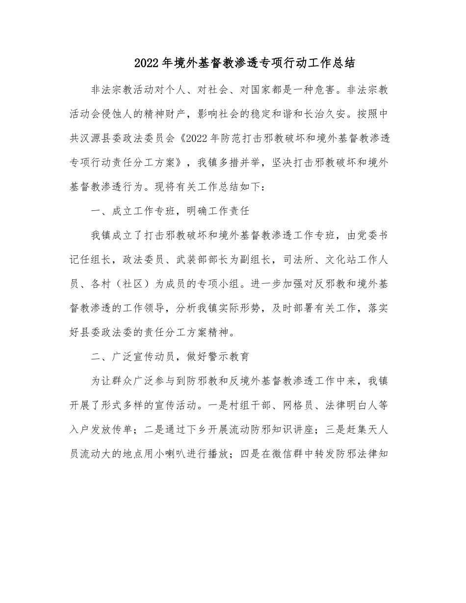 2022年境外基督教渗透专项行动工作总结非法宗教活动对个人、对社会、对国家都是一种危害。非法宗教活动会侵蚀人的精神财产,影响社会的稳定和谐和长治久安。按照中共汉源县委政法委员会《2022年防范打击邪教破坏和境外基督教渗透专项行动责任分工方案》,我镇多措并举,坚决打击邪教破坏和境外基督教渗透行为。现将有关工作总结如下:一、成立工作专班,明确工作责任我镇成立了打击邪教破坏和境外基督教渗透工作专班,由党委书记任组长,政法委员、武装部部长为副组长,司法所、文化站工作人员、各村(社区)为成员的专项小组。进一步加强对反邪教和境外基督教渗透的工作领导,分析我镇实际形势,及时部署有关工作,落实好县委政法委的责任分工方案精神。二、广泛宣传动员,做好警示教育为让群众广泛参与到防邪教和反境外基督教渗透工作中来,我镇开展了形式多样的宣传活动。一是村组干部、网格员、法律明白人等入户发放传单;二是通过下乡开展流动防邪知识讲座;三是赶集天人员流动大的地点用小喇叭进行播放;四是在微信群中转发防邪法律知识和相关案例作警示教育。通过多方面的宣传,全镇上下形成了良好的防邪局面。三、抓好摸排整治,做好人员管控按照领导小组安排,各村(社区)对本辖区进行了详实的摸排工作,发挥网格员村组干部人熟地熟的优势,将网格员和村组干部排查、群众举报等方式摸排出的线索登记在册并及时上报镇工作专班。镇工作专班接到线索后及时反省再次进行核实了解,对摸排中发现的可疑人员一律密切关注做好管控措施。采用人盯人、“雪亮工程”平台在线巡视的方式观察可疑人员动向。目前我镇经排查未发现邪教重点人员和境外基督教渗透人员。对摸排工作中发现非正规单位组织的培训活动一律叫停,有效遏制“精神传销”。半年来,我镇防邪教和反境外基督教渗透工作,取得了一定效果,在宣传教育方面全社区群众、居民都积极参加了活动,有力的促进了我镇的发展建设,但与上级的要求还有一定的距离,下一步工作中,我们将进一步加大力度,坚持常抓不懈,巩固已经取得的成果,为我镇经济发展提供一个良好的环境。