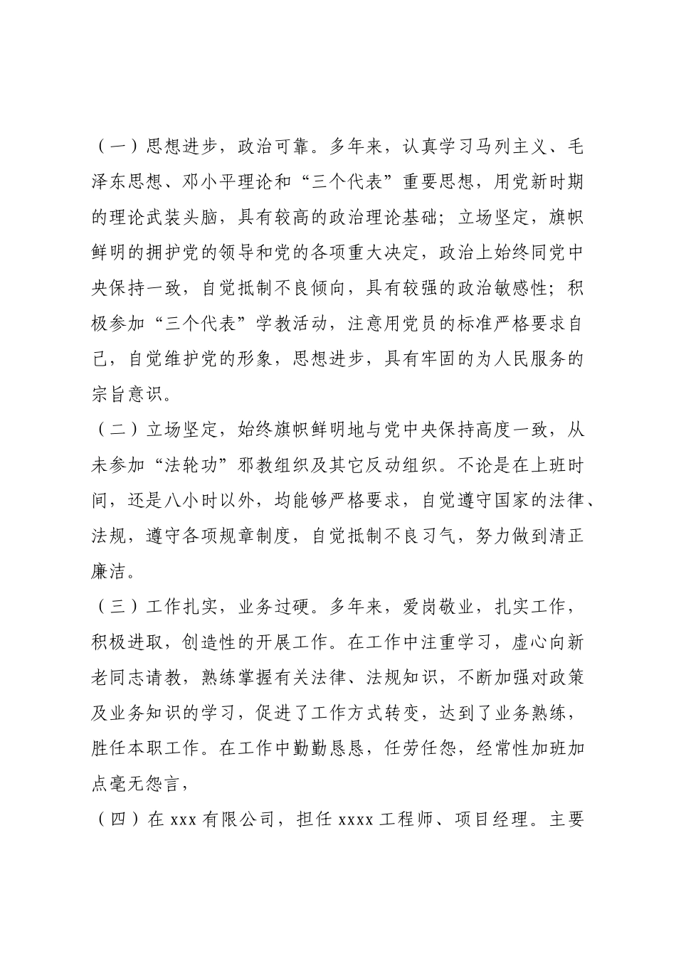 应届生公务员政审现实表现第1篇第2篇第3篇第4篇第5篇更多顶部目录第一篇:公务员政审现实表现第二篇:公务员政审现实表现第三篇:公务员政审现实表现第四篇:公务员政审现实表现证明第五篇:公务员政审现实表现证明更多相关范文正文第一篇:公务员政审现实表现xx同志的基本情况一、本人基本情况xx,男,出生年月:19xx年x月,政治面貌:团员,学历:本科,20xx年x月毕业于xx大学xxx专业。现在家待业,报考xxx县xxx办事员。未婚。二、主要简历20xx年9月—20xx年6月xx大学xxxxx系20xx年7月—20xx年7月xxxxxxx有限公司20xx年8月至今在家待业三、奖惩情况无四、现实表现(一)思想进步,政治可靠。多年来,认真学习马列主义、毛泽东思想、邓小平理论和“三个代表”重要思想,用党新时期的理论武装头脑,具有较高的政治理论基础;立场坚定,旗帜鲜明的拥护党的领导和党的各项重大决定,政治上始终同党中央保持一致,自觉抵制不良倾向,具有较强的政治敏感性;积极参加“三个代表”学教活动,注意用党员的标准严格要求自己,自觉维护党的形象,思想进步,具有牢固的为人民服务的宗旨意识。(二)立场坚定,始终旗帜鲜明地与党中央保持高度一致,从未参加“法轮功”邪教组织及其它反动组织。不论是在上班时间,还是八小时以外,均能够严格要求,自觉遵守国家的法律、法规,遵守各项规章制度,自觉抵制不良习气,努力做到清正廉洁。(三)工作扎实,业务过硬。多年来,爱岗敬业,扎实工作,积极进取,创造性的开展工作。在工作中注重学习,虚心向新老同志请教,熟练掌握有关法律、法规知识,不断加强对政策及业务知识的学习,促进了工作方式转变,达到了业务熟练,胜任本职工作。在工作中勤勤恳恳,任劳任怨,经常性加班加点毫无怨言,(四)在xxx有限公司,担任xxxx工程师、项目经理。主要负责xxx项目的管理、协调与实施,现场调试和技术支持。先后在xx工程部(本部)和xx工程部(驻外)工作,已负责或参与实施了近20个自动控制工程项目,涉及电力、石化、煤化工、盐化工、精细化工、金属冶炼、水处理等各行业。主要缺点或不足:也存在着一定的缺点和不足,主要表现在存在着胆子不大、步子太小的现象,缺乏敢闯敢冒的精神。这些问题有待于在今后的工作中加以克服和解决。第二篇:公务员政审现实表现xx同志的基本情况一、本人基本情况xx,男,出生年月:19xx年x月,政治面貌:团员,学历:本科,20xx年x月毕业于xx大学xxx专业。现在家待业,报考xxx县xxx办事员。未婚。二、主要简历20xx年9月—20xx年6月xx大学xxxxx系20xx年7月—20xx年7月xxxxxxx有限公司20xx年8月至今在家待业三、奖惩情况无四、现实表现(一)思想进步,政治可靠。多年来,认真学习马列主义、毛泽东思想、邓小平理论和“三个代表”重要思想,用党新时期的理论武装头脑,具有较高的政治理论基础;立场坚定,旗帜鲜明的拥护党的领导和党的各项重大决定,政治上始终同党中央保持一致,自觉抵制不良倾向,具有较强的政治敏感性;积极参加“三个代表”学教活动,注意用党员的标准严格要求自己,自觉维护党的形象,思想进步,具有牢固的为人民服务的宗旨意识。(二)立场坚定,始终旗帜鲜明地与党中央保持高度一致,从未参加“法轮功”邪教组织及其它反动组织。不论是在上班时间,还是八小时以外,均能够严格要求,自觉遵守国家的法律、法规,遵守各项规章制度,自觉抵制不良习气,努力做到清正廉洁。(三)工作扎实,业务过硬。多年来,爱岗敬业,扎实工作,积极进取,创造性的开展工作。在工作中注重学习,虚心向新老同志请教,熟练掌握有关法律、法规知识,不断加强对政策及业务知识的学习,促进了工作方式转变,达到了业务熟练,胜任本职工作。在工作中勤勤恳恳,任劳任怨,经常性加班加点毫无怨言,(四)在xxx有限公司,担任xxxx工程师、项目经理。主要负责xxx项目的管理、协调与实施,现场调试和技术支持。先后在xx工程部(本部)和xx工程部(驻外)工作,已负责或参与实施了近20个自动控制工程项目,涉及电力、石化、煤化工、盐化工、精细化工、金属冶炼、水处理等各行业。主要缺点或不足:也存在着一定的缺点和不足,...
