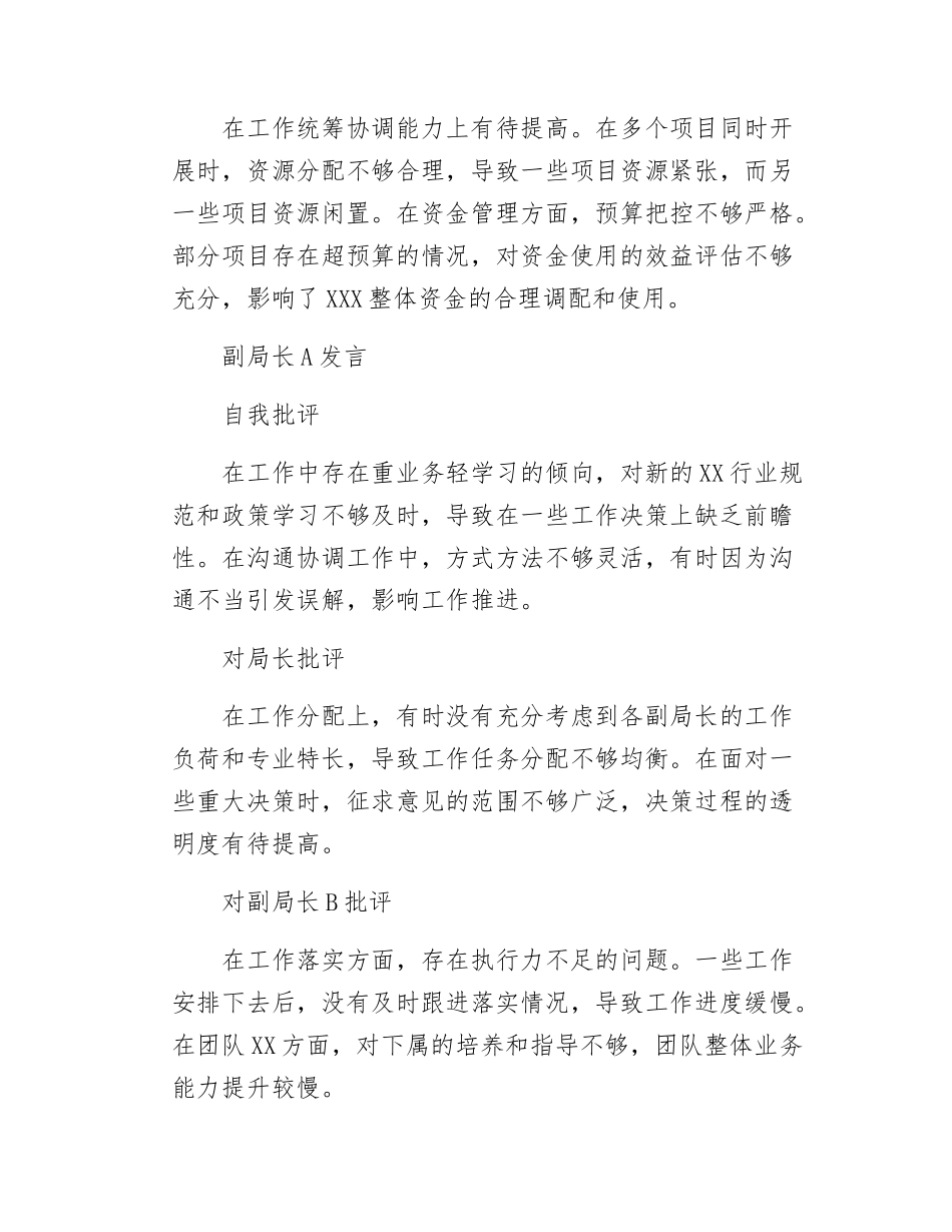 生活会局长与副局长互相批评发言记录聚焦XXX局工作,深入开展批评与自我批评,提升班子凝聚力与工作效能。会议时间:XXXX年XX月XX日参会人员:局长、副局长A、副局长B、副局长C、副局长D局长发言:自我批评在工作推进中,有时过于追求速度,而对工作细节把控不够精细。比如在一些重点市政工程项目上,虽然整体进度按计划完成,但在工程验收时,仍发现部分设施的安装存在部分瑕疵,反映出我在质量监管环节的监督不够深入。在面对复杂的利益协调问题时,有时存在畏难情绪。XXXXX改造项目中涉及居民对改造方案的不同意见,协调难度较大,我没有及时拿出有效的解决办法,导致项目推进一度受阻。对副局长A批评在项目管理方面,对项目进度的跟踪不够及时,部分项目出现了拖延的情况。XXXXXX按照原定计划应该在XXXXX交付使用,但由于对施工过程中遇到的问题解决不及时,导致项目延期了X个月。在与其他部门的沟通协作上,主动性还不够。在城市绿化工程与环保部门的对接中,没有积极主动地去沟通协调相关环保指标问题,影响了工程的整体推进效率。对副局长B批评在政策执行方面,存在理解不够深入的问题。在执行国家关于建筑节能的新政策时,没有及时组织相关人员进行深入学习和解读,导致XXXX项目在节能措施落实上不到位。在工作创新意识上有所欠缺,习惯于按照传统的工作模式开展工作。在城市XX规划中,不能充分引入新的理念和技术,缺乏对智慧城市XX等前沿领域的探索和应用。对副局长C批评在工作作风上,有时存在浮躁情绪。在处理一些群众投诉的问题时,没有足够的耐心去倾听群众的诉求,导致问题解决效果不佳,群众满意度不高。在对下属单位的管理上,存在宽松软的现象。对一些下属单位的违规行为,不能及时进行严肃处理,影响了整个XX系统的工作纪律和形象。对副局长D批评在工作统筹协调能力上有待提高。在多个项目同时开展时,资源分配不够合理,导致一些项目资源紧张,而另一些项目资源闲置。在资金管理方面,预算把控不够严格。部分项目存在超预算的情况,对资金使用的效益评估不够充分,影响了XXX整体资金的合理调配和使用。副局长A发言自我批评在工作中存在重业务轻学习的倾向,对新的XX行业规范和政策学习不够及时,导致在一些工作决策上缺乏前瞻性。在沟通协调工作中,方式方法不够灵活,有时因为沟通不当引发误解,影响工作推进。对局长批评在工作分配上,有时没有充分考虑到各副局长的工作负荷和专业特长,导致工作任务分配不够均衡。在面对一些重大决策时,征求意见的范围不够广泛,决策过程的透明度有待提高。对副局长B批评在工作落实方面,存在执行力不足的问题。一些工作安排下去后,没有及时跟进落实情况,导致工作进度缓慢。在团队XX方面,对下属的培养和指导不够,团队整体业务能力提升较慢。对副局长C批评在项目监管过程中,存在监管漏洞。对一些XX项目的质量和安全监管不够严格,出现了一些质量安全隐患。在面对困难和挑战时,缺乏勇于担当的精神,存在推诿责任的现象。对副局长D批评在信息化XX工作中,推进力度不够。XXX的信息化水平相对滞后,影响了工作效率和服务质量。在工作中缺乏大局意识,有时只关注自己分管的工作,忽视了与其他部门的协同配合。副局长B发言自我批评工作中有时过于保守,不敢大胆尝试新的工作方法和思路,导致一些工作进展缓慢,缺乏亮点。对基层工作人员的工作压力和困难了解不够深入,关心不够到位,未能充分调动他们的工作积极性。对局长批评在工作指导上,有时不够具体和细致,给下属的工作开展带来一定困难。在资源配置方面,对一些重点项目的资源倾斜过度,导致其他项目资源相对匮乏。对副局长A批评在工作汇报方面,不够及时和全面,有时存在报喜不报忧的情况,影响了领导对工作整体情况的判断。在工作创新方面,缺乏积极主动性,对新技术、新理念在XX领域的应用推广不够重视。对副局长C批评在工作纪律方面,自我要求不够严格,有时存在迟到早退的现象,没有起到良好的模范带头作用。在工作协调中,缺乏有效的沟通技巧,容易与其他部门产生矛盾和冲突。对副局长D批评在项目审批工作中,流程不够优化,审批时间较长,影响了项目的落地速...