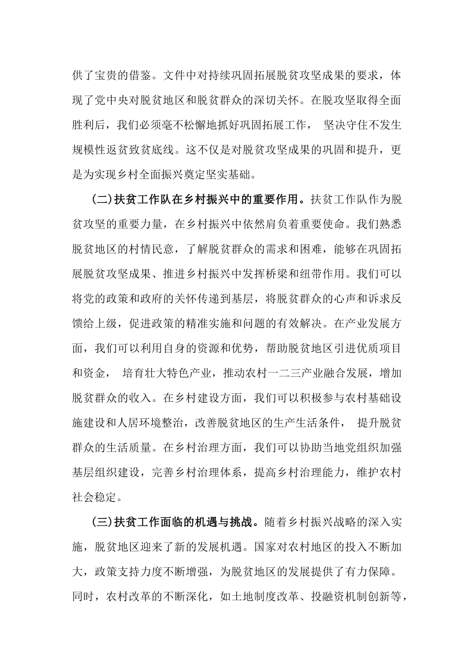 在党组理论学习中心组专题学习2025年中央一号文件研讨会上的发言稿5510字例文同志们:2025年2月23日,《中共中央国务院关于进一步深化农村改革扎实推进乡村全面振兴的意见》重磅发布,这是党的十八大以来第13个指导“三农”工作的中央一号文件,再次彰显了党中央对“三农”工作的高度重视和一以贯之的战略定力。文件围绕“两持续、四着力”,从持续增强粮食等重要农产品供给保障能力、持续巩固拓展脱贫攻坚成果、着力壮大县域富民产业等六个方面,对进一步深化农村改革、扎实推进乡村全面振兴作出了全面部署,为我们扶贫工作队的工作提供了根本遵循和行动指南。结合我们扶贫工作实际和农业工作实际,我谈几点体会。一、学深悟透文件精神,把握扶贫工作新使命(一)文件精神的核心要义与深远影响。2025年中央一号文件聚焦农村改革和乡村振兴,以“粮食安全和重要农产品的安全稳定供给”为首要任务,这不仅关系到国家的战略安全,更是我们扶贫工作的基础支撑。文件中提出的一系列改革举措,如深化农村土地制度改革、创新乡村振兴投融资机制等,将为农村经济发展注入新的活力,为脱贫地区和脱贫群众带来更多的发展机遇。文件强调的“千万工程”经验,以“生态宜居村庄美、兴业富民生活美、文明和谐乡风美”为目标,为我们推进乡村建设、提升乡村治理水平提供了宝贵的借鉴。文件中对持续巩固拓展脱贫攻坚成果的要求,体现了党中央对脱贫地区和脱贫群众的深切关怀。在脱攻坚取得全面胜利后,我们必须毫不松懈地抓好巩固拓展工作,坚决守住不发生规模性返贫致贫底线。这不仅是对脱贫攻坚成果的巩固和提升,更是为实现乡村全面振兴奠定坚实基础。(二)扶贫工作队在乡村振兴中的重要作用。扶贫工作队作为脱贫攻坚的重要力量,在乡村振兴中依然肩负着重要使命。我们熟悉脱贫地区的村情民意,了解脱贫群众的需求和困难,能够在巩固拓展脱贫攻坚成果、推进乡村振兴中发挥桥梁和纽带作用。我们可以将党的政策和政府的关怀传递到基层,将脱贫群众的心声和诉求反馈给上级,促进政策的精准实施和问题的有效解决。在产业发展方面,我们可以利用自身的资源和优势,帮助脱贫地区引进优质项目和资金,培育壮大特色产业,推动农村一二三产业融合发展,增加脱贫群众的收入。在乡村建设方面,我们可以积极参与农村基础设施建设和人居环境整治,改善脱贫地区的生产生活条件,提升脱贫群众的生活质量。在乡村治理方面,我们可以协助当地党组织加强基层组织建设,完善乡村治理体系,提高乡村治理能力,维护农村社会稳定。(三)扶贫工作面临的机遇与挑战。随着乡村振兴战略的深入实施,脱贫地区迎来了新的发展机遇。国家对农村地区的投入不断加大,政策支持力度不断增强,为脱贫地区的发展提供了有力保障。同时,农村改革的不断深化,如土地制度改革、投融资机制创新等,将激发农村经济发展的活力,为脱贫地区的产业发展和乡村建设创造更多的机会。然而,我们也必须清醒地认识到,扶贫工作仍然面临着诸多挑战。脱贫地区的产业基础依然薄弱,市场竞争力不强,抵御风险的能力较弱。脱贫群众的内生发展动力不足,部分群众存在“等靠要”思想,自我发展能力有待提高。农村基础设施和公共服务水平仍然较低,与城市相比还有较大差距。此外,随着经济社会的发展,脱贫地区面临着新的风险和挑战,如市场波动、自然灾害、疫情等,对巩固拓展脱贫攻坚成果带来了一定的压力。面对机遇与挑战,我们扶贫工作队要坚定信心,勇于担当,积极作为,充分发挥自身优势,抓住机遇,应对挑战,为巩固拓展脱贫攻坚成果、推进乡村振兴贡献力量。二、结合工作实际,落实乡村振兴重点任务(一)持续巩固拓展脱贫攻坚成果。强化防止返贫监测帮扶。建立健全防止返贫动态监测和帮扶机制,对脱贫不稳定户、边缘易致贫户,以及因病因灾因意外事故等刚性支出较大或收入大幅缩减导致基本生活出现严重困难户,开展常态化监测,重点监测其收入支出状况、“两不愁保障”及饮水安全状况。每月至少开展一次全面排查,及时掌握农户的实际情况,对存在返贫致贫风险的农户,按照“一户一策”的原则,制定针对性的帮扶措施,做到早发现、早干预、早帮扶。今年以...