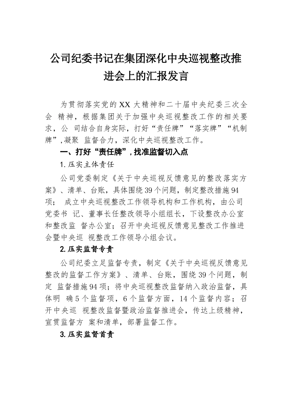 公司纪委书记在集团深化中央巡视整改推进会上的汇报发言为贯彻落实党的XX大精神和二十届中央纪委三次全会精神,根据集团关于加强中央巡视整改工作的相关要求,公司结合自身实际,打好“责任牌”“落实牌”“机制牌”,凝聚监督合力,深化中央巡视整改工作。一、打好“责任牌”,找准监督切入点1.压实主体责任公司党委制定《关于中央巡视反馈意见的整改落实方案》、清单、台账,具体围绕39个问题,制定整改措施94项;成立中央巡视整改工作领导机构和工作机构,由公司党委书记、董事长任整改领导小组组长,下设整改办公室和整改监督办公室;召开中央巡视反馈意见整改工作推进会暨中央巡视整改工作领导小组会议。2.压实监督专责公司纪委立足监督专责,制定《关于中央巡视反馈意见整改的监督工作方案》、清单、台账,围绕39个问题,制定监督措施94项;将中央巡视整改监督纳入政治监督,具体明确5个监督项,6个监督方面,14个监督内容;召开中央巡视整改监督暨政治监督推进会,传达上级精神,宣贯监督方案和清单,部署监督工作。3.压实监督首责公司纪委围绕中央巡视整改监督工作方案制定分部门的监督检查记录表,细化问题清单,督促各相关部门守住监督第一道防线,推进中央巡视整改工作落实落细。二、打好“落实牌”,强化监督执行力1.统筹督导工作公司纪检监督工作部协同综合办公室、总部相关部门成立专项督导组,围绕中央巡视整改工作,负责对各项目部进行指导督导,重点检视责任落实情况、组织推动情况、成果成效情况、推动发展情况4个方面内容。2.紧抓问题销项公司纪委根据公司的中央巡视整改监督清单和政治监督清单,通过现场检查、查阅资料等方式积极推动各部门在规定时间内,进行问题销项。针对到期未销项,不符合销项标准的,下发反馈函2份,督促完成序时销项率100%。3.开展监督检查公司纪委配合集团开展中央巡视整改监督检查并对照《中央巡视整改监督检查清单》,围绕政治监督清单落实情况、业务系统问题整改情况、立项监督开展情况3个检查类别,16个检查对象,38项检查事项开展监督自查,发现问题2个。三、打好“机制牌”,推动监督常态化1.紧盯过程管控公司纪委监督各相关部门落实会议机制、督导机制、监督机制、会商机制、报告机制等,细化落实巡视整改工作机制,持续加强日常整改管控。2.制定考核标准公司纪委监督党委出台中央巡视整改暨“六个专项行动”考核方案,方案覆盖中央巡视整改、“六个专项行动”参与部门和各项目部党组织,实现分阶段、分部门、分任务的考核,充分发挥考核引领作用。3.完善验收机制公司纪委监督党委出台《关于落实巡视整改验机制常态运行的通知》,明确普检、复检、备案三项销项验收流程,台账填报、销项管理、验收管理、责任追究四项具体工作要求,推动验收工作常态化、规范化运行。下一步,公司纪委将继续打好“三张牌”,履行监督专责,发挥协同高效的监督合力,推进中央巡视整改工作取得实效,助力企业高质量发展。
