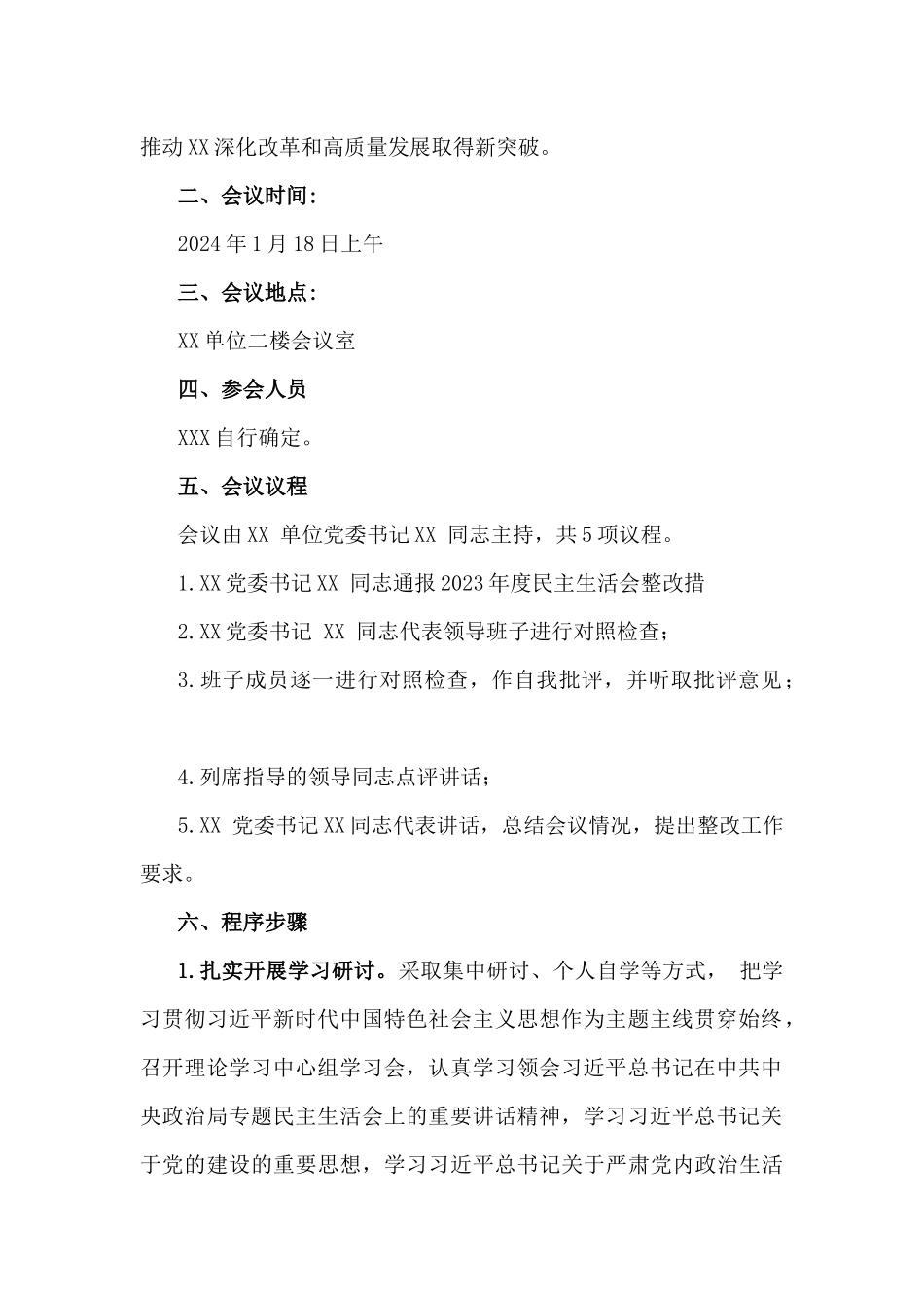 2025年专题生活会带头增强党性、严守纪律、砥砺作风等“四个带头方面”实施方案、个人对照发言材料【2篇文】2025年专题生活会带头增强党性、严守纪律、砥砺作风等“四个带头方面”实施方案四个带头:(一)带头严守政治纪律和政治规矩,维护党的团结统一方面(二)带头增强党性、严守纪律、砥砺作风方面(三)带头在遵规守纪、清正廉洁前提下勇于担责、敢于创新方面(四)带头履行全面从严治党政治责任方面【正文】按照县纪委、县委组织部的相关要求,结合工作实际,就开好XX单位2024年度民主生活会,制定方案如下:一、会议主题深入学习贯彻习近平新时代中国特色社会主义思想,巩固深化党纪学习教育成果,综合发挥党的纪律教育约束、保障激励作用,为进一步全面深化改革、推进中国式现代化提供坚强纪律保证。认真学习领会习近平总书记重要讲话精神,强化党中央对基层工作集中统一领导,强化风险防控,强化全面从严治党严的氛围,以整改推动XX深化改革和高质量发展取得新突破。二、会议时间:2024年1月18日上午三、会议地点:XX单位二楼会议室四、参会人员XXX自行确定。五、会议议程会议由XX单位党委书记XX同志主持,共5项议程。1.XX党委书记XX同志通报2023年度民主生活会整改措2.XX党委书记XX同志代表领导班子进行对照检查;3.班子成员逐一进行对照检查,作自我批评,并听取批评意见;4.列席指导的领导同志点评讲话;5.XX党委书记XX同志代表讲话,总结会议情况,提出整改工作要求。六、程序步骤1.扎实开展学习研讨。采取集中研讨、个人自学等方式,把学习贯彻习近平新时代中国特色社会主义思想作为主题主线贯穿始终,召开理论学习中心组学习会,认真学习领会习近平总书记在中共中央政治局专题民主生活会上的重要讲话精神,学习习近平总书记关于党的建设的重要思想,学习习近平总书记关于严肃党内政治生活的重要讲话和重要指示批示精神,学习习近平总书记关于树立和践行正确政绩观的重要论述,学习贯彻习近平总书记考察XX重要讲话精神,学习党章、新形势下党内政治生活若干准则、《中国共产党纪律处分条例》和《县以上党和国家机关党员领导干部民主生活会若干规定》等,通过深入学习研讨,打牢开好专题民主生活会的思想基础。2.深入开展谈心谈话。班子成员相互之间面对面开展谈心谈话,开诚布公不足、推心置腹提建议,既谈收获体会又谈差距不足,既谈自身缺点又谈对方问题,努力把问题谈开、把思想谈通、把意见谈实、把改进方向谈明白,消除隔阂、加深了解、增进信任。谈心谈话要谈到位、真交心,防止泛泛而谈,防止只谈工作不触及思想,防止把谈心谈话变成简单交换会上批评意见。每位党员领导干部至少要给其他同志提1条有内容、有质量的批评意见。3.全面梳理突出问题。领导班子和党员领导干部要紧紧围绕以下四个方面进行对照检查:一是带头严守政治纪律和政治规矩,维护党的团结统一方面。是否做到健全落实以学铸魂、以学增智、以学正风、以学促干长效机制,深刻领悟“两个确立”的决定性意义,坚决做到“两个维护”,自觉防止和反对个人主义、分散主义、自由主义、本位主义,自觉在思想上政治上行动上同以习近平同志为核心的党中央保持高度一致等。二是带头增强党性、严守纪律、砥砺作风方面。是否做到始终用党性原则修身律己,时刻以《条例》等党规党纪为标尺从严从实检身正己,把党的纪律内化为日用而不觉的言行准则,公正用权、依法用权、为民用权、廉洁用权,锲而不舍落实中央八项规定及其实施细则精神,自觉践行社会主义核心价值观等。三是带头在遵规守纪、清正廉洁前提下勇于担责、敢于创新方面。是否做到聚焦推动高质量发展,强化将改革进行到底的坚定决心和历史担当,以攻坚克难、迎难而上的政治勇气,直面矛盾问题不回避,铲除顽瘴痼疾不含糊,应对风险挑战不退缩,奋力打开改革发展新天地。树立和践行正确政绩观,坚决防范化解重点领域风险,坚决防范整治急功近利、好大喜功、寅吃卯粮甚至弄虚作假等行为,深化整治形式主义为基层减负,着力解决群众急难愁盼问题,走好新时代党的群众路线等。四是带头履行全面从严治党政治责任方面。是否做到坚持用改革精神和严的标准管党治党,坚持...
