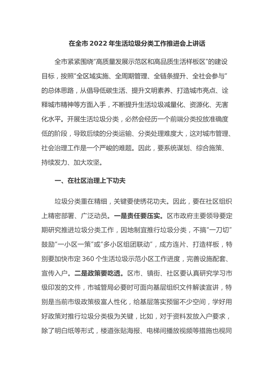 在全市2022年生活垃圾分类工作推进会上讲话全市紧紧围绕“高质量发展示范区和高品质生活样板区”的建设目标,按照“全区域实施、全周期管理、全链条提升、全社会参与”的总体思路,从倡导低碳生活、提升文明素养、打造城市亮点、诠释城市精神等方面入手,不断提升生活垃圾减量化、资源化、无害化水平。开展生活垃圾分类,必然会经历一个前端分类投放准确度低的阶段,导致后续的分类运输、分类处理难度大,这对城市管理、社会治理工作是一个严峻的难题。因此,要系统谋划、综合施策、持续发力、加大攻坚。一、在社区治理上下功夫垃圾分类重在精细,关键要使绣花功夫。因此,要在社区组织上精密部署、广泛动员。一是责任要压实。区市政府主要领导要定期研究推进垃圾分类工作,因地制宜推行垃圾分类,不搞“一刀切”鼓励“一小区一策”或“多小区组团联动”,成方连片、打造样板,特别要加快市定360个生活垃圾示范小区工作进度,完善设施配套、宣传入户。二是政策要吃透。区市、镇街、社区要认真研究学习市级印发的文件,市城管局必要时可面向基层组织文件解读宣讲,特别是当前市级政策极富人性化,给基层落实预留不少空间,学好用好政策对推行垃圾分类极为关键,比如,对于资料发放入户要求,除了明白纸等形式,楼道张贴海报、电梯间播放视频等措施也视同宣传到户。如果区市、镇街、社区对政策不深看细问、得过且过,有可能出现“一刀切”情况。尤其是当前国内疫情多点散发,不少社区居民对垃圾分类入户宣传有抵触心理,加之,社区工作任务繁重,基层干部疲于应付,充分证明学好政策利于推进工作。三是模式要创新。开展垃圾分类指导工作是社区组织动员垃圾分类的重要任务,开发区推行“三定一督”的现场指导模式、**区厨余垃圾实施“家庭小绿桶”代替现场指导等模式都具有一定的探路意义。暗访期间,芝罘区塔山小区社区居委会正在进行垃圾分类讲座,“红色文化”的小院社区宣传栏展示有垃圾分类宣传活动的照片,宣传氛围浓厚。据现场群众介绍,**小区分类指导工作主要依托社区文艺社团,分类指导员由社团成员担任。市城管局负责总结推广各区市、社区垃圾分类成熟的运行模式和经验做法,不定期组织经验交流,加快创新模式在全市的推广应用。鼓励各区市有条件的成熟社区充分运用物联网、大数据、人工智能等技术,建设生活垃圾分类全过程信息管理系统,对市区生活垃圾分类投放、分类收集、分类运输、分类处理,全程实现数字化监管,实现“数据一个库、监管一张图、管理一条线、考核一张表”,提高生活垃圾分类效率效益。通过建立市民垃圾分类家庭账户,及时掌握市民的垃圾分类参与率、准确率,精准建立激励机制,调动公众参与垃圾分类的主动性、积极性。四是设施要提升。各区要合理布局建设厨余垃圾中转站或就地化处理设施,减少运行成本。随着可回收物和有害垃圾分类比例提高,各区要按照《**市区生活垃圾分类专项规划》,建设可回收物分拣站,站内应配备大件垃圾破解设备、有害垃圾临时贮存设备、垃圾桶清洗设备,实现功能综合化。每个街道办事处至少设置1处大件垃圾、装修垃圾集中投放点,并选取显要位置向辖区居民公示,满足市民更新家居生活设施的需要。二、在工作机制上抓合力一是强化领导小组工作体系。市生活垃圾分类工作领导小组要加强领导,领导小组办公室(市城管局)负责统筹做好监督、指导、考核各区及各有关部门落实生活垃圾分类和减量工作,领导小组成员单位根据职责清单分工负责、互相配合。二是建立完善联席会议制度。领导小组办公室(市城管局)负责定期调度垃圾分类工作有关问题,对跨部门、跨领域复杂问题要及时组织有关部门会商研究,明确推进措施办法,特别要加强全国城市垃圾分类考核落后指标的会商研究,争取位次前移;市商务局负责废金属、废塑料、废纸张等可回收物统计摸底,建立统计制度。领导小组成员单位要主动认领,牵头抓好负责的考核任务,研究推进解决本行业、本领域实施垃圾分类工作中的有关问题,自行协调解决跨部门、跨领域一般问题,对复杂问题要及时提请领导小组办公室(市城管局)组织召开联席会议,会商推动解决问题。领导小组组长(市政府分管...