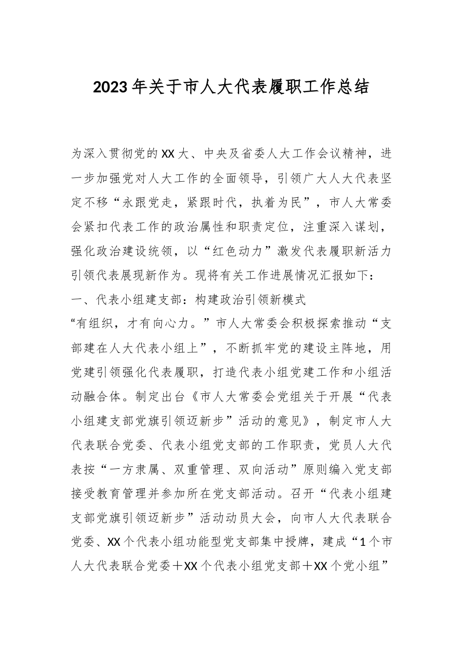 2023年关于市人大代表履职工作总结为深入贯彻党的XX大、中央及省委人大工作会议精神,进一步加强党对人大工作的全面领导,引领广大人大代表坚定不移“永跟党走,紧跟时代,执着为民”,市人大常委会紧扣代表工作的政治属性和职责定位,注重深入谋划,强化政治建设统领,以“红色动力”激发代表履职新活力引领代表展现新作为。现将有关工作进展情况汇报如下:一、代表小组建支部:构建政治引领新模式“有组织,才有向心力。”市人大常委会积极探索推动“支部建在人大代表小组上”,不断抓牢党的建设主阵地,用党建引领强化代表履职,打造代表小组党建工作和小组活动融合体。制定出台《市人大常委会党组关于开展“代表小组建支部党旗引领迈新步”活动的意见》,制定市人大代表联合党委、代表小组党支部的工作职责,党员人大代表按“一方隶属、双重管理、双向活动”原则编入党支部接受教育管理并参加所在党支部活动。召开“代表小组建支部党旗引领迈新步”活动动员大会,向市人大代表联合党委、XX个代表小组功能型党支部集中授牌,建成“1个市人大代表联合党委+XX个代表小组党支部+XX个党小组”的组织体系,实现了XXX名党员人大代表全覆盖,XX名非党员人大代表列席XX个支部参加活动。全市共成立市、县、乡三级功能型党支部XXX个。分批举办市人大代表政治建设培训班。常态化组织活动,把思想政治建设与代表履职学习相融合、党员活动与代表履职活动相融合,每季度开展一次党支部活动各代表小组党支部依据“地缘”或“业缘”成立2-3个党小组,灵活机动开展党小组活动,把好代表履职方向、提升代表履职能力,增强代表履职质效。二、全过程人民民主:拓展民意汇集新渠道民心是最大的政治,民意是人大工作的基础。2022年以来,市人大常委会通过建立完善农情、民情、经济监督、立法“四大联系点”,更好地收集民意、汲取民智,积极引导人大代表履职尽责,深化推进全过程人民民主落细落地。创新设立XXX个农情联系点,人大代表参与其中,通过定期发放调查表、召开座谈会等方式,直观了解农村现状、农民诉求和农业发展情况,反映农民最真实、最迫切的心声,切实帮助基层推进和解决问题。代表履职一刻也离不开群众的参与和支持,以“线上+线下模式”,探索构建XX个民情联系点,涉及代表所在单位、基层人大、社会面,涵盖代表联络站和政府热线、网络平台等,全方位多渠道听民声纳民意。聚焦“第一要务”。助力经济发展、护航法治建设是代表履职的重要任务,先后在企业、开发园区及服务业集聚区、行业协会和社会团体设立XX个经济监督联系点,组织代表开展调查研究,提出意见建议。在乡镇、街道、社区、企业、律所和行业管理协会等建立21个立法联系点,深入征询,全面推进良法善治民主进程。三、厚植为民情怀:推动代表履职新实践代表履职重在“怀为民之心,办为民之事”,代表工作重在科学谋划、精心实施。结合人大对“一府一委两院”监督职权,深入开展“请代表监督、让人民满意”法检两院行活动,通过市县联动,各级人大代表主动参与、全程互动,持续推动“三看三促进”,即看作风建设,促进政治能力新提升;看服务发展,促进法治保障新提升;看办案质效,促进公正司法新提升。强化群众诉求回应。群众诉求是代表履职的第一信号。2022年以来,市人大常委会紧盯民生难题,成立人大代表参与的“医养结合”专题调研组,摸清家底、反映实情。牵头建立疫情防控应急指挥机制群众诉求专班,严格流程时效,对群众诉求进行分类和分析。全年常态化组织代表进联络工作站,接待群众来信来访、收集意见建议,第一时间转办交办,确保群众诉求件件有答复。为强化代表建议督办,依法作出决定,全程跟踪督办关于“聚焦共同富裕,持续增进民生福祉”的议案;建立市人大常委会领导牵头督办、市政府领导负责领办、各专工委分类督办、人代联委抓总兜底的建议办理模式,动员代表参与跟进,增强监督合力,提升办理质效。四、注重从严从实:完善代表履职新机制人大代表是国家权力机关的组成人员,是人民权力的受托者,其作用能否充分发挥,根本在于精心引导、科学规范市人大常委会探索实施人大代表履职情况通报制度,全...