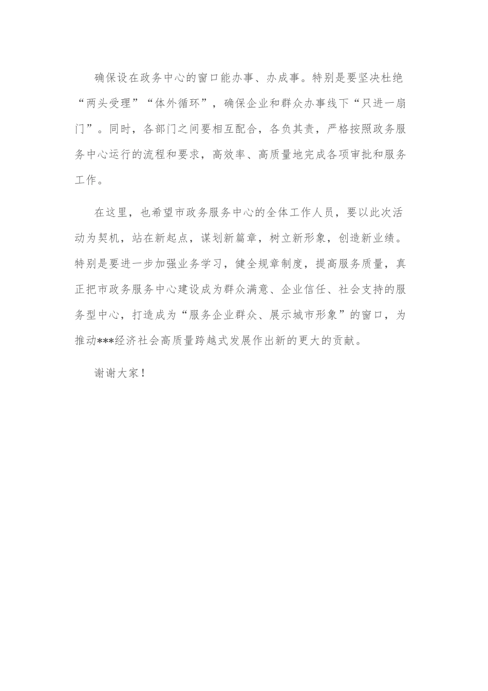 在市政务服务中心揭牌仪式上的讲话各位领导、各位市民朋友、同志们:今天,我们在这里隆重举行“***政务服务中心服务升级活动”启动仪式。在此,我谨代表中共***委、市人民政府,对新市政务服务中心运营开放,表示热烈的祝贺!对广大市民朋友,表示诚挚的欢迎!向广大建设者、工作者,表示亲切的慰问和衷心的感谢!过来,由于市政务服务中心场地有限,进驻部门和事项不全,企业和群众办事“多头跑”“进多门”的情况普遍存在。对此,在财政资金仅能“保工资、保运转”的情况下,市委、市政府坚定不移地启动了新政务服务中心建设,并要求各单位坚决做到政务服务事项“应进必进”,真正实现“一站式服务”。新市政务服务中心的建成,标志着我市在转变政府职能,深化“放管服”改革,优化营商环境,推进“一件事一次办”改革方面又迈出了坚实的一步。为充分发挥新政务服务中心的作用,给企业和群众提供更有质量、更为高效的政务服务,我们决定开展“***政务服务中心服务升级活动”。各进驻部门和单位,务必要始终坚持“以人民为中心”的发展理念,站在全局的高度,进一步提高政治意识、大局意识和责任意识,严格按照“三集中三到位”和“一件事一次办”要求,认真调整内部运行模式,正确处理好窗口前方和部门后方的关系,实现与服务中心运行机制的有机衔接,做到“机关围绕窗口转、窗口围绕群众转”,确保设在政务中心的窗口能办事、办成事。特别是要坚决杜绝“两头受理”“体外循环”,确保企业和群众办事线下“只进一扇门”。同时,各部门之间要相互配合,各负其责,严格按照政务服务中心运行的流程和要求,高效率、高质量地完成各项审批和服务工作。在这里,也希望市政务服务中心的全体工作人员,要以此次活动为契机,站在新起点,谋划新篇章,树立新形象,创造新业绩。特别是要进一步加强业务学习,健全规章制度,提高服务质量,真正把市政务服务中心建设成为群众满意、企业信任、社会支持的服务型中心,打造成为“服务企业群众、展示城市形象”的窗口,为推动***经济社会高质量跨越式发展作出新的更大的贡献。谢谢大家!