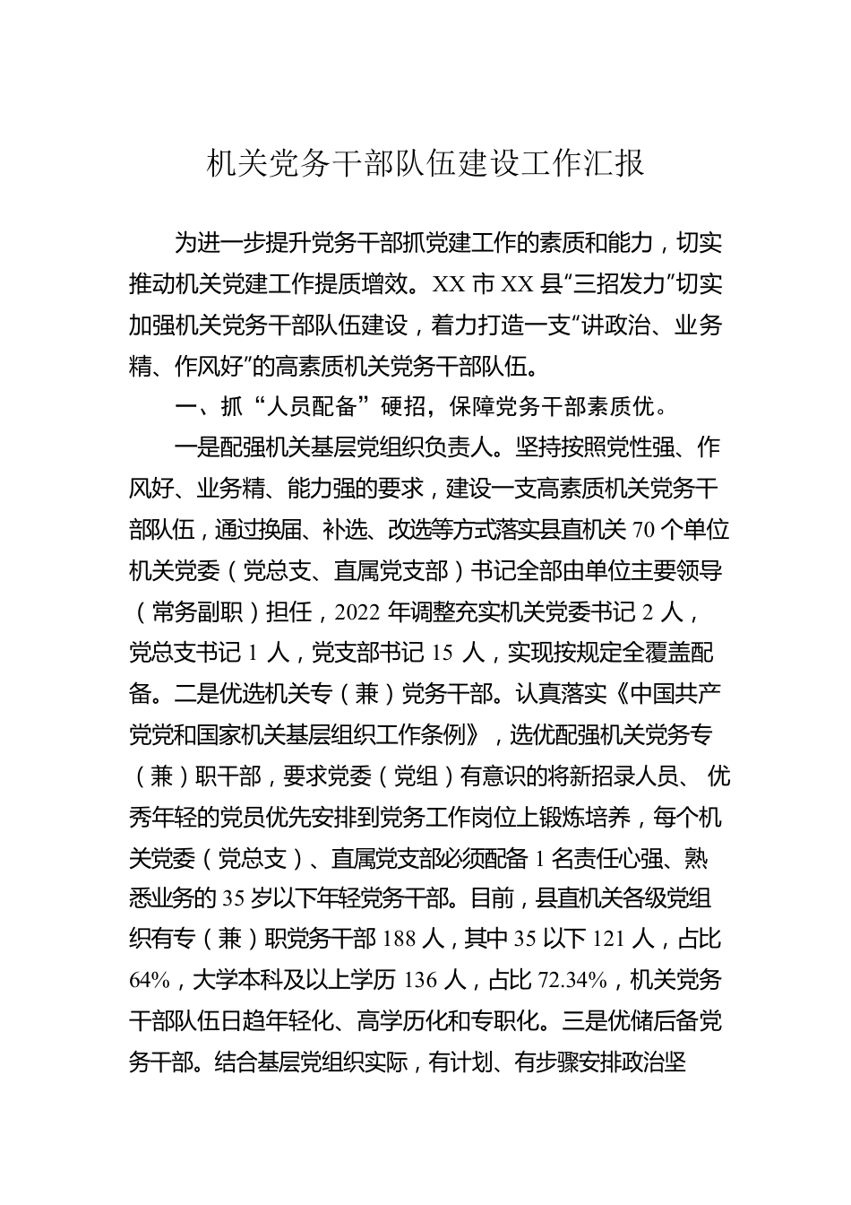 机关党务干部队伍建设工作汇报为进一步提升党务干部抓党建工作的素质和能力,切实推动机关党建工作提质增效。XX市XX县“三招发力”切实加强机关党务干部队伍建设,着力打造一支“讲政治、业务精、作风好”的高素质机关党务干部队伍。一、抓“人员配备”硬招,保障党务干部素质优。一是配强机关基层党组织负责人。坚持按照党性强、作风好、业务精、能力强的要求,建设一支高素质机关党务干部队伍,通过换届、补选、改选等方式落实县直机关70个单位机关党委(党总支、直属党支部)书记全部由单位主要领导(常务副职)担任,2022年调整充实机关党委书记2人,党总支书记1人,党支部书记15人,实现按规定全覆盖配备。二是优选机关专(兼)党务干部。认真落实《中国共产党党和国家机关基层组织工作条例》,选优配强机关党务专(兼)职干部,要求党委(党组)有意识的将新招录人员、优秀年轻的党员优先安排到党务工作岗位上锻炼培养,每个机关党委(党总支)、直属党支部必须配备1名责任心强、熟悉业务的35岁以下年轻党务干部。目前,县直机关各级党组织有专(兼)职党务干部188人,其中35以下121人,占比64%,大学本科及以上学历136人,占比72.34%,机关党务干部队伍日趋年轻化、高学历化和专职化。三是优储后备党务干部。结合基层党组织实际,有计划、有步骤安排政治坚定、作风优良、能力突出的年轻党员从事党务辅助性工作,通过思想淬炼、岗位历练、实践锻炼,持续学习党建工作基础知识和党务工作基本方法,解决短期内无人可用等实际问题的同时,培养锻炼政治能力,把后备党务干部培养成政治素过硬、业务能力精湛的党建工作内行人。二、抓“业务培训”真招,促进党务干部业务强。通过教育培训、实践锻炼等多种方式,引导党务工作者不断提高“七种能力”和“八项本领,不断提高做好党务工作的业务素养。一是集中培训固根本。积极邀请市直机关工委、县委组织部、县委宣传部等长期从事党员发展、党员身份认定、组织建设、政治理论研究、意识形态等工作的领导和业务骨干开展政治思想理论教育和党务工作业务培训。二是分类培训强技能。根据党务干部任职时间、党组织类型等特点,采取分级、分类的方式开展培训,不断提高县直机关党员和党务干部业务能力和政治素质,提高县直机关党务干部自觉担当、主动作为的责任感和使命感,从而推动各项任务落实到位。2022年,举办党组织书记、党务干部、党内统计业务培训班4期600余人次。三是上门培训送需求。坚持按需培训原则,针对不同领域、不同行业系统的党务干部,根据不同需求制定相应的培训方案,组建培训工作组到各基层党组织开展“送训上门”,不断强化培训针对性和时效性,全力将党务干部培养成抓机关党建的“行家里手”。2022年,组织4名业务骨干到部门累计开展现场业务培训26次。三、抓“关怀激励”实招,促进党务干部干劲足。坚持严格管理和关心信任相统一,政治上激励、工作上支持、待遇上保障、生活上关怀,增强党务干部的荣誉感、归属感、获得感。一是谈心谈话解心结。坚持落实谈心谈话制度,党委(党组)书记定期与党务干部交心谈心,了解党务干部工作上、生活中遇到的瓶颈,及时帮助党务干部理顺情绪、释疑解惑、提振精神、加油鼓劲。工作人员不定期与基层党务干部交流谈心,及时了解基层党组织党员干部对工作的意见建议,及时化解在工作中产生的隔阂,当好机关党务干部的“娘家人”。2022年,各级党组织书记、工委工作人员与党务干部交流谈心达600余次。二是走访慰问送关怀。在元旦、春节、“七一”等时间节点对因公伤残、因病住院的困难党务工作者开展走访慰问,2022年以来,在元旦、春节、“七一”期间累计慰问困难党务工作者23人次,发放慰问金14000元。三是激励保障鼓后劲。有计划的安排专(兼)职党务干部同行政、业务工作人员双向交流,把表现出色、能力较强、成绩突出的优秀党务工作者重点培养提拔,在年度考核、评先选优、提拔任用时,同等条件下优先考虑党务干部,不断激发基层党务工作者干事创业的激情。