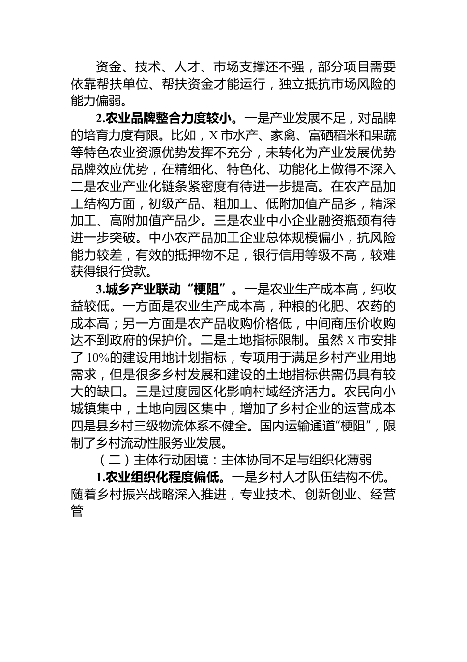 关于全面推进乡村振兴的调研与思考乡村振兴战略是一项复杂的系统工程。X各地需要立足区域发展布局,牢固树立乡村振兴一盘棋的思想,统筹协调强化资源要素保障,守住粮食安全和不发生规模性返贫两条底线,扎实推进重点农业产业链建设、乡村建设行动以及乡村治理,推动农业农村现代化迈出新步伐。一、X全面推进乡村振兴面临的现实困境当前,X全市共有乡村人口209万,占全市总人口的35.91%,共有乡镇92个、行政村2253个,农村人口多,发展任务重。虽然X农业农村工作取得了一些成绩,但与其他农业强市相比,还有一些短板和差距,在乡村振兴战略推进实践中存在现实困境。(一)产业动能困境:产业关联存在链接“断点”1.农业产业综合竞争力较弱。一是农业产业化水平还不高。X全市农产品综合加工率约为70%,精深加工率只有20%左右。六大重点农业产业链建设存在短板,农业产业化龙头企业数量不多,农产品特色品牌竞争力不强,产业链还不够强,附加值不高。三产融合的层次不高,规模不大二是政策兜底刚性需求大。2022年以来,新认定的贫困监测对象大多是因病、因残或者突发事故导致家庭失去了主要收入来源,人均收入立刻下降到贫困线以下造成贫困。三是产业基础不够牢固。农村地区产业帮扶项目基本拥有了较好的基础,但资金、技术、人才、市场支撑还不强,部分项目需要依靠帮扶单位、帮扶资金才能运行,独立抵抗市场风险的能力偏弱。2.农业品牌整合力度较小。一是产业发展不足,对品牌的培育力度有限。比如,X市水产、家禽、富硒稻米和果蔬等特色农业资源优势发挥不充分,未转化为产业发展优势品牌效应优势,在精细化、特色化、功能化上做得不深入二是农业产业化链条紧密度有待进一步提高。在农产品加工结构方面,初级产品、粗加工、低附加值产品多,精深加工、高附加值产品少。三是农业中小企业融资瓶颈有待进一步突破。中小农产品加工企业总体规模偏小,抗风险能力较差,有效的抵押物不足,银行信用等级不高,较难获得银行贷款。3.城乡产业联动“梗阻”。一是农业生产成本高,纯收益较低。一方面是农业生产成本高,种粮的化肥、农药的成本高;另一方面是农产品收购价格低,中间商压价收购达不到政府的保护价。二是土地指标限制。虽然X市安排了10%的建设用地计划指标,专项用于满足乡村产业用地需求,但是很多乡村发展和建设的土地指标供需仍具有较大的缺口。三是过度园区化影响村域经济活力。农民向小城镇集中,土地向园区集中,增加了乡村企业的运营成本四是县乡村三级物流体系不健全。国内运输通道“梗阻”,限制了乡村流动性服务业发展。(二)主体行动困境:主体协同不足与组织化薄弱1.农业组织化程度偏低。一是乡村人才队伍结构不优。随着乡村振兴战略深入推进,专业技术、创新创业、经营管理等方面人才需求越来越大,人才总量不足的问题日渐凸显。与此同时,大量农村人才不断流入城市,留在农村的人才呈现渐老渐衰之势,导致城乡人才结构失衡。二是农民群众主体作用发挥不明显,主动参与意识不强。在实施乡村振兴战略过程中,调动广大群众的积极性、主动性、创造性不够,不同程度存在“政府干,农民看”和“干部干,群众看”的现象,农民群众在乡村建设中的主人翁意识不强。部分群众对于巩固脱贫攻坚成果和乡村振兴工作缺乏参与性、主动性和积极性。三是农业生产标准化程度低标准化生产是农业对接市场的有效方式。比如,X市的鮰鱼养殖业,农民很难统一产品品质、规格和品种。2.农技人员和新型农业经营主体不足。乡镇综合配套改革后,X全市4.5万余名基层农技人员全部退出事业编制,目前通过以钱养事方式聘用的农技人员只有1635名,其中50岁以上的有919人、占56.2%,既存在数量上的缺口,又面临年龄老化的问题。此外,新型经营主体仍然小散弱。目前,X全市新型农业经营主体共有3.13万家,其中家庭农场1.7万家,每家年平均经营收入22.2万元,比全省平均25.6万元低3.4万元;X全市市场登记的农民合作社共有1.1万家。全省共有国家级示范社9000家、社均年经营收入1514万元,X市只有469家、社均年经营收入约1200万元。新型经营主体自身实力不强,联农带农作用还不明显。3.党员干部认识有待...