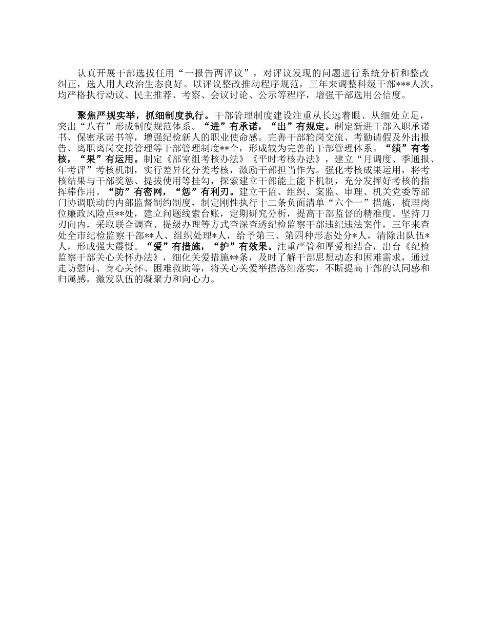市纪委监委关于纪检监察干部队伍建设经验总结材料**市纪委监委坚持严的主基调贯穿干部队伍建设,聚焦思想建设、选任监督、制度约束,严实管理抓早抓常,着力锻造纯度更高、成色更足的纪检监察铁军,推进纪检监察事业高质量发展,2022年市纪委监委荣获“全国纪检监察系统先进集体”。现将有关工作进展情况汇报如下:聚焦深学细导,抓实政治建设。突出政治建设、思想教育首要任务,多措并举锻造纪检监察干部的政治能力与政治品格。以“三训”为重要载体,深化政治学习。抓好集中调训、专题轮训、跟班实训。以年轻干部集训班、纪委书记轮训班、纪检监察干部调训班为主体,将习近平新时代中国特色社会主义思想和党的二十大精神专题学习纳入干部“必修课”,三年来开展集中学习**次,专题培训**期,邀请专家教授**余名先后集中授课,累计覆盖*万余人次。出台《2021—2023年**市纪检监察干部素能提升工作规划》,建立百名师资库、百堂精品课程库。集训班实行“导师”带教、半军事化封闭式管理,以严学风促严作风,让培训的过程成为学员增强责任意识、锤炼党性作风的有效过程。以“三会”为重要阵地,锤炼政治能力。党组织生活会多样化。通过集中学习研讨、红色教育等形式,增进纪检监察干部对党的政治认同、理论认同和情感认同。青年干部座谈会常态化。每期确定一个政治主题,书记“出题”,青年干部“答题”,全体干部“阅卷”,提高青年干部的政治素养。案例讲评会制度化。开展案例讲评11起,从政治上看、政治上查,找准“病灶”、对症“开方”,提高处置重大复杂问题的政治能力。以“三抓”为重要内容,锻造政治品格。抓领导示范。强化敢于斗争的政治品格和无私奉献的大我精神,委领导和部门负责人率先垂范,带领一线干部埋头躬耕、夜以继日,案件查办尤其是大要案的数量质量呈上升趋势,重点查办了国资、政法、民生等领域腐败案件,追赃止损挽损**余亿元,三个效果持续彰显。抓先进引路。组织参加全国、全省评先评优,**人获得省级以上荣誉,组织“最美纪检人”评选和宣讲,安排本委全国优秀党务工作者、全国扫黑除恶工作嘉奖获得者交流分享,营造比学赶超的良好氛围。抓反面警示。连续5年制作《初心与蜕变》,定期组织观看警示教育片,及时通报本市纪检监察干部违纪违法典型案例,用身边事教育身边人,砥砺纪检监察干部清正廉洁的政治本色。聚焦高标底线,抓严干部选任。执行最严格的干部选用标准和程序,以四个“坚决”为纪检监察干部队伍提纯增色。考察不过关的坚决不进。加强与组织、公安、检察、法院、信访等部门的联系,建立部门联动、信息联查、结果联用的选用监督体系,实行新进干部家访走访、个人事项报告等制度,三年来新进干部**人,通过家访和征求意见等,有*名干部被否决。“体检”有瑕疵的坚决交流。全覆盖开展“政治体检”,对委机关、派驻纪检监察组干部政治建设考察***余人次,对*个县市区纪委监委班子进行两轮“政治画像”,*名干部因不适宜纪检工作交流出去。人岗不相适的坚决调整。根据干部政治素养、履职能力、性格特征、专业结构等情况,把业务骨干使用到专业岗位,把综合素质高的干部放到重要岗位,对不适宜现职干部进行及时调整。三年来市管干部调整**人次,科级干部交流***人次,其中因不胜任岗位调整的**人次。评议有问题的坚决纠正。认真开展干部选拔任用“一报告两评议”,对评议发现的问题进行系统分析和整改纠正,选人用人政治生态良好。以评议整改推动程序规范,三年来调整科级干部***人次,均严格执行动议、民主推荐、考察、会议讨论、公示等程序,增强干部选用公信度。聚焦严规实举,抓细制度执行。干部管理制度建设注重从长远着眼、从细处立足,突出“八有”形成制度规范体系。“进”有承诺,“出”有规定。制定新进干部入职承诺书、保密承诺书等,增强纪检新人的职业使命感。完善干部轮岗交流、考勤请假及外出报告、离职离岗交接管理等干部管理制度**个,形成较为完善的干部管理体系。“绩”有考核,“果”有运用。制定《部室组考核办法》《平时考核办法》,建立“月调度、季通报、年考评”考核机制,实行差异化分类考核,激励干部担当作为。强化...