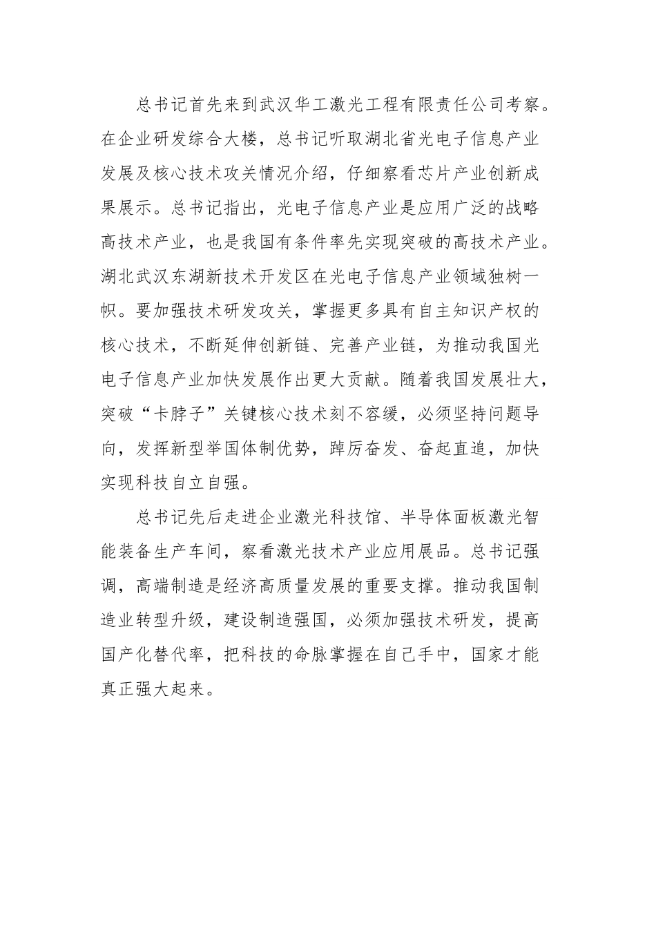习近平总书记在湖北武汉考察重要讲话精神的传达提纲及贯彻意见一、精神概况28日下午,习近平总书记在湖北省委书记王蒙徽、省长王忠林陪同下,深入武汉的企业、社区调研。总书记强调,科技自立自强是国家强盛之基、安全之要。我们必须完整、准确、全面贯彻新发展理念,深入实施创新驱动发展战略,把科技的命脉牢牢掌握在自己手中,在科技自立自强上取得更大进展,不断提升我国发展独立性、自主性、安全性,催生更多新技术新产业,开辟经济发展的新领域新赛道,形成国际竞争新优势。总书记首先来到武汉华工激光工程有限责任公司考察。在企业研发综合大楼,总书记听取湖北省光电子信息产业发展及核心技术攻关情况介绍,仔细察看芯片产业创新成果展示。总书记指出,光电子信息产业是应用广泛的战略高技术产业,也是我国有条件率先实现突破的高技术产业。湖北武汉东湖新技术开发区在光电子信息产业领域独树一帜。要加强技术研发攻关,掌握更多具有自主知识产权的核心技术,不断延伸创新链、完善产业链,为推动我国光电子信息产业加快发展作出更大贡献。随着我国发展壮大,突破“卡脖子”关键核心技术刻不容缓,必须坚持问题导向,发挥新型举国体制优势,踔厉奋发、奋起直追,加快实现科技自立自强。总书记先后走进企业激光科技馆、半导体面板激光智能装备生产车间,察看激光技术产业应用展品。总书记强调,高端制造是经济高质量发展的重要支撑。推动我国制造业转型升级,建设制造强国,必须加强技术研发,提高国产化替代率,把科技的命脉掌握在自己手中,国家才能真正强大起来。在车间大楼前,总书记同企业职工亲切交流。总书记指出,我国是世界第二大经济体,但还有不少短板,一些产业的基础还不是很牢固,进一步发展必须靠创新。全面建设社会主义现代化国家,实现第二个百年奋斗目标,创新是一个决定性因素。党中央高度重视科技创新,实施科教兴国战略和创新驱动发展战略。如果我们每一座城市、每一个高新技术开发区、每一家科技企业、每一位科研工作者都能围绕国家确定的发展方向扎扎实实推进科技创新,那么我们就一定能够实现既定目标。我们这一代人必须承担起这一光荣使命。科技创新,一靠投入,二靠人才。看到这里聚集了不少精英人才,大家都很年轻,充满活力,我感到很高兴。党中央十分关心科技人才成长,各级党委和政府要尽可能创造有利于科技创新的体制机制和工作生活环境,让科技工作者为祖国和人民作贡献。希望大家继续努力,取得更大成绩。总书记随后来到东湖高新区左岭街道智苑社区考察。该社区是一个国有企业棚改还建小区,新冠肺炎疫情发生后,严格落实五级包保制度,形成返岗复工和防控管理相结合的社区稳定保障体系,有序推动居民生活工作恢复正常。在听取湖北省常态化疫情防控和疫后社区治理情况介绍后,总书记强调,2020年武汉保卫战胜利以来,武汉这两年又遇到了多次聚集性疫情,但很快控制住了,没有发生大的反弹。武汉市常态化疫情防控工作做得是好的,经验值得总结。实践证明,党中央确定的疫情防控方针政策是正确的、有效的,必须毫不动摇坚持。总书记走进志愿服务客厅,向社区工作者、下沉党员干部、志愿者了解基层疫情联防联控机制运行情况,勉励他们把防控一线的篱笆扎结实,为居民营造一个安心祥和的生活环境。总书记在社区边走边看,对社区便民核酸采样等常态化疫情防控措施表示肯定。总书记强调,在应对疫情的斗争中,无论是应急状态防控还是常态化防控,社区都发挥了十分重要的作用。总的来讲,要靠早发现、快处置,靠广大人民群众众志成城,靠社区这个重要基础。要完善社区常态化防控措施,发现疫情后一定要果断,不能迟疑,采取科学严格的管控措施,提高科学防控、精准防控水平,坚决守住社区这道防线。智苑社区围绕老龄化突出问题,创新养老服务模式,建立了以居家为基础、社区为依托、机构为补充、医养相结合的养老服务模式。在社区党群服务中心,总书记向社区工作者了解党建引领基层社区治理及便民服务等情况,并同前来办事的老年人亲切交谈,详细询问他们的家庭情况。总书记指出,社区是城市治理体系的基本单元。我国国家治理体系的一个优势就是把...